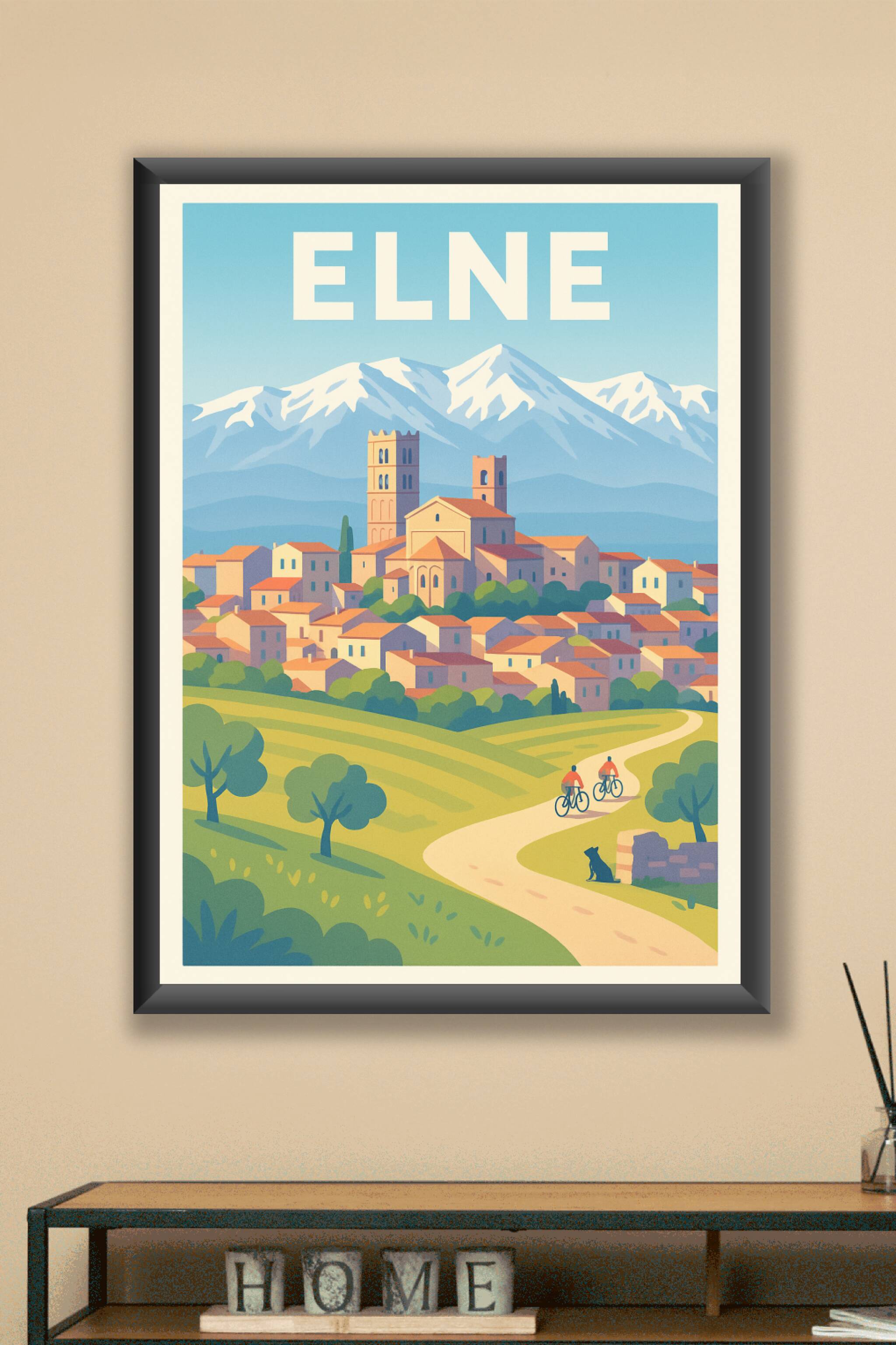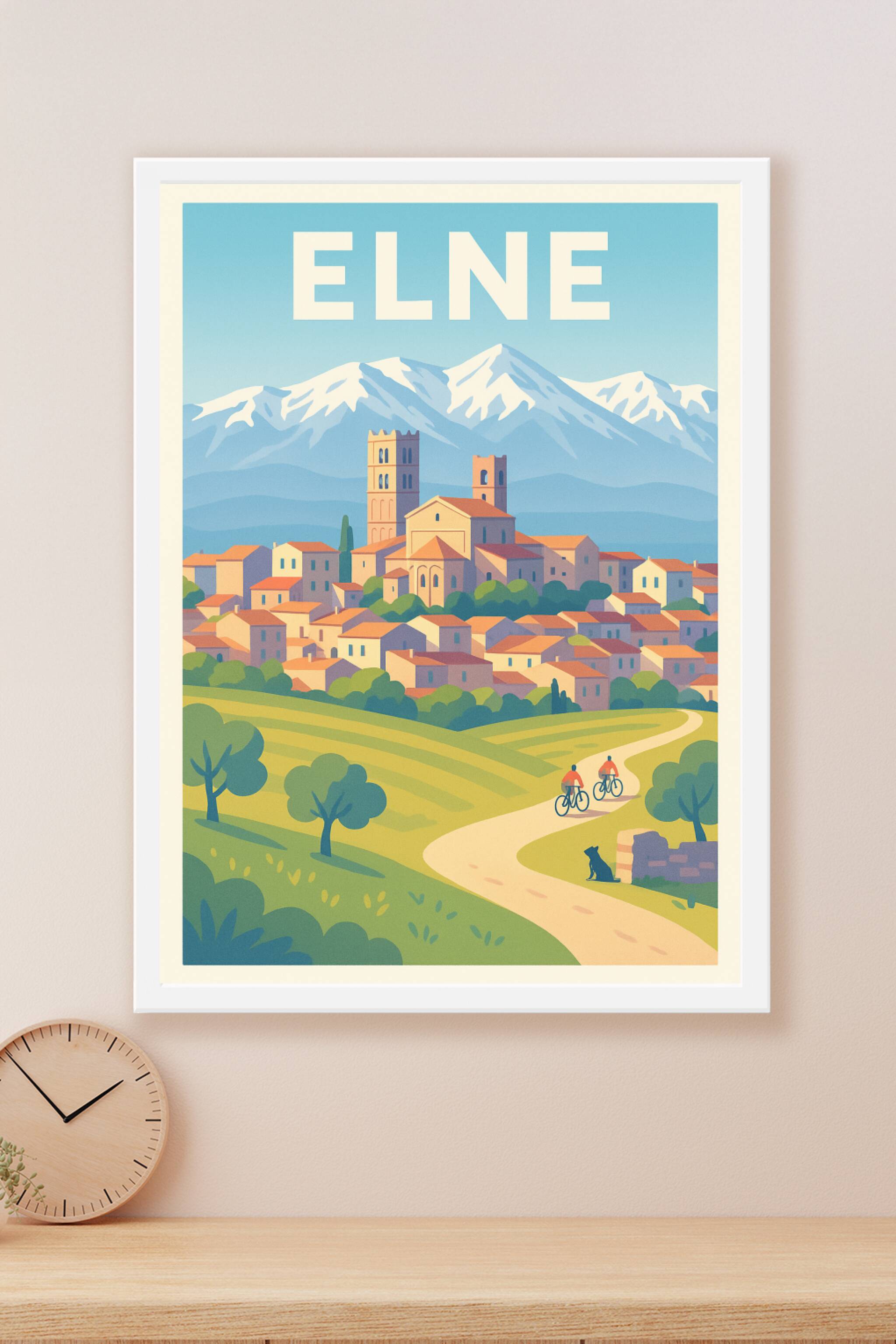 Découvrez l'élégance provençale avec cette affiche représentant la ville d'Elne nichée au pied des Pyrénées enneigées. Ce poster illustre avec poés...