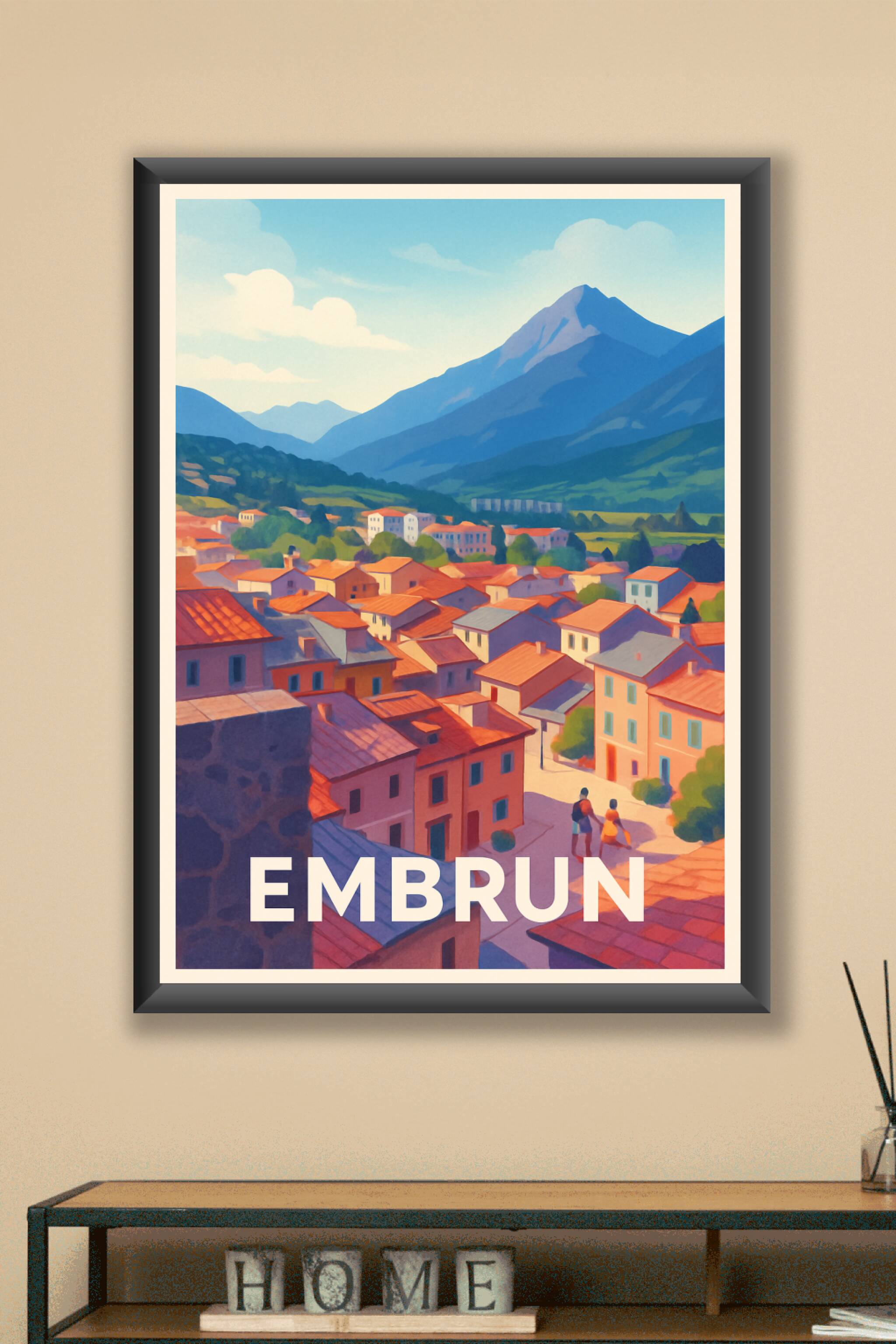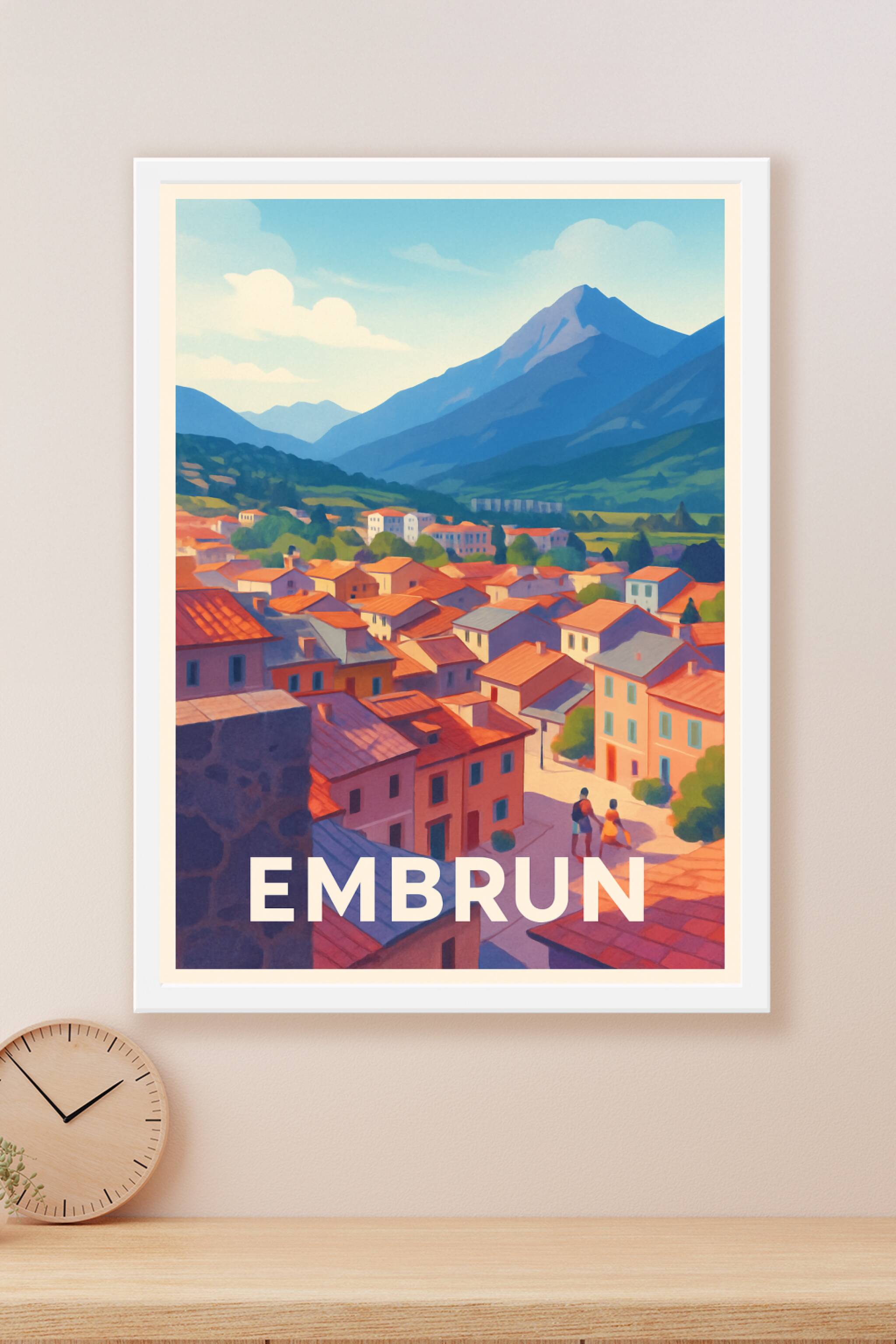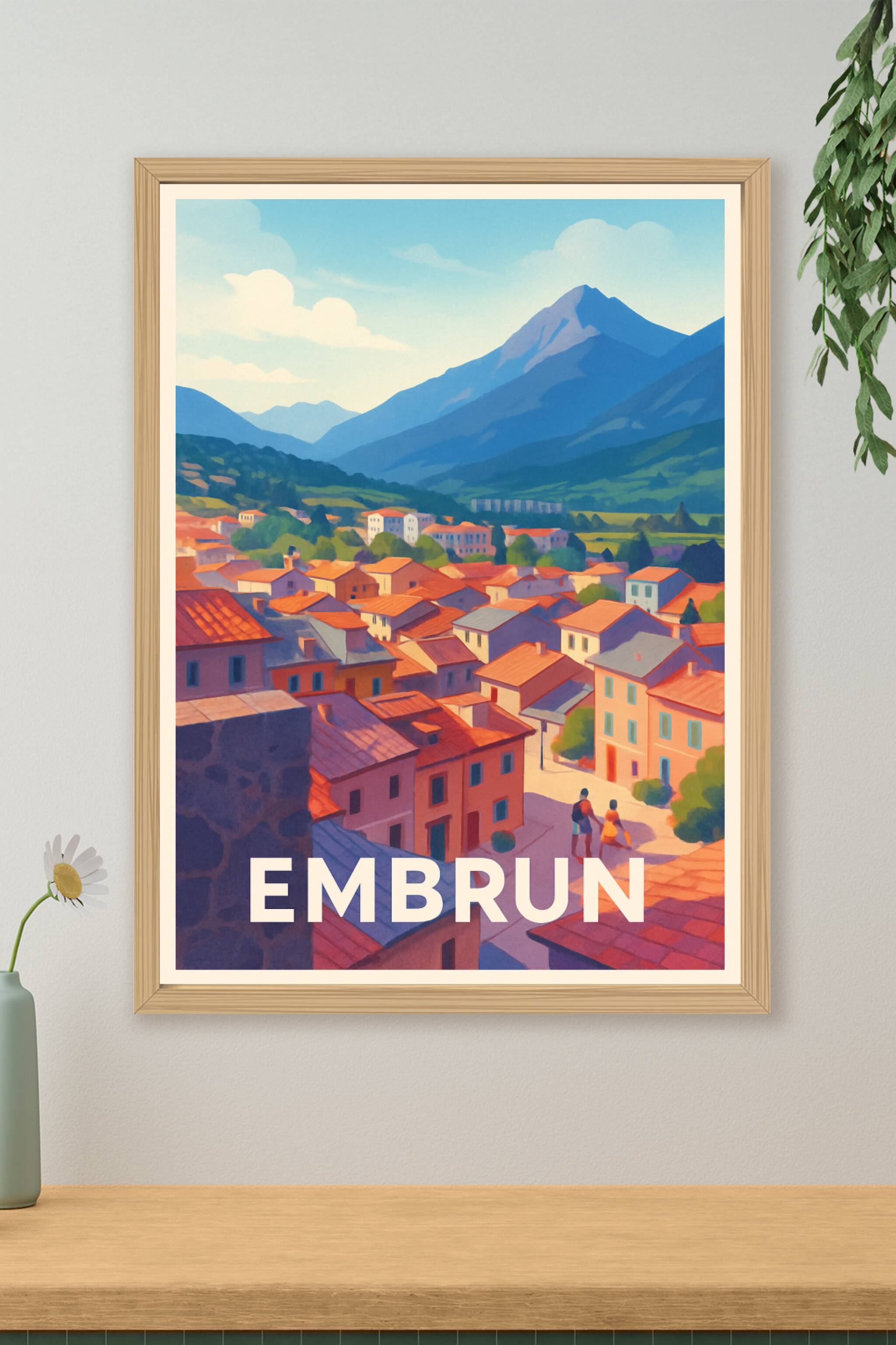 Découvrez la beauté pittoresque d'Embrun avec cette affiche illustrée qui capture le charme authentique des toits orangés baignés par la lumière do...