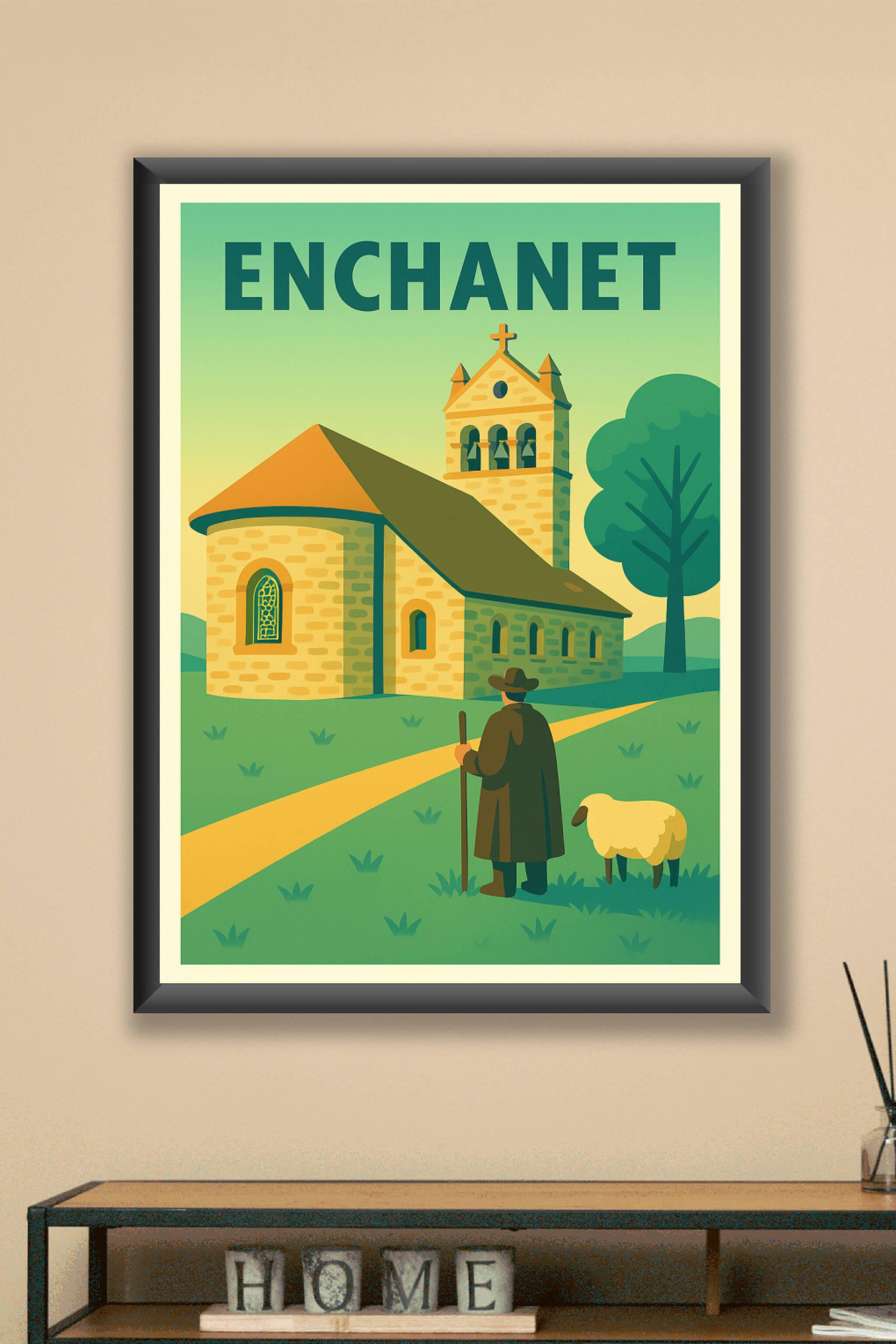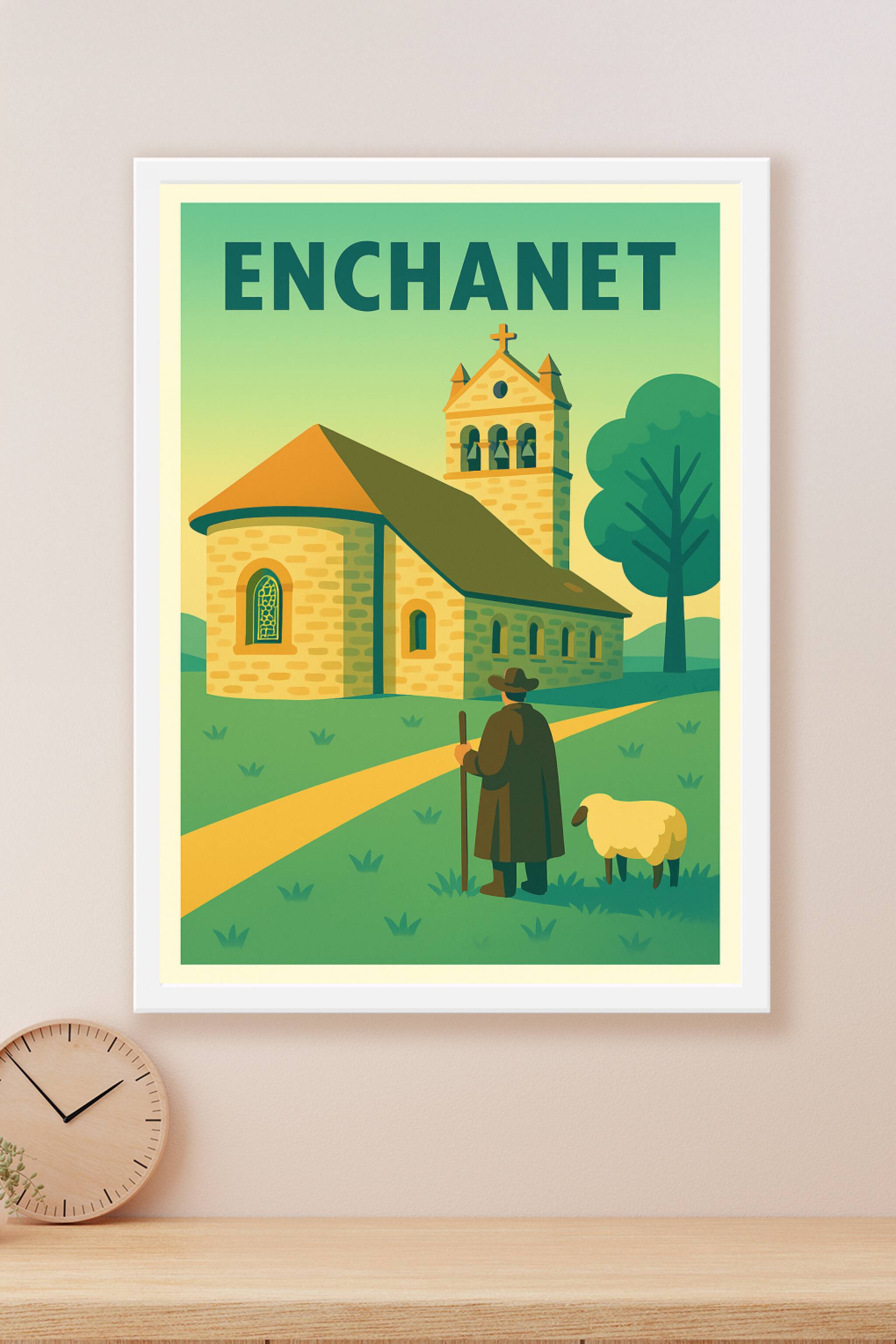 Découvrez cette affiche illustrée qui met en valeur l'église emblématique d'Enchanet dans un style épuré et doux, aux tons apaisants. Ce poster inv...