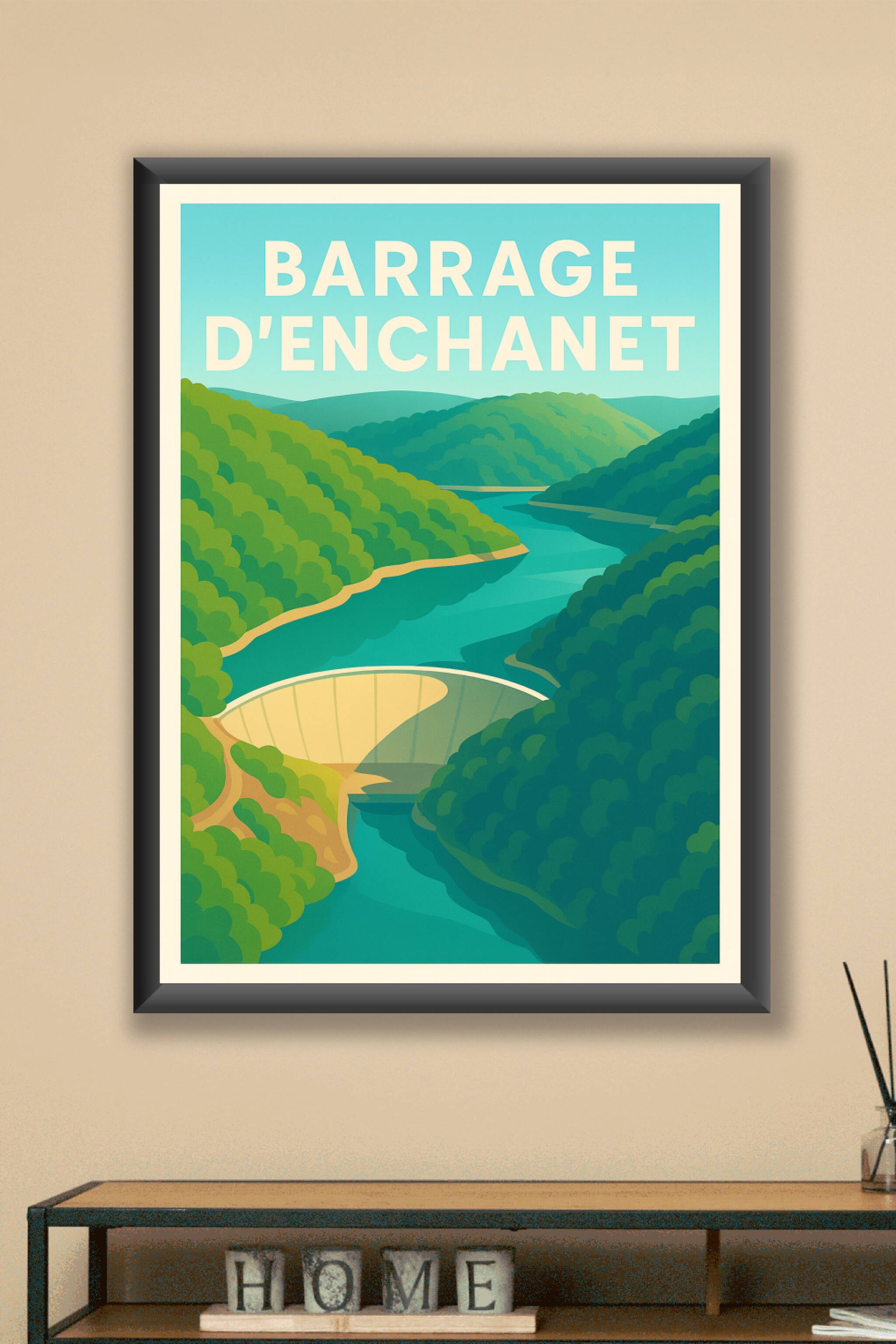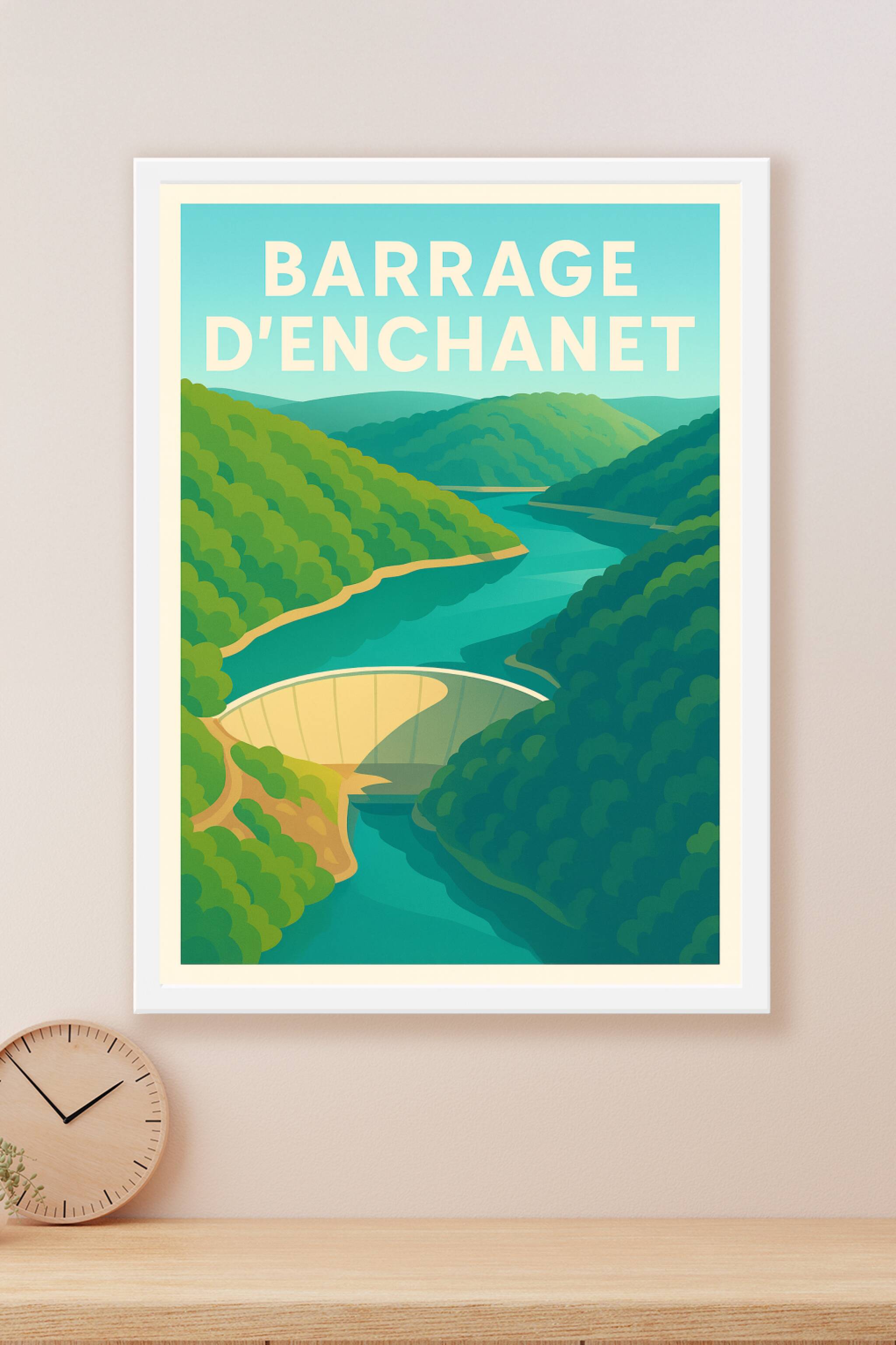 Découvrez la sérénité des paysages du Barrage d'Enchanet avec cette affiche illustrée qui capture la beauté paisible du site, entre eaux turquoises...