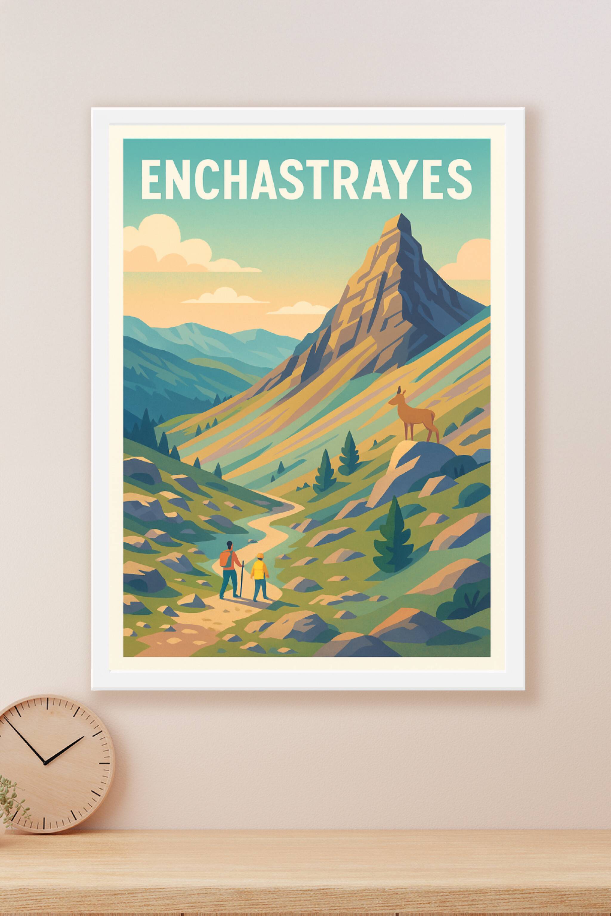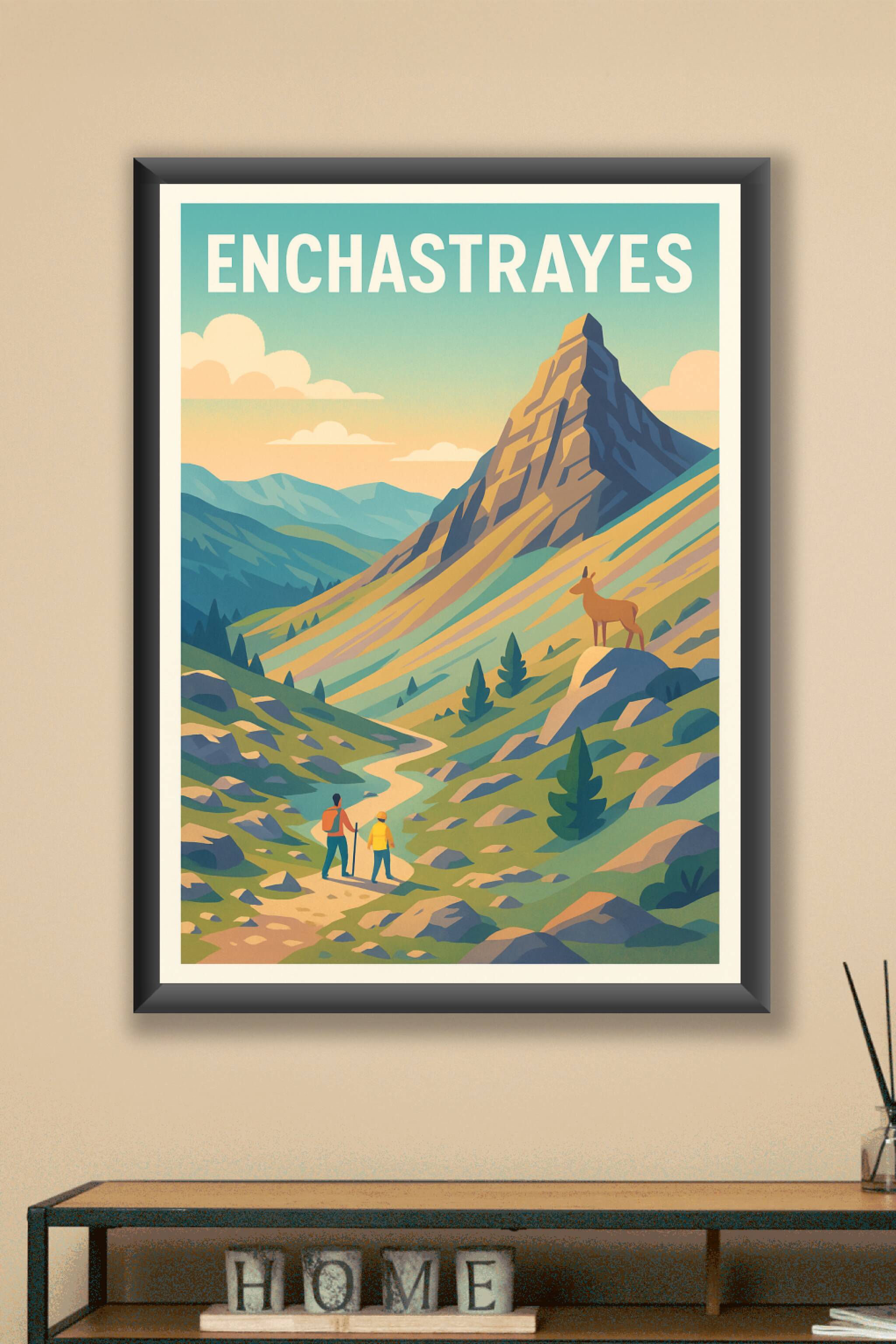 Découvrez la beauté sauvage et apaisante d'Enchastrayes avec cette affiche illustrée au style vintage et coloré. Cette scène de randonnée au milieu...