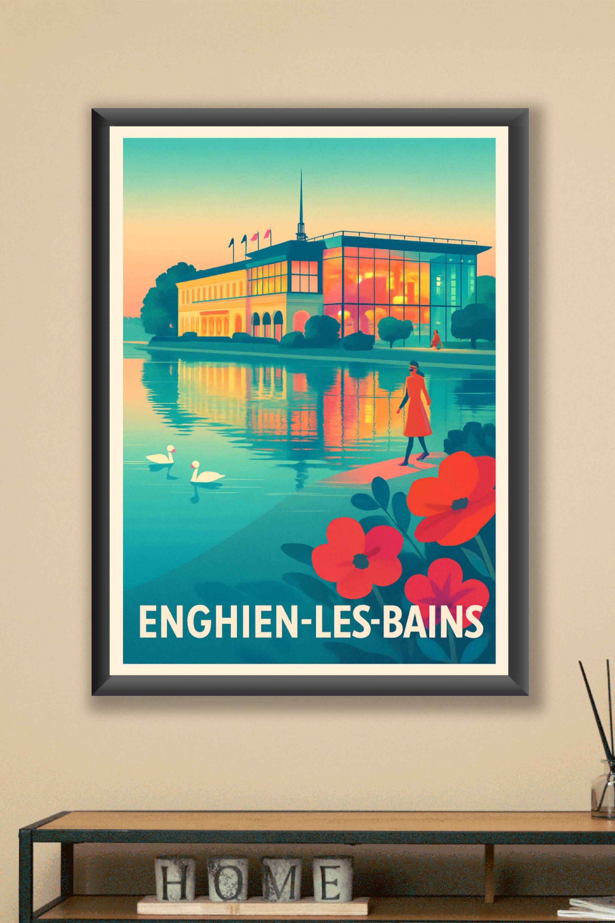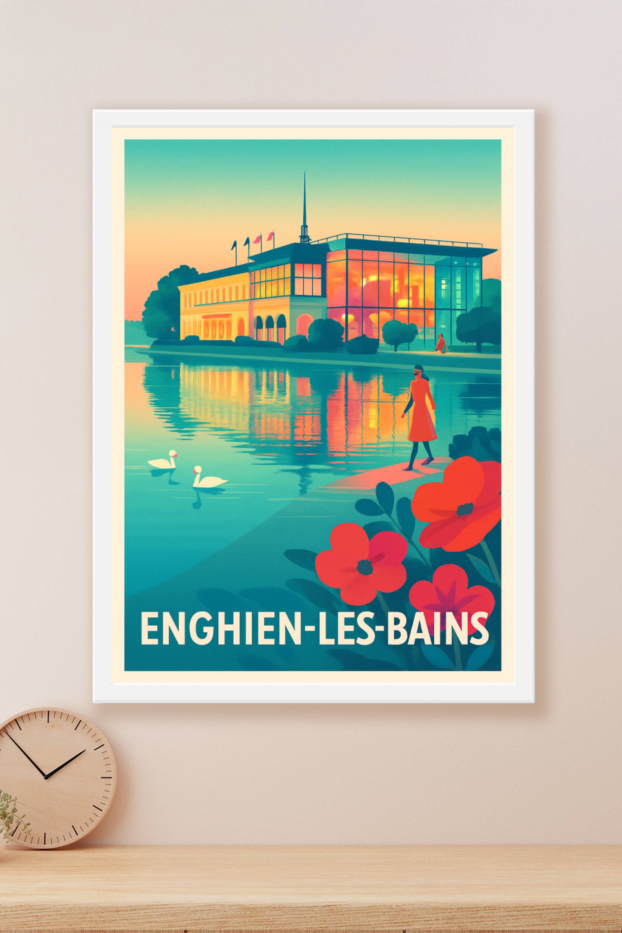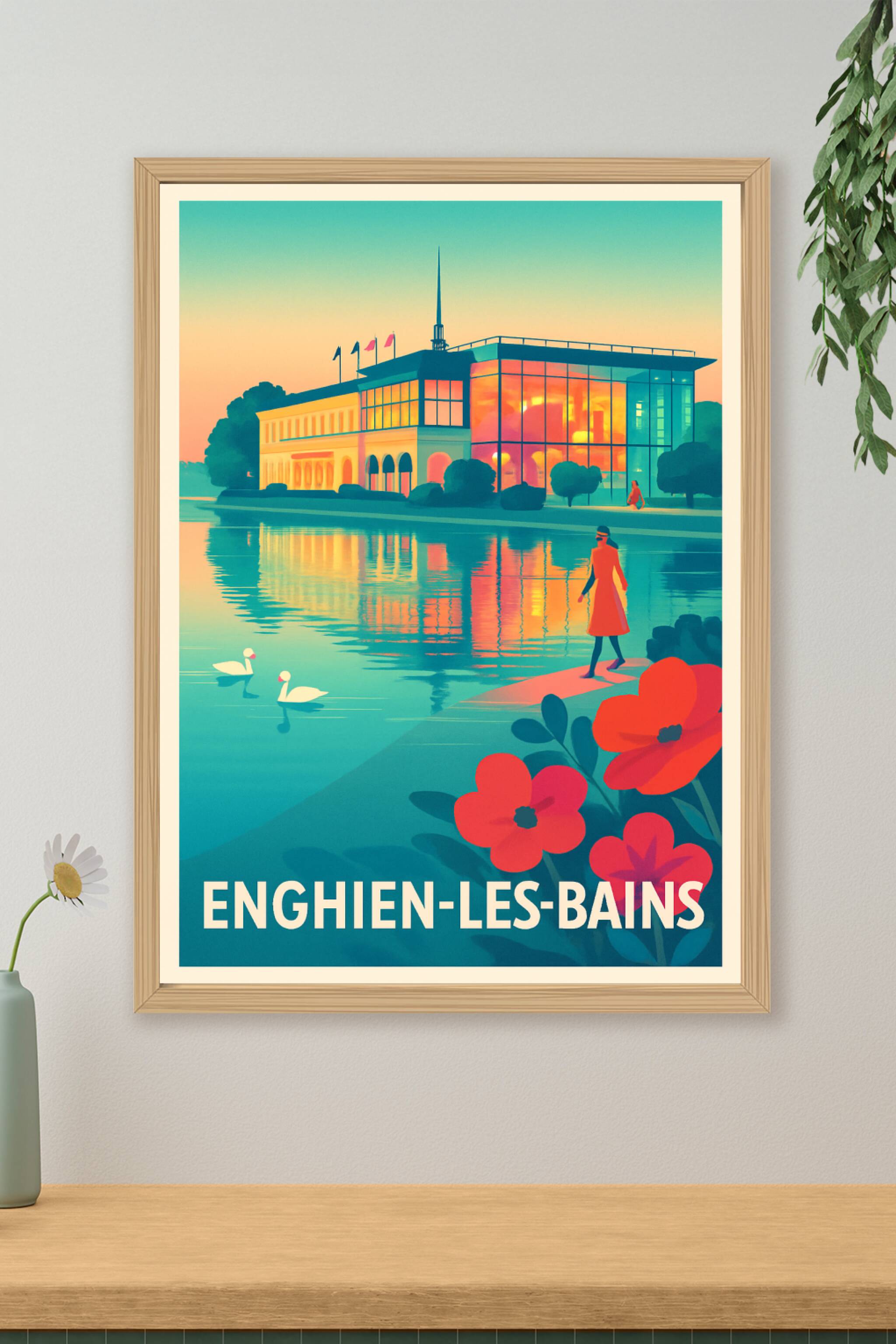 Découvrez la douceur et le charme paisible d'Enghien-les-Bains avec cette affiche au style vintage et coloré, mettant en valeur le célèbre casino e...