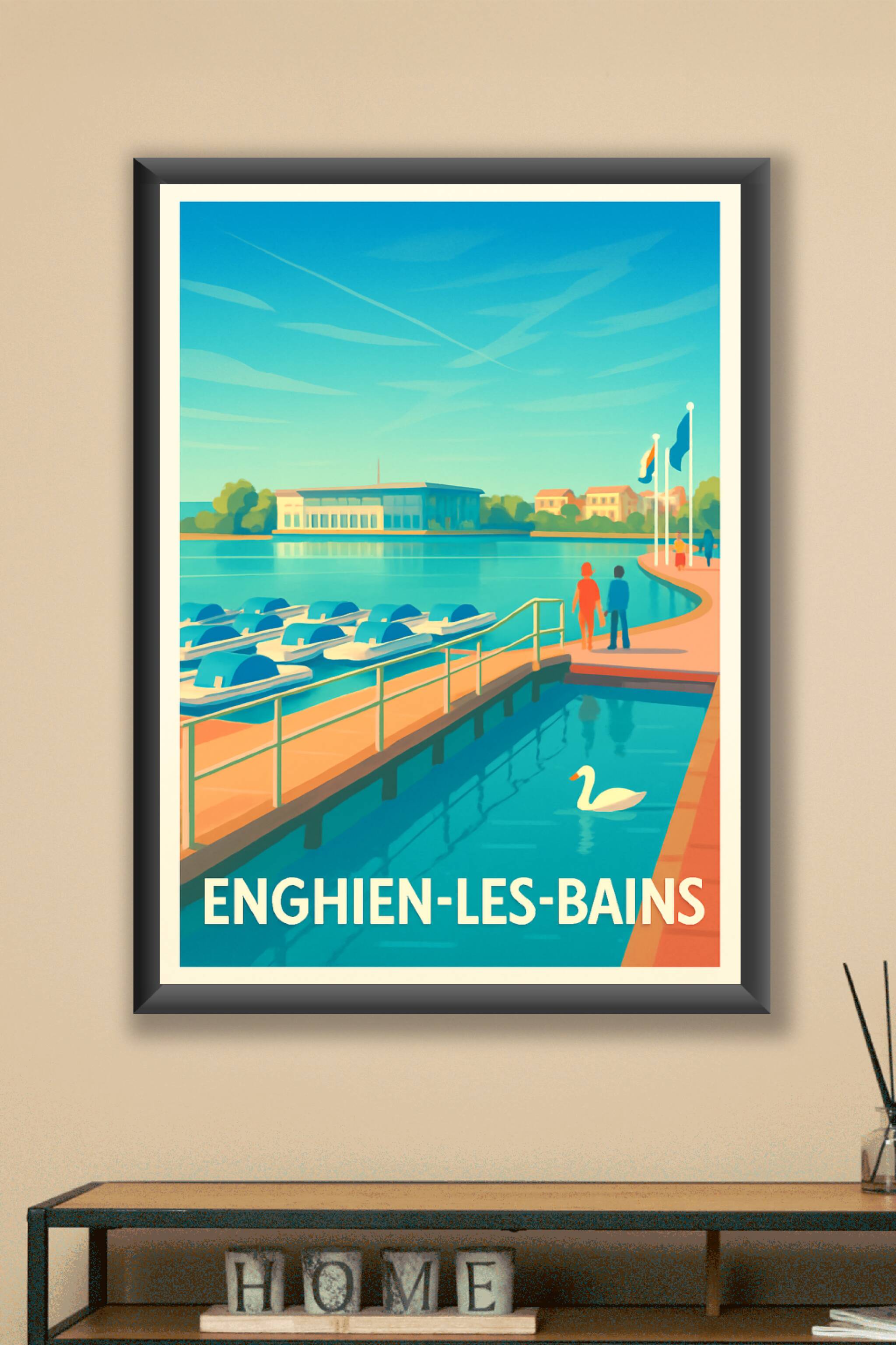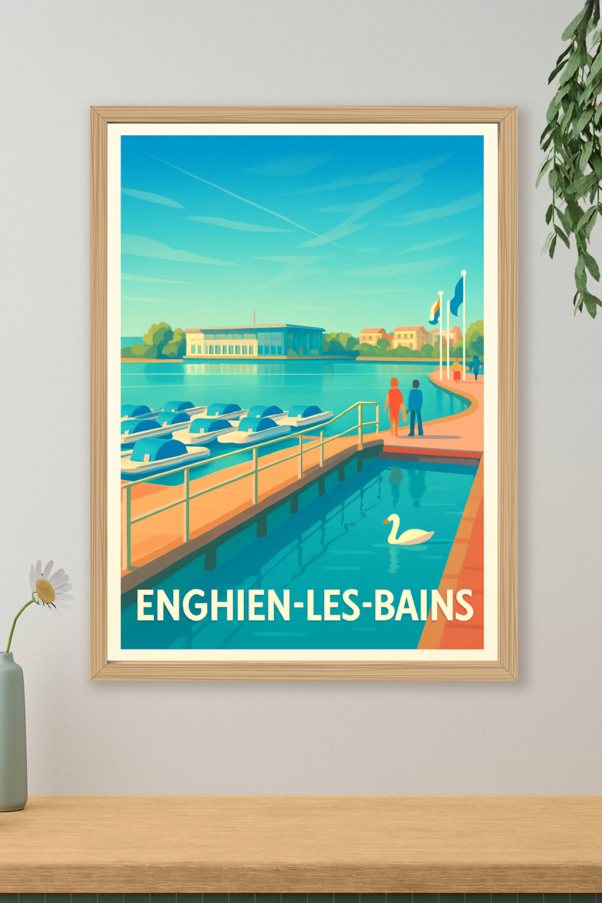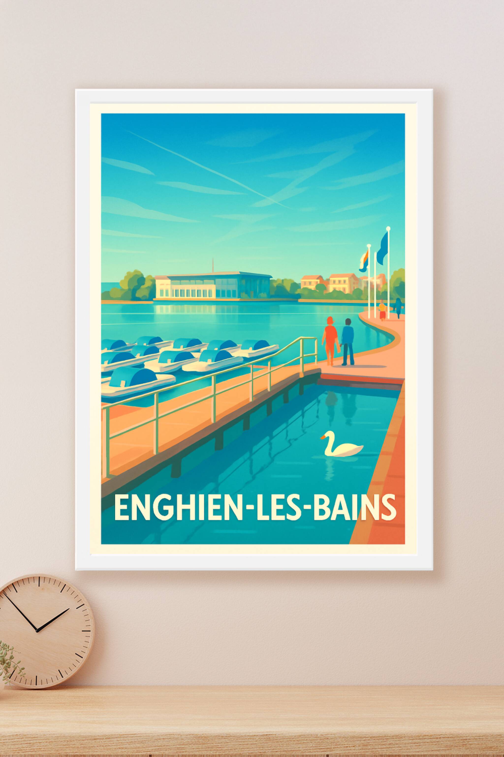 Découvrez l'élégance paisible d'Enghien-les-Bains à travers cette affiche au style vintage moderne. Le célèbre lac et son embarcadère, avec ses péd...