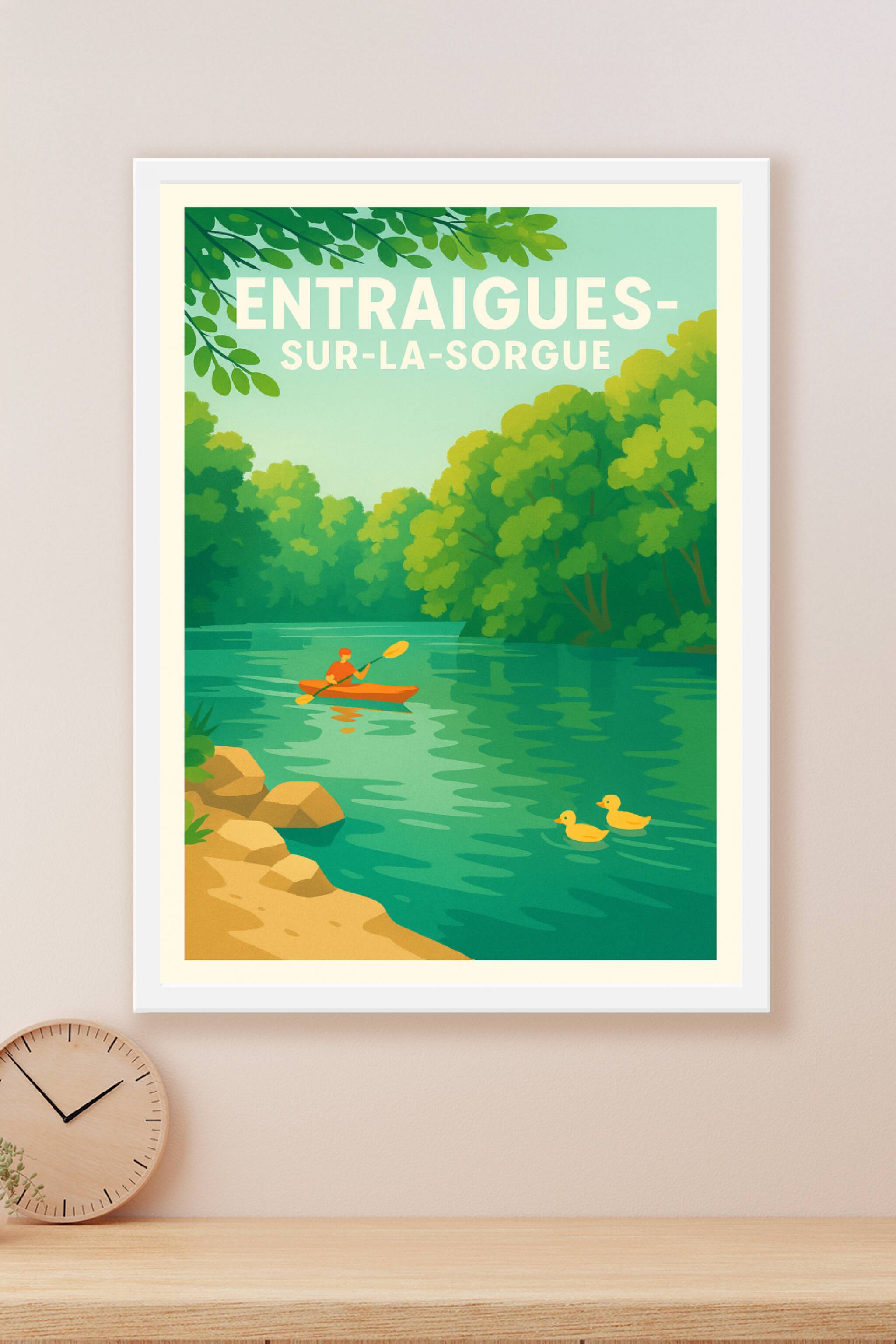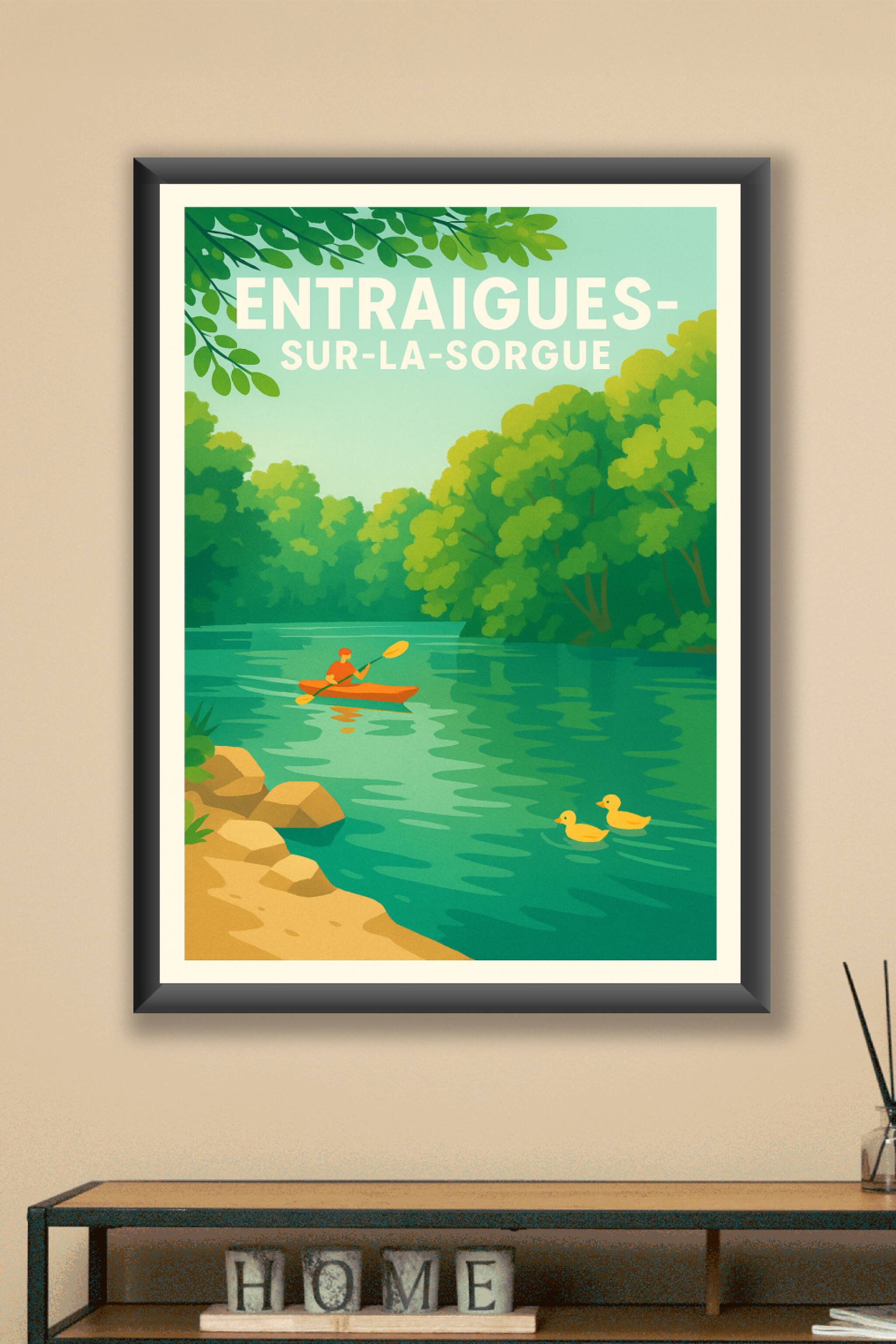Découvrez la sérénité d'Entraigues-sur-la-Sorgue avec cette affiche illustrée qui met en scène une paisible balade en kayak sur la rivière, entourée d'une végétation luxuriante et d'une ambiance apaisante. Ce poster invite à l'évasion et au calme, parfait pour apporter une touche de nature à votre décoration intérieure. Imprimée en tirage "Fine Art" sur un papier 305g coton de haute qualité, cette affiche bénéficie d'une finition d'exception et d'une impression précise et éclatante. Disponible en formats A1 à A4, avec ou sans cadre, cette création unique sublimera votre intérieur ou fera un cadeau raffiné aux amoureux de la Provence.