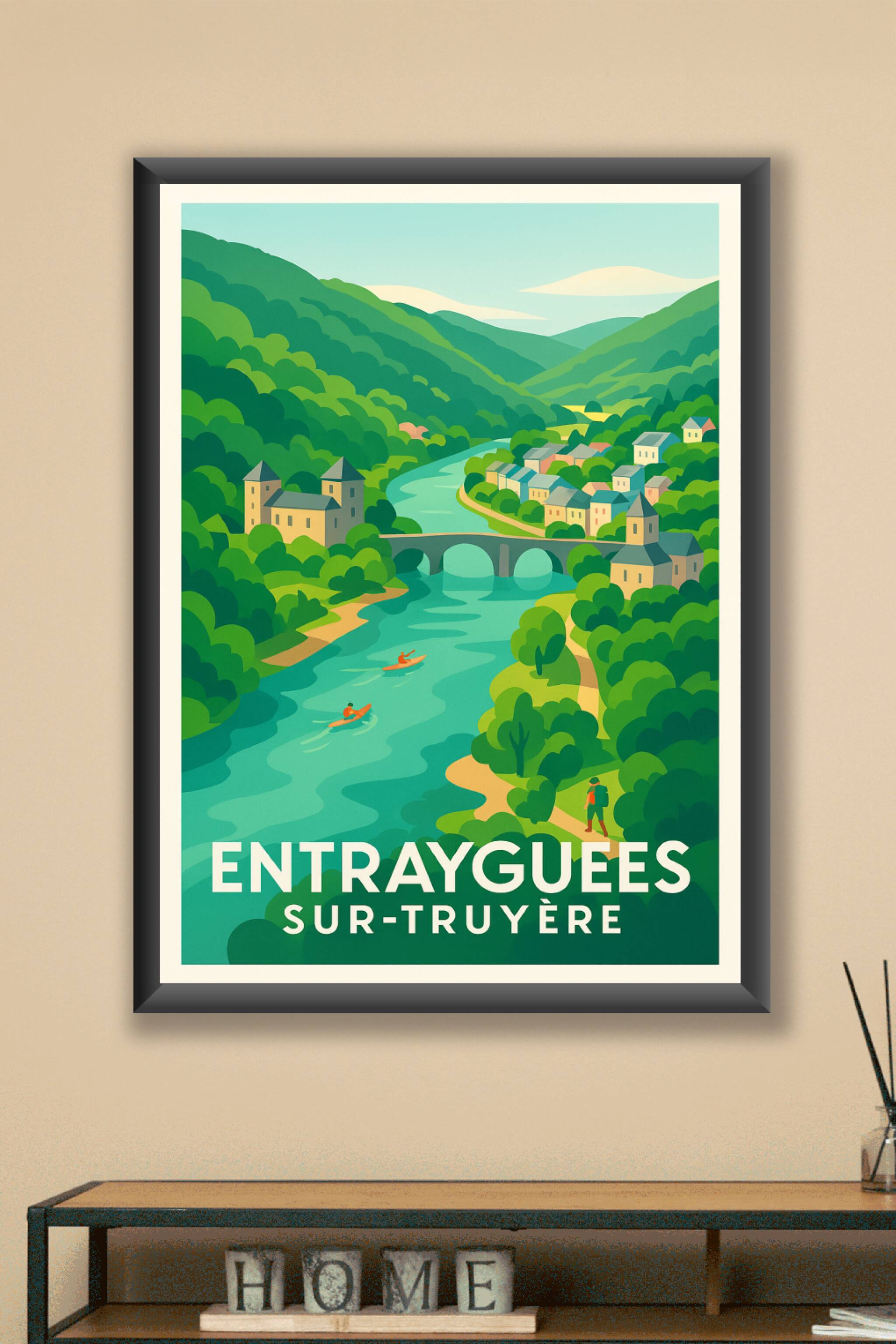 Découvrez la beauté apaisante d'Entraygues-sur-Truyère avec cette affiche au style graphique épuré, mettant en scène ses collines verdoyantes, son ...