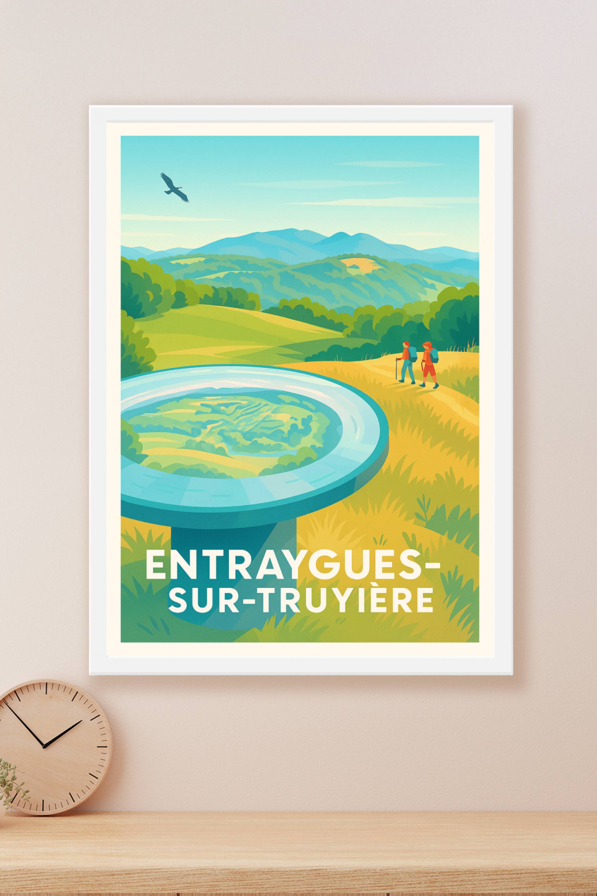 Découvrez l'ambiance paisible et verdoyante d'Entraygues-sur-Truyère à travers cette affiche au style rétro moderne. La vue panoramique sur les col...