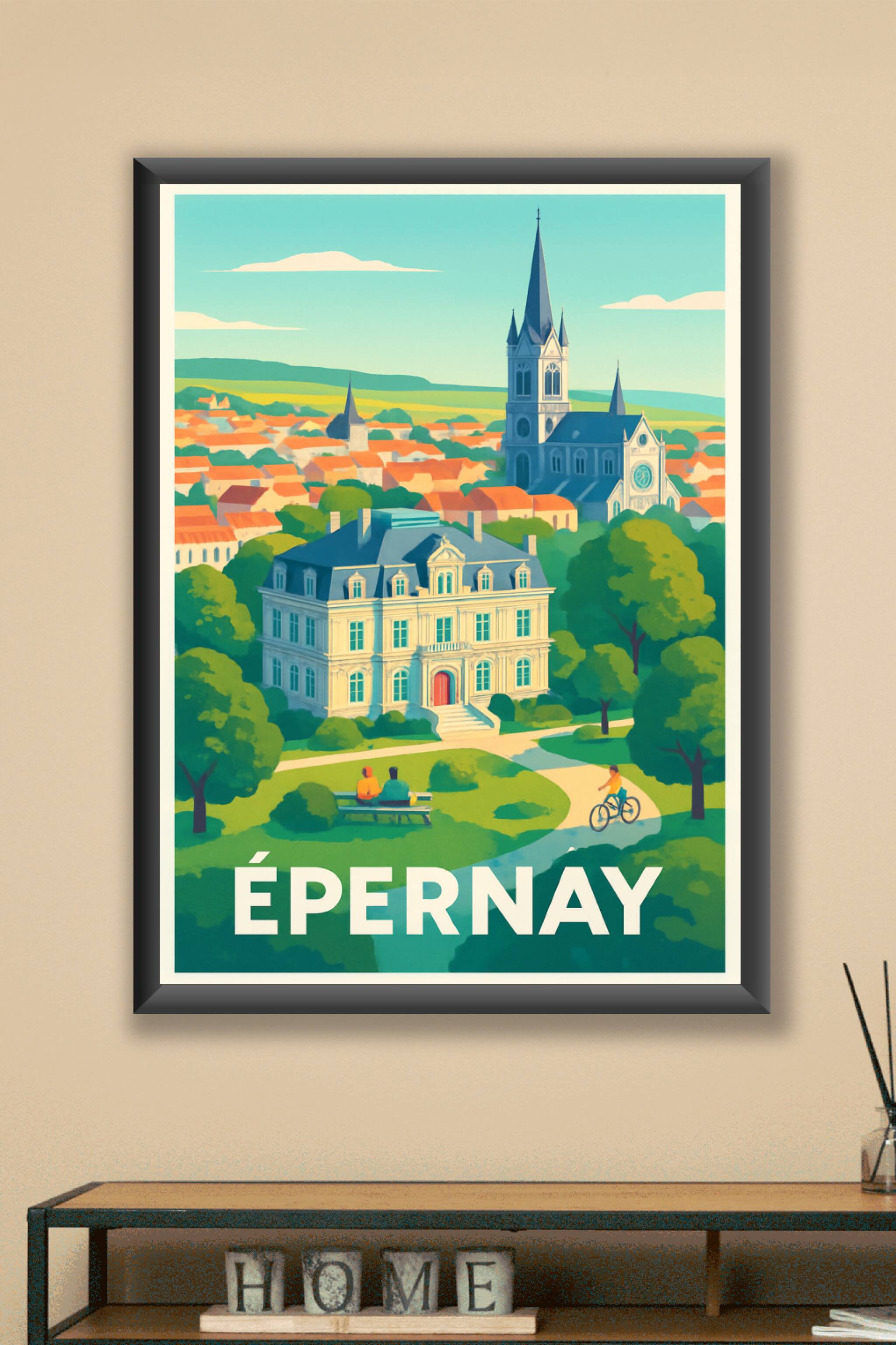 Découvrez la douceur de vivre d'Épernay à travers cette affiche illustrée mettant en scène ses bâtiments emblématiques et son cadre verdoyant, parf...