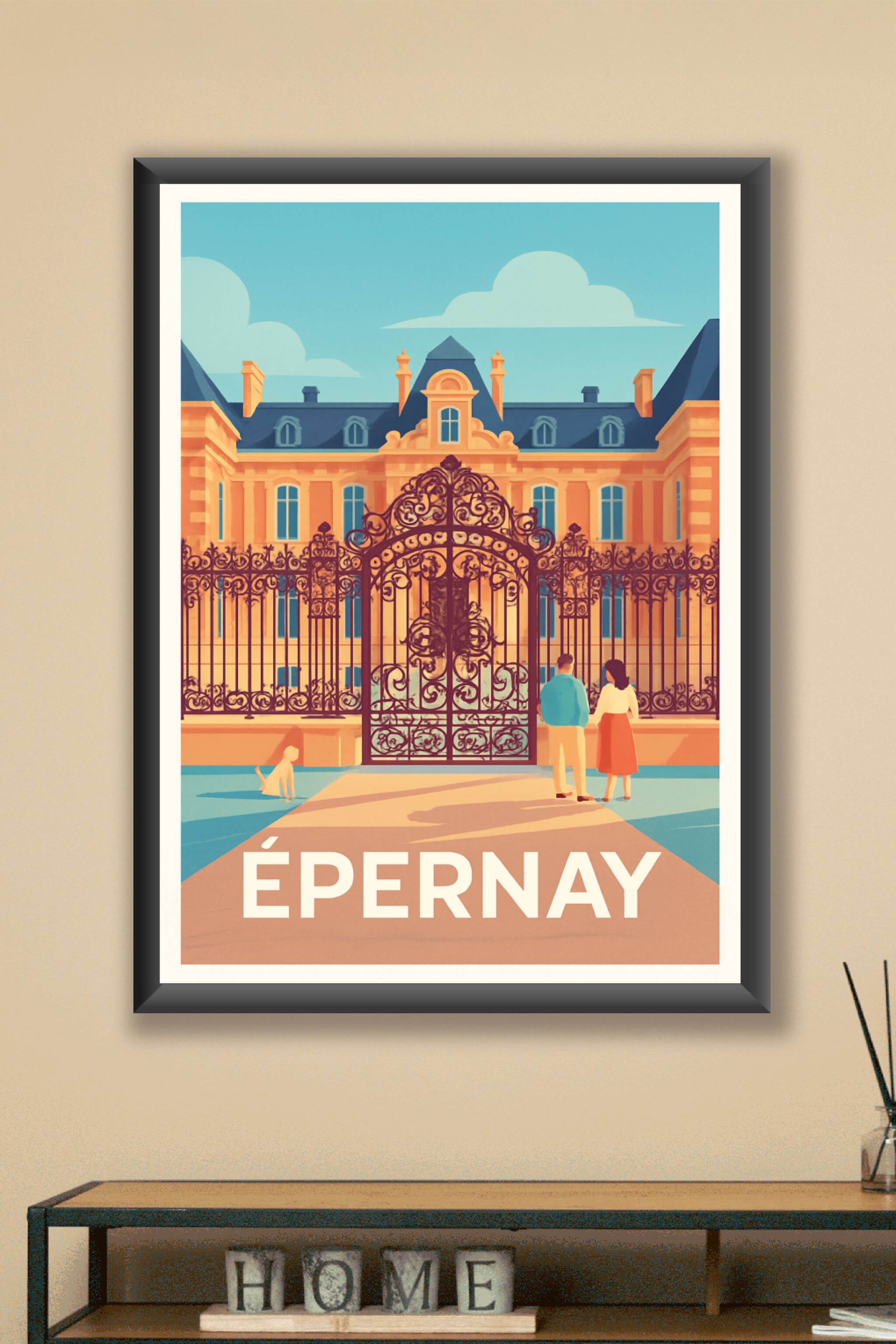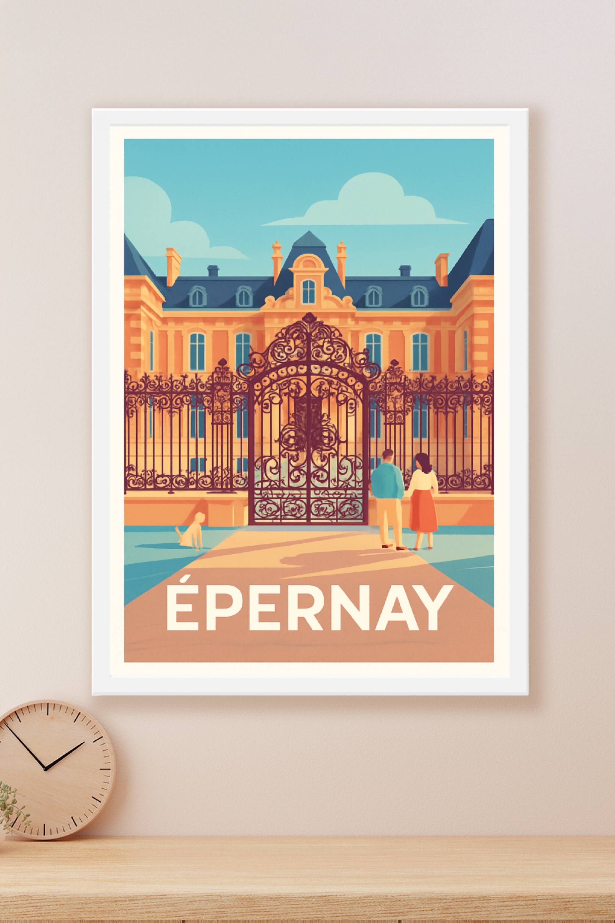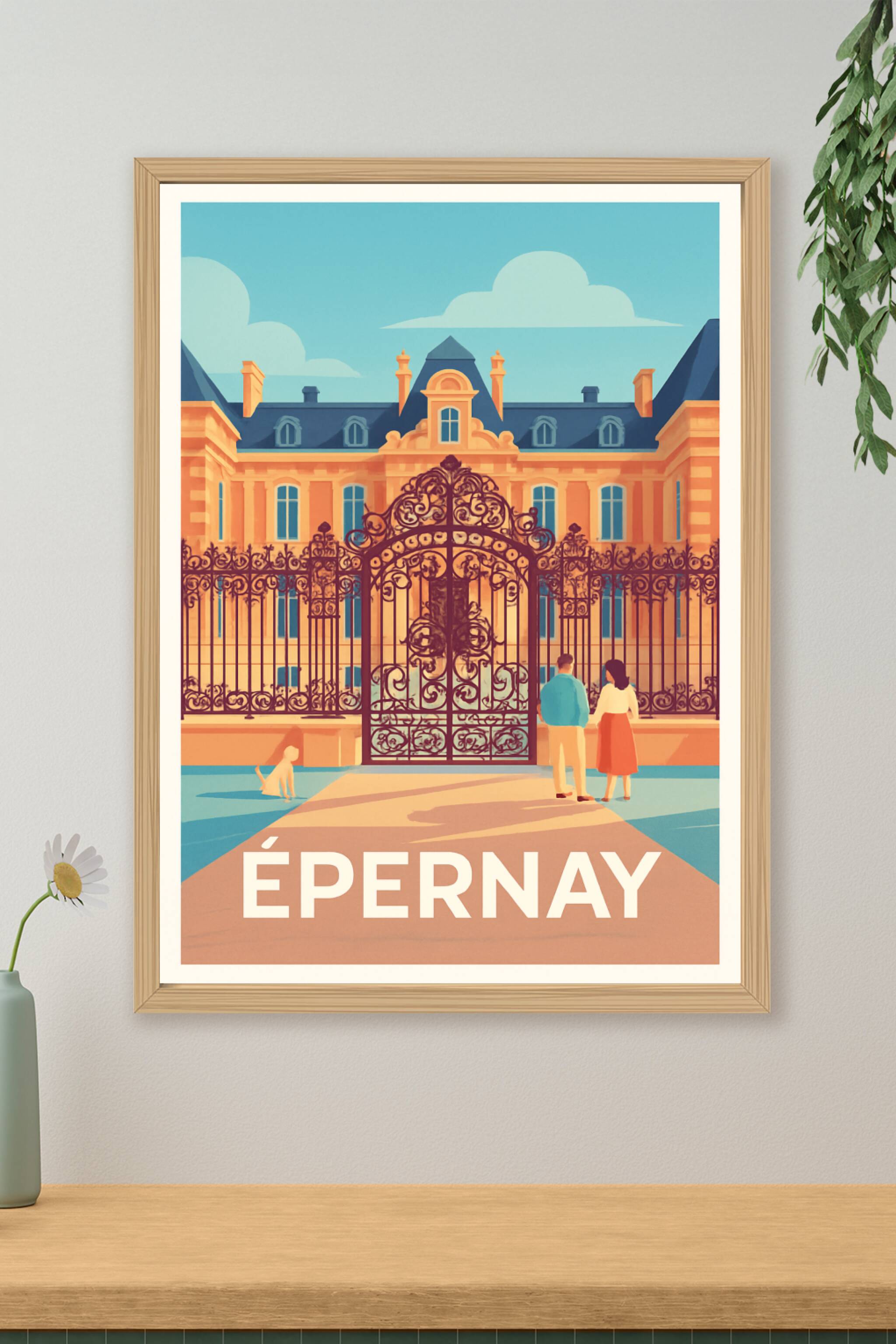 Découvrez la beauté raffinée d'Épernay à travers cette affiche illustrée mettant en scène une demeure emblématique et son portail orné de ferronner...