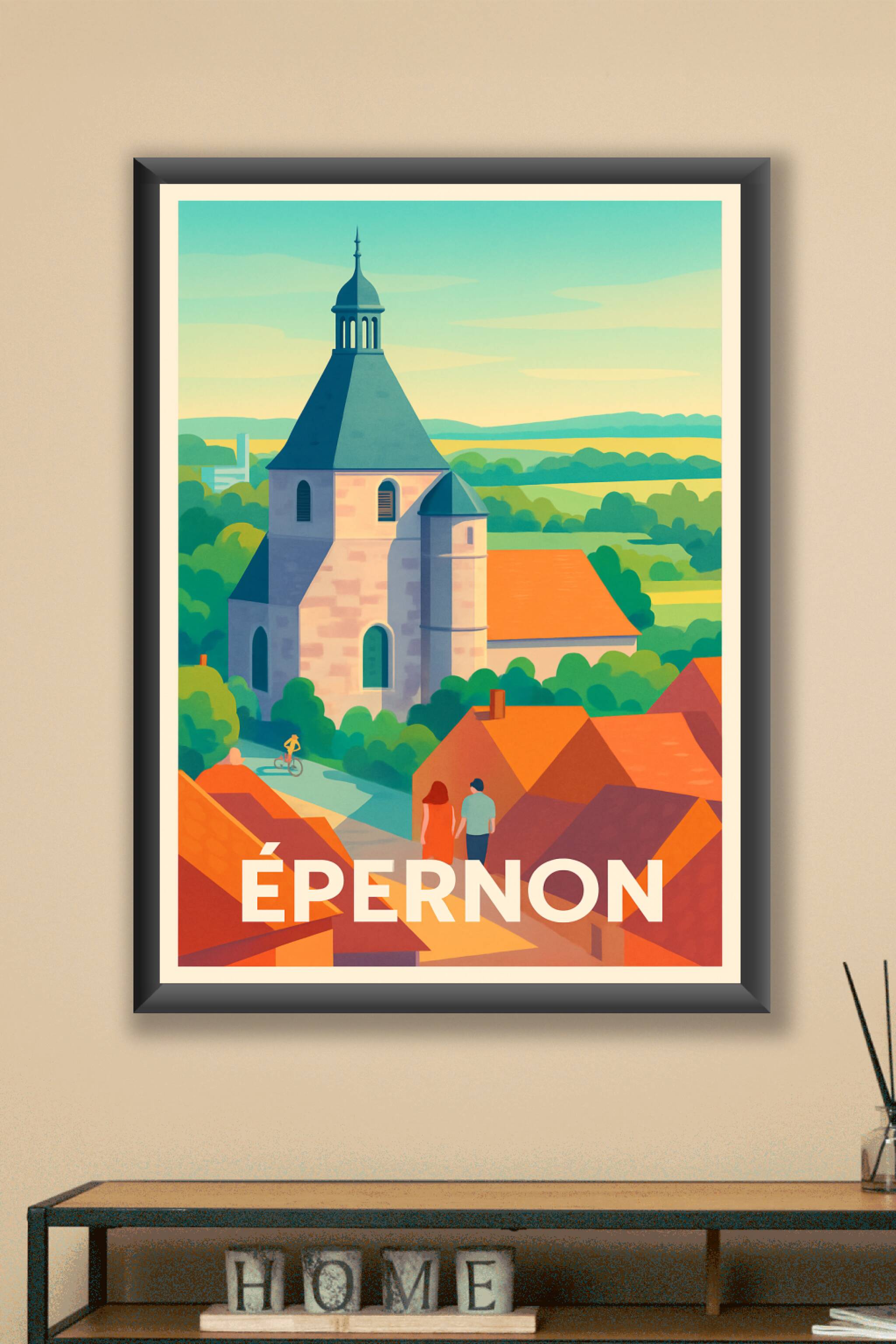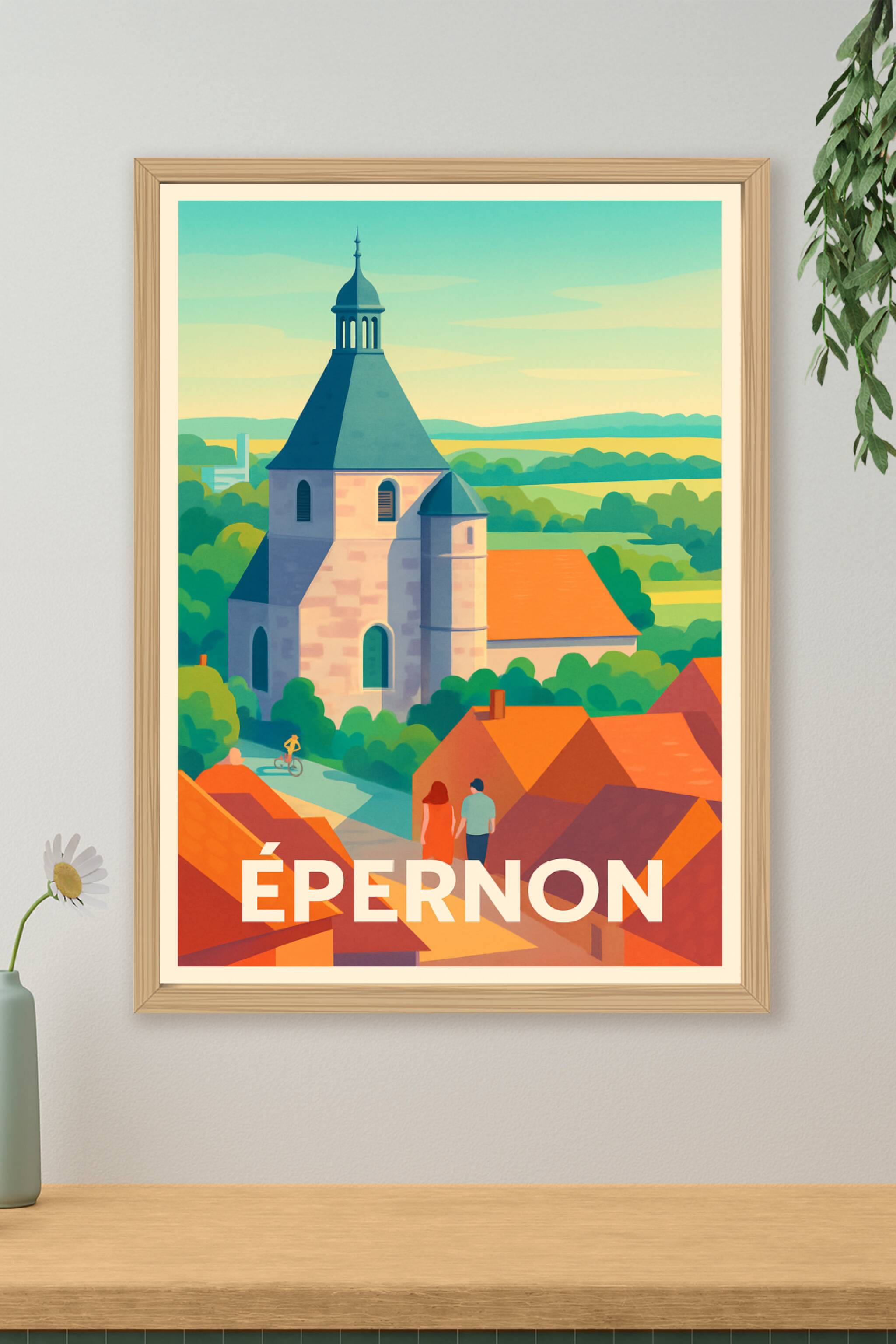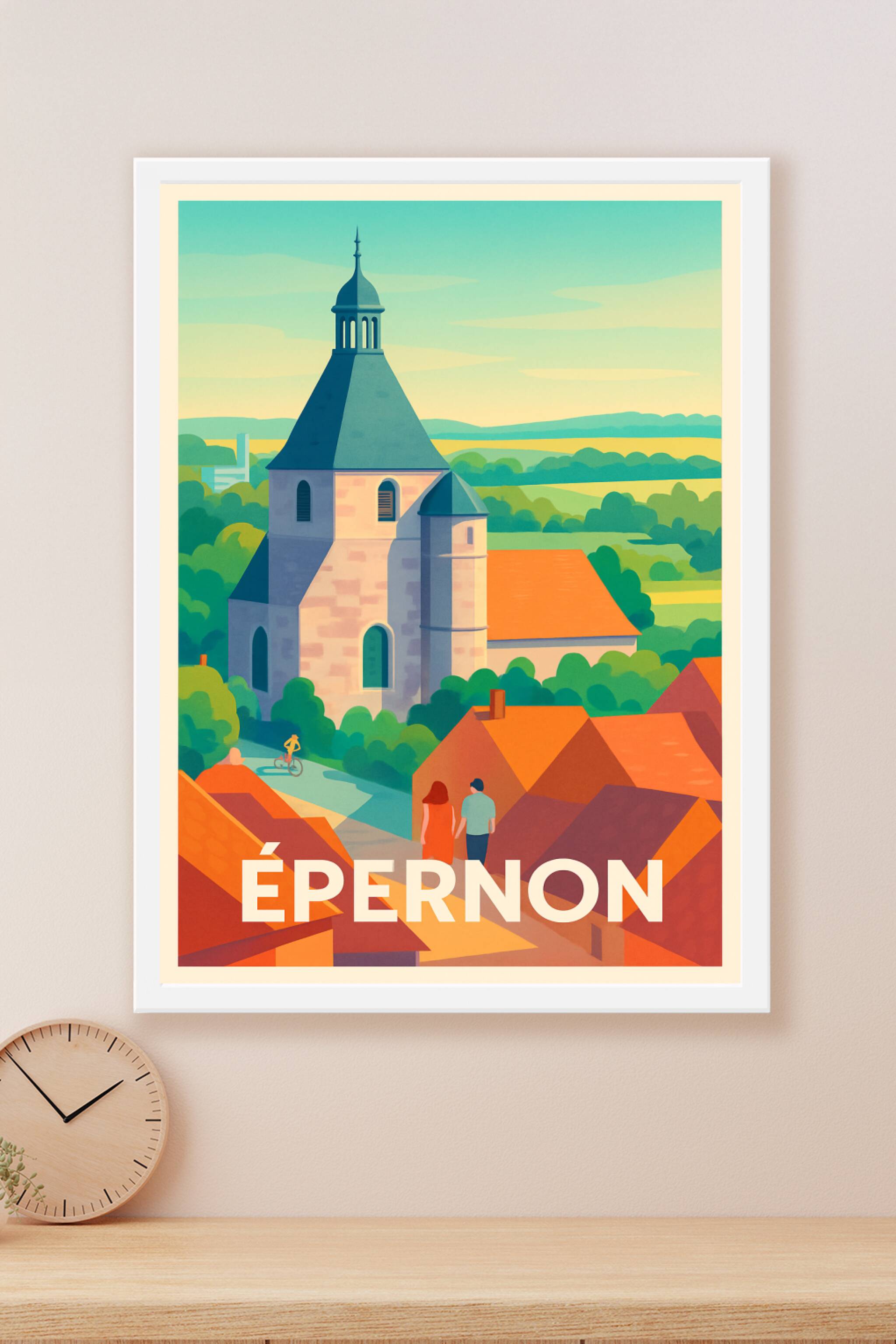 Découvrez le charme paisible d'Épernon avec cette affiche au style vintage, mettant en avant ses toits chaleureux et son église emblématique. Ce po...