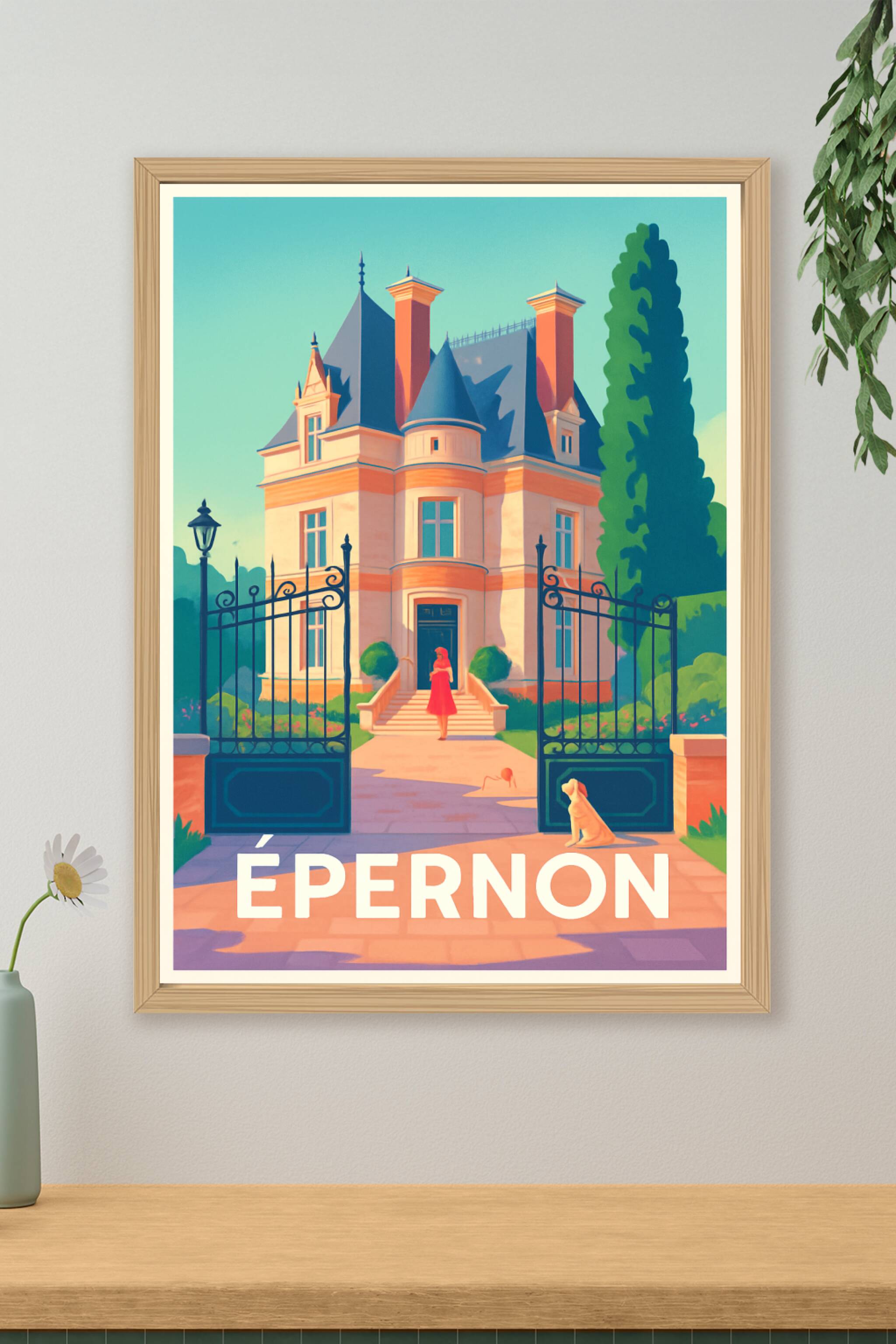 Apportez une touche de raffinement et de sérénité dans votre intérieur avec cette affiche illustrant un élégant château d'Épernon, baigné par une douce lumière estivale. L’image met en scène une atmosphère paisible avec une figure féminine au pied des escaliers et un chien observant les alentours, soulignant le cadre paisible et accueillant de cette ville historique. Ce poster est proposé en tirage "Fine Art" sur un papier 305g coton de haute qualité pour garantir des couleurs éclatantes et une durabilité optimale. Disponible en formats A1 à A4, avec ou sans cadre, cette affiche sera un atout décoratif parfait pour votre maison ou un cadeau idéal pour les amoureux de la région. La qualité d'impression premium, 100% fabriquée en France, sublime chaque détail de cette scène emblématique d'Épernon.