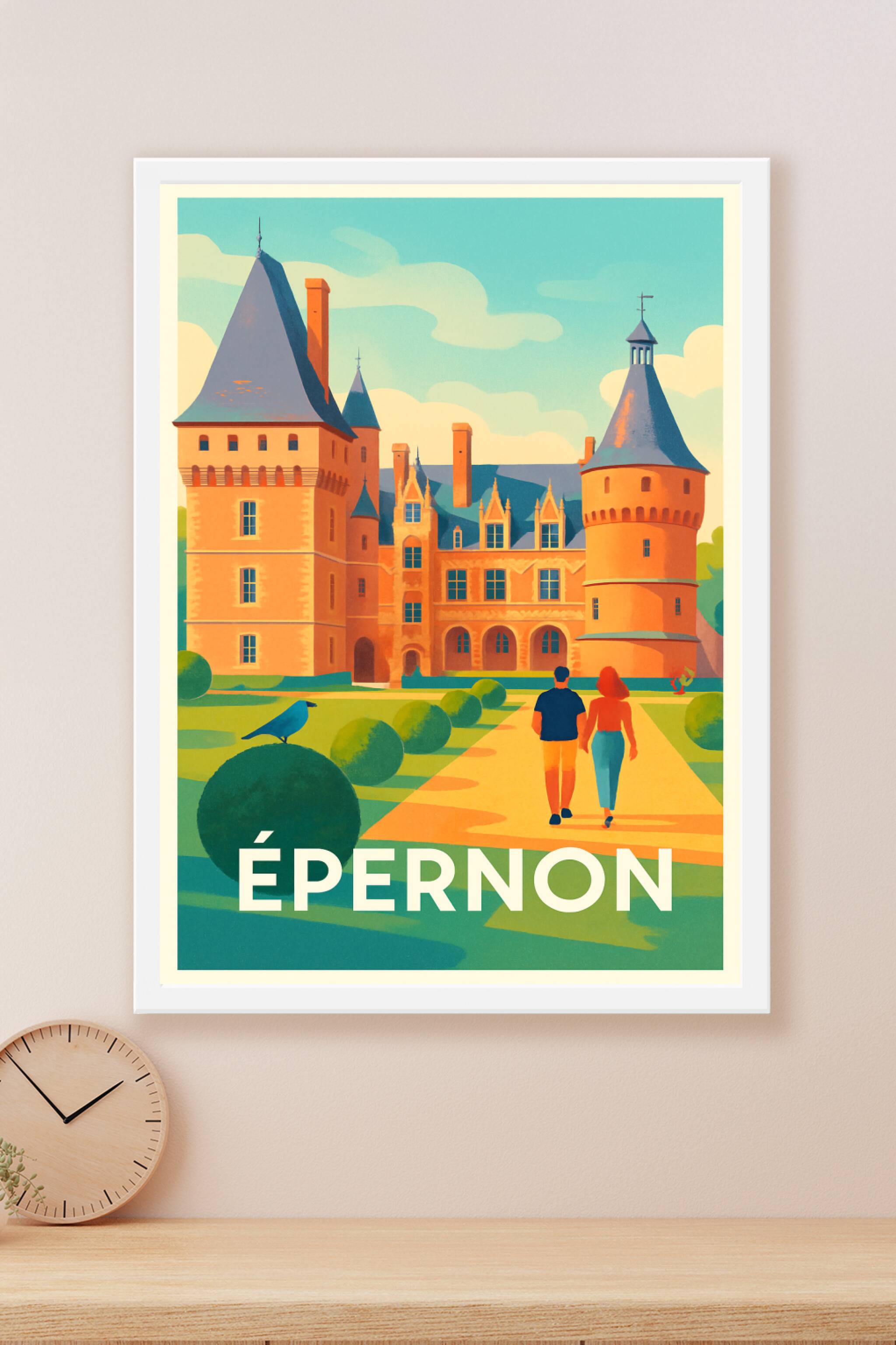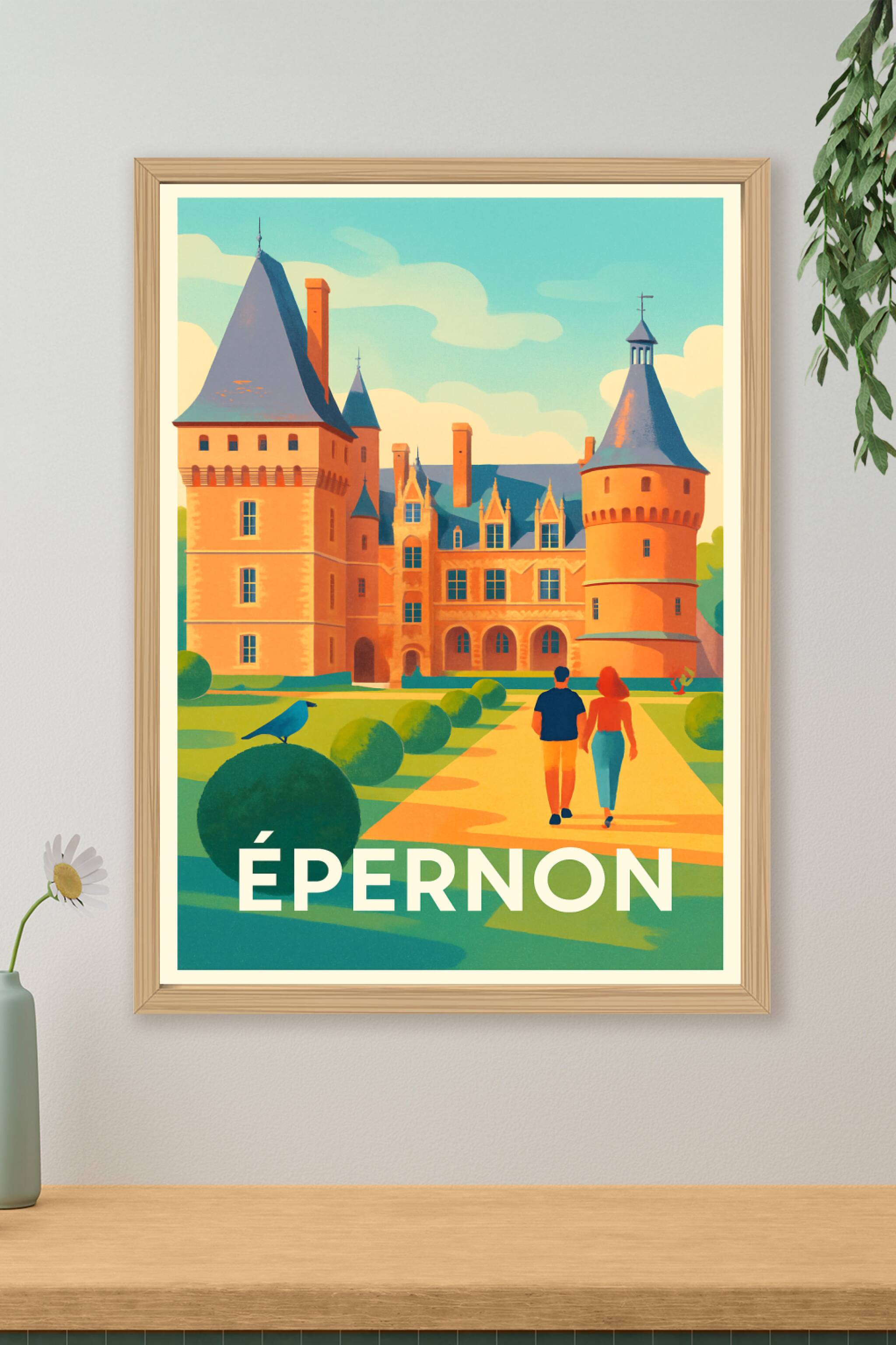 Découvrez le charme intemporel d'Épernon avec cette affiche illustrée mettant en scène le magnifique château de la ville dans une ambiance lumineus...