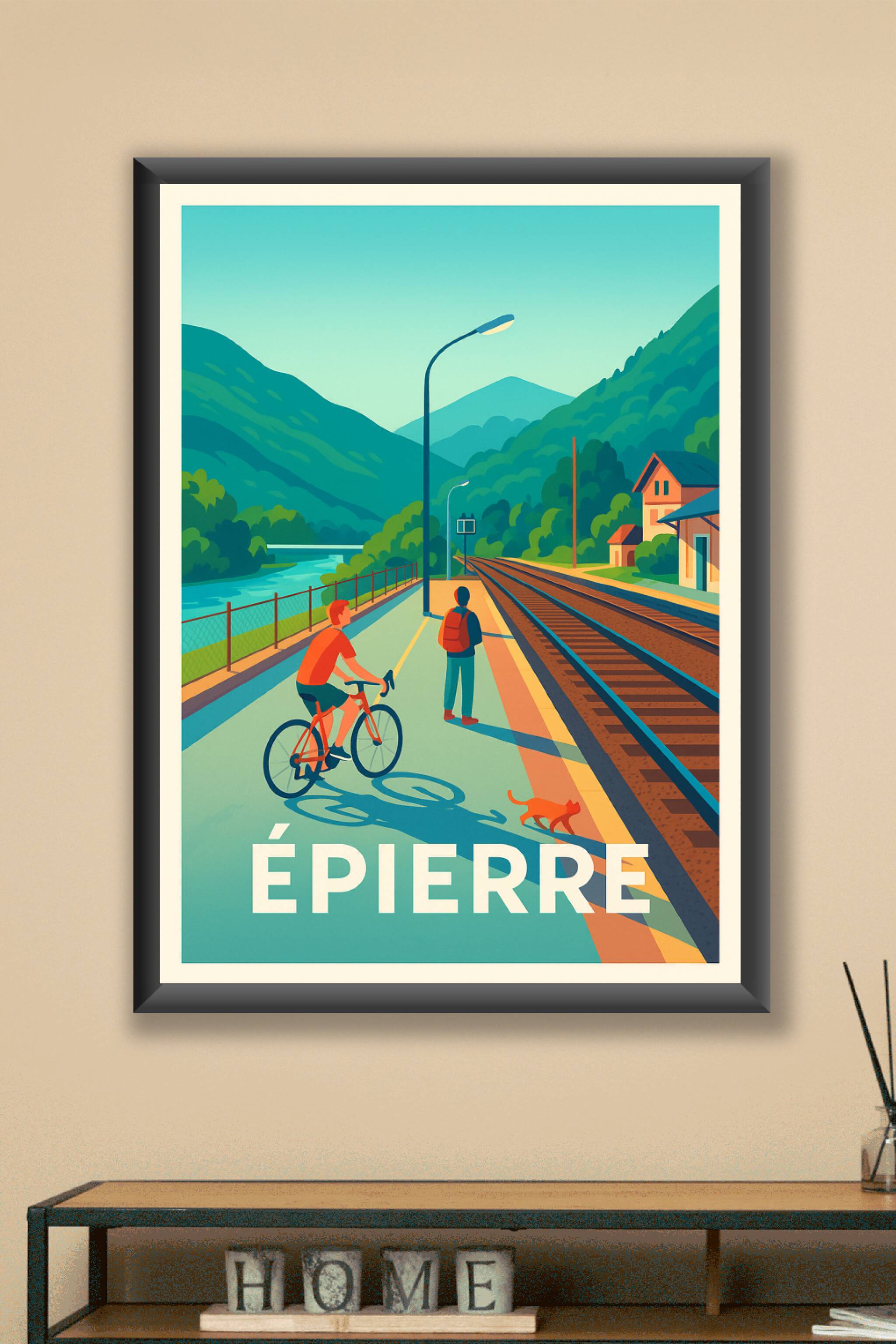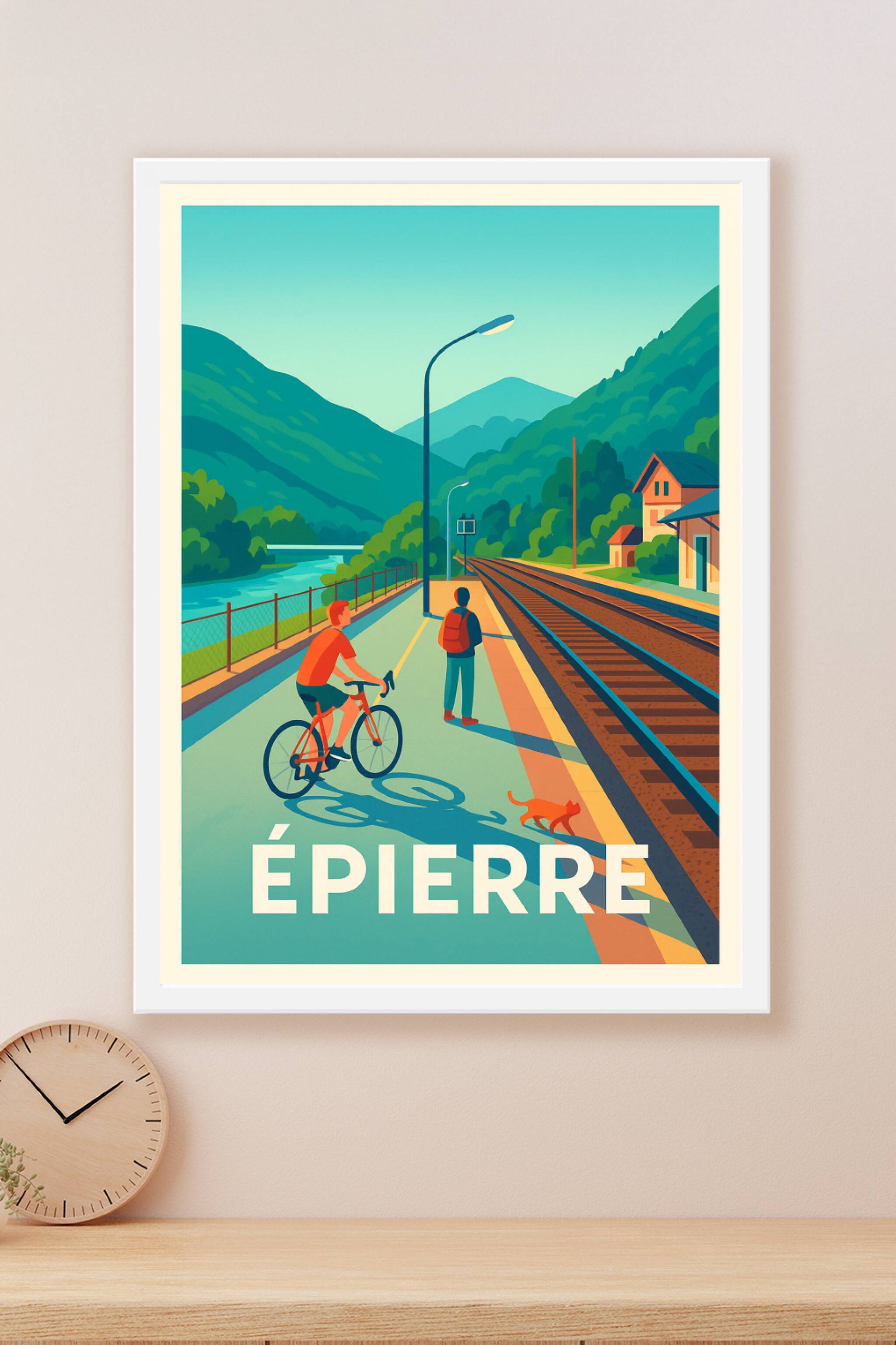Découvrez la douceur d'une halte à la gare d'Épierre avec cette affiche au style vintage aux couleurs chaudes et apaisantes. Le poster illustre un ...