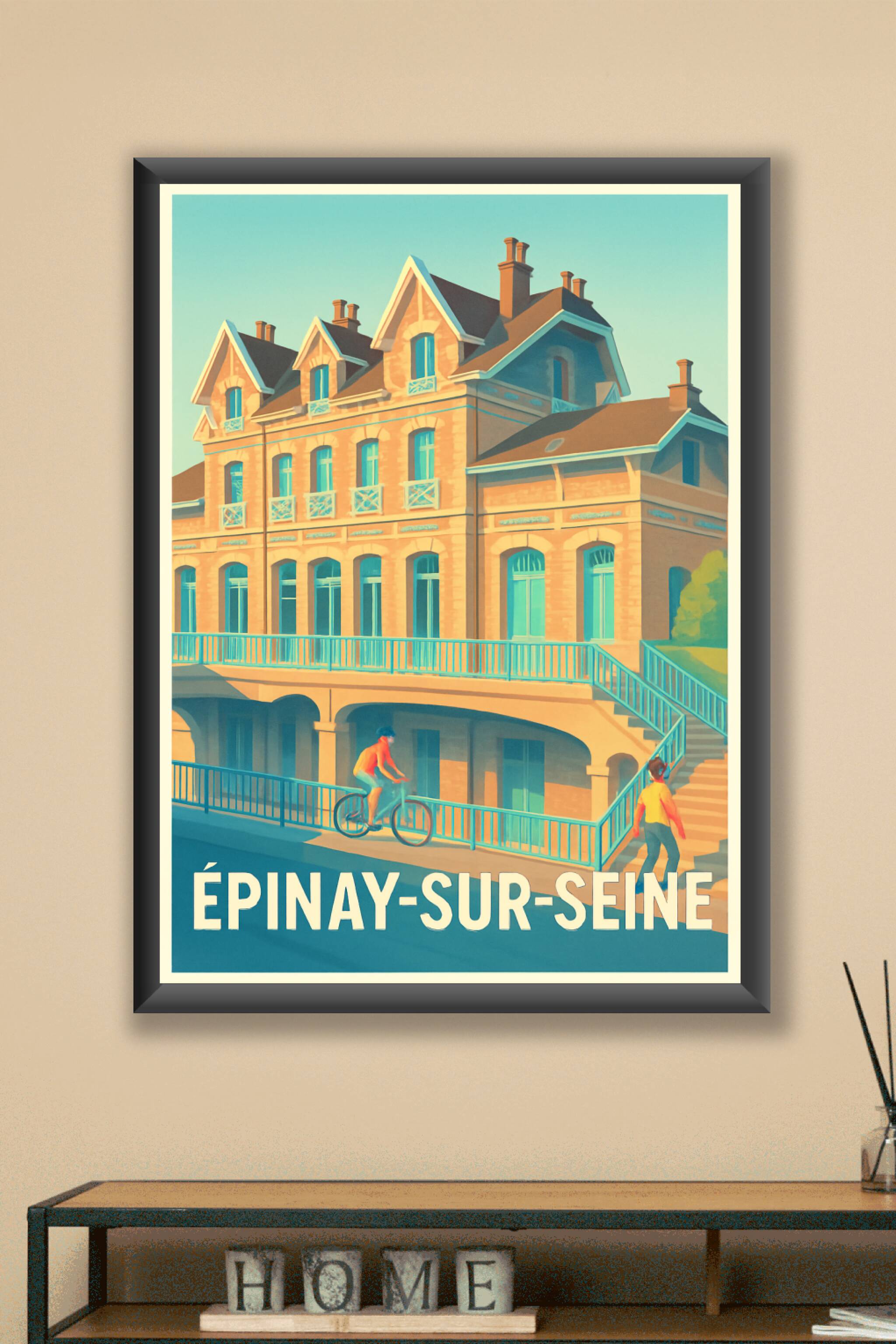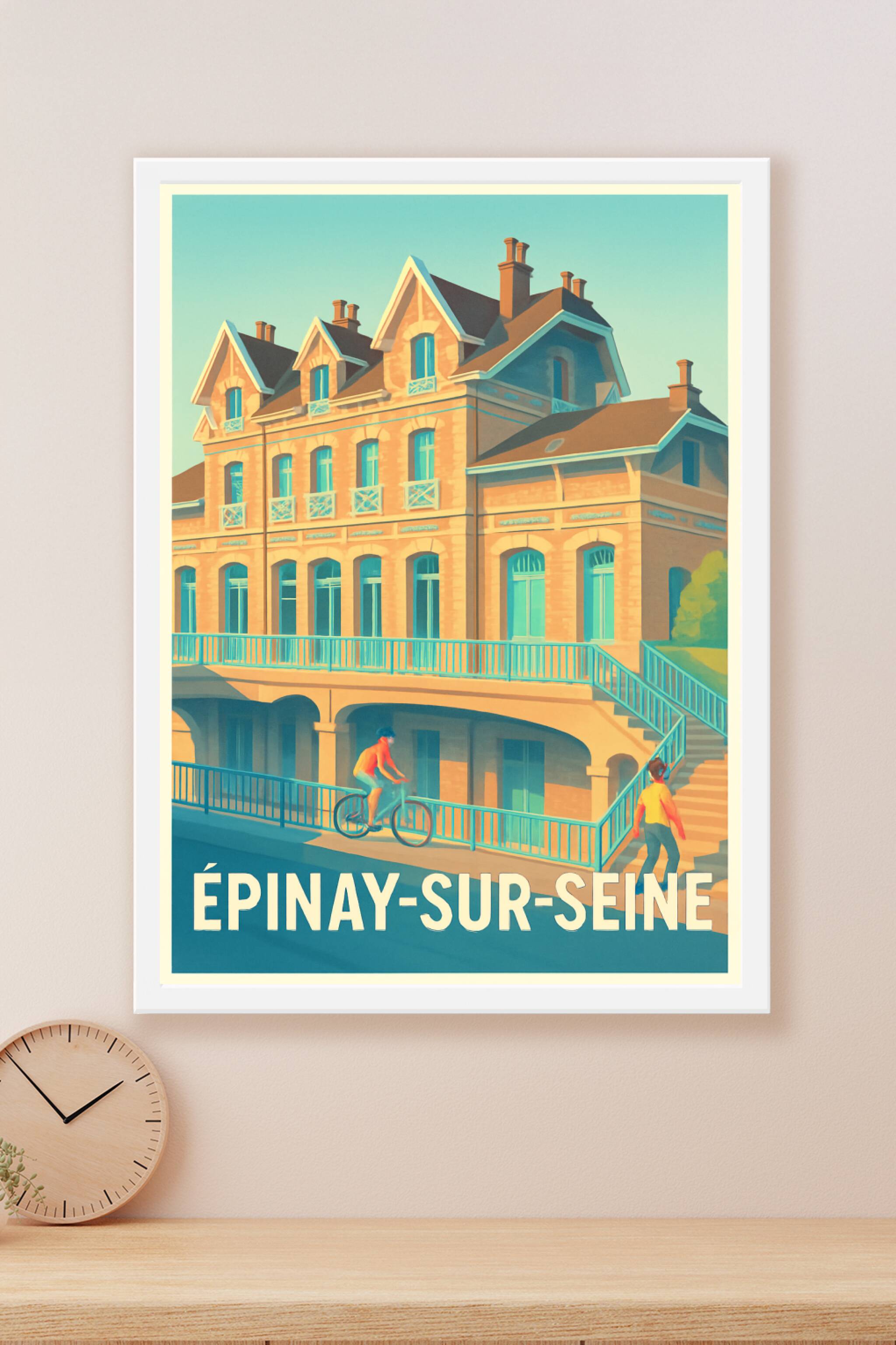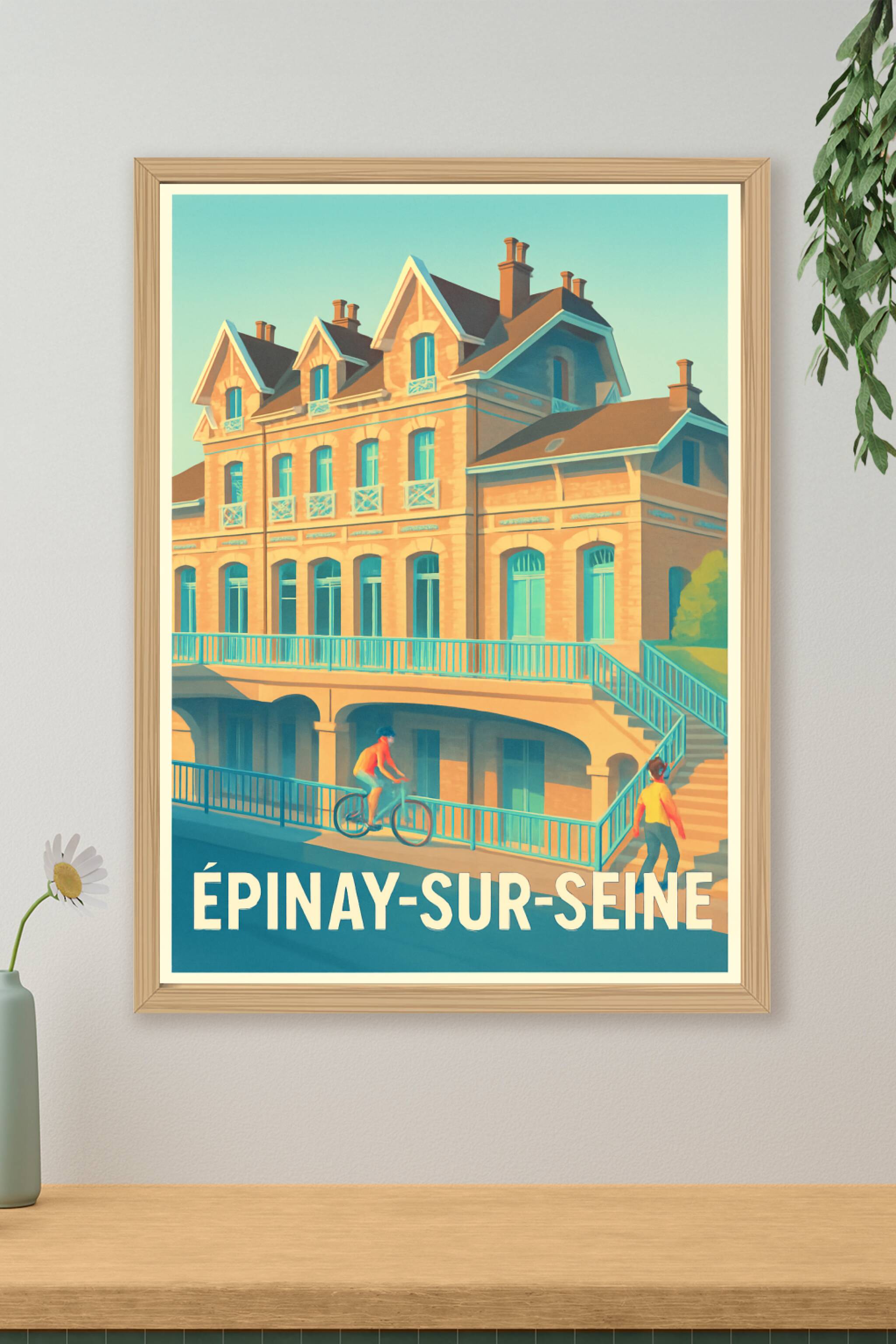 Découvrez l'élégance intemporelle d'Épinay-sur-Seine à travers cette affiche au style vintage qui met en lumière l'architecture typique et la vie p...