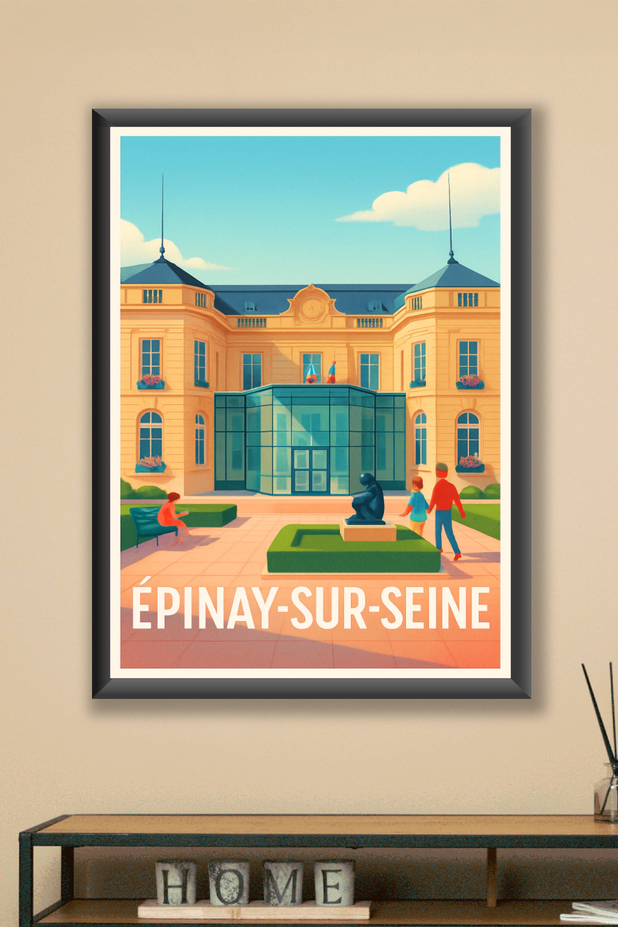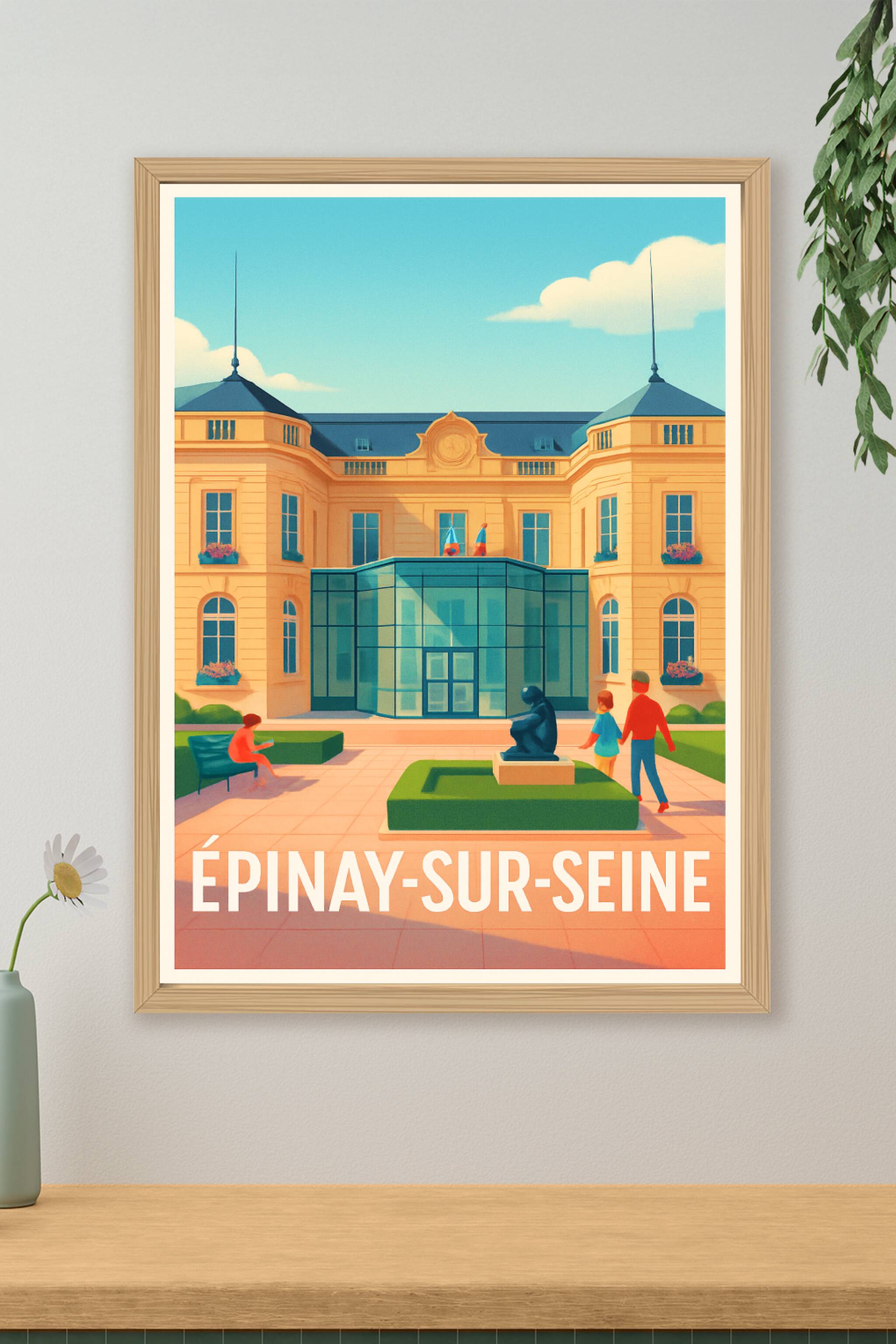 Découvrez l'élégance architecturale d'Épinay-sur-Seine à travers cette affiche au style moderne et chaleureux. Le poster met en avant un bâtiment e...