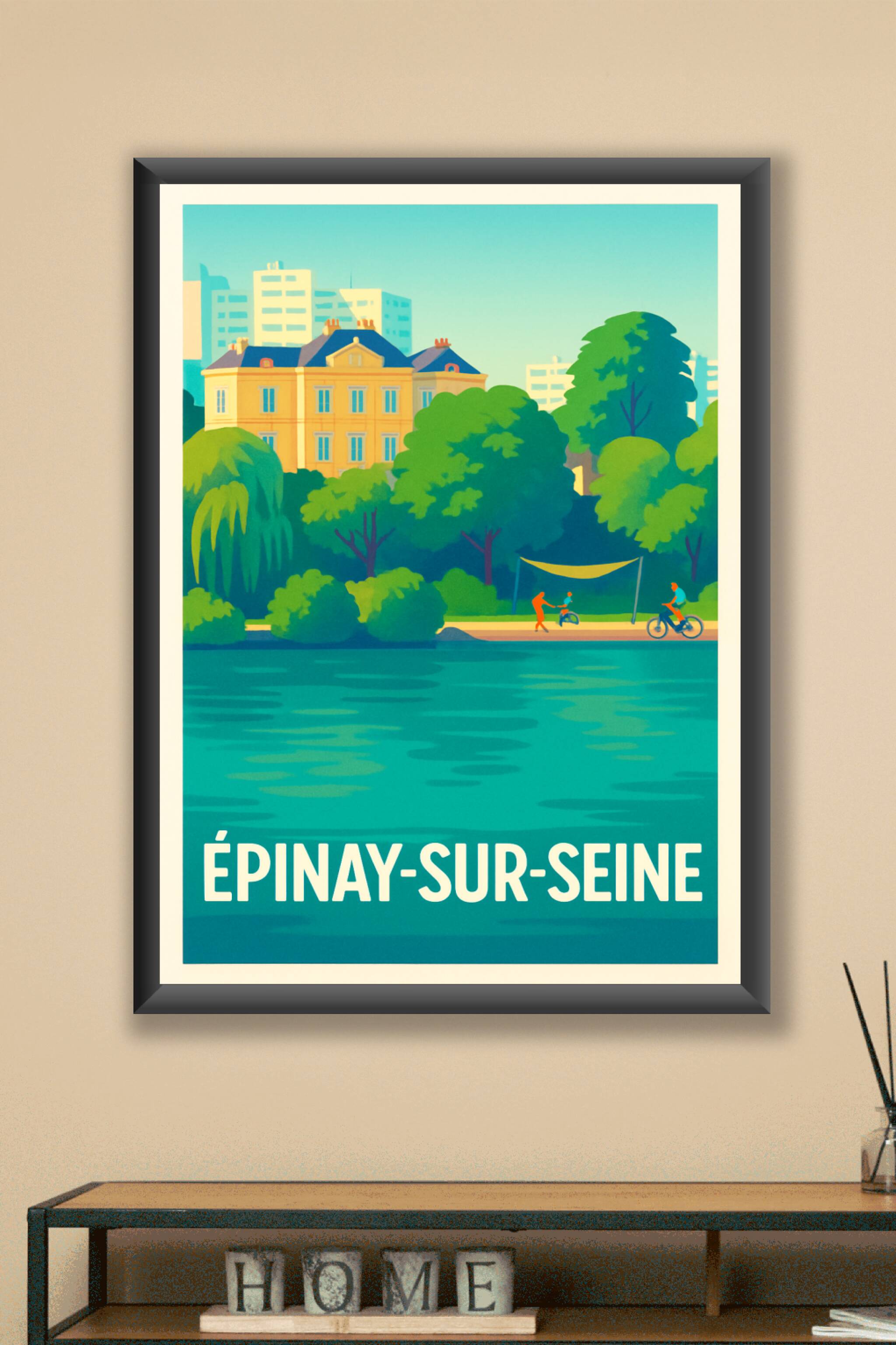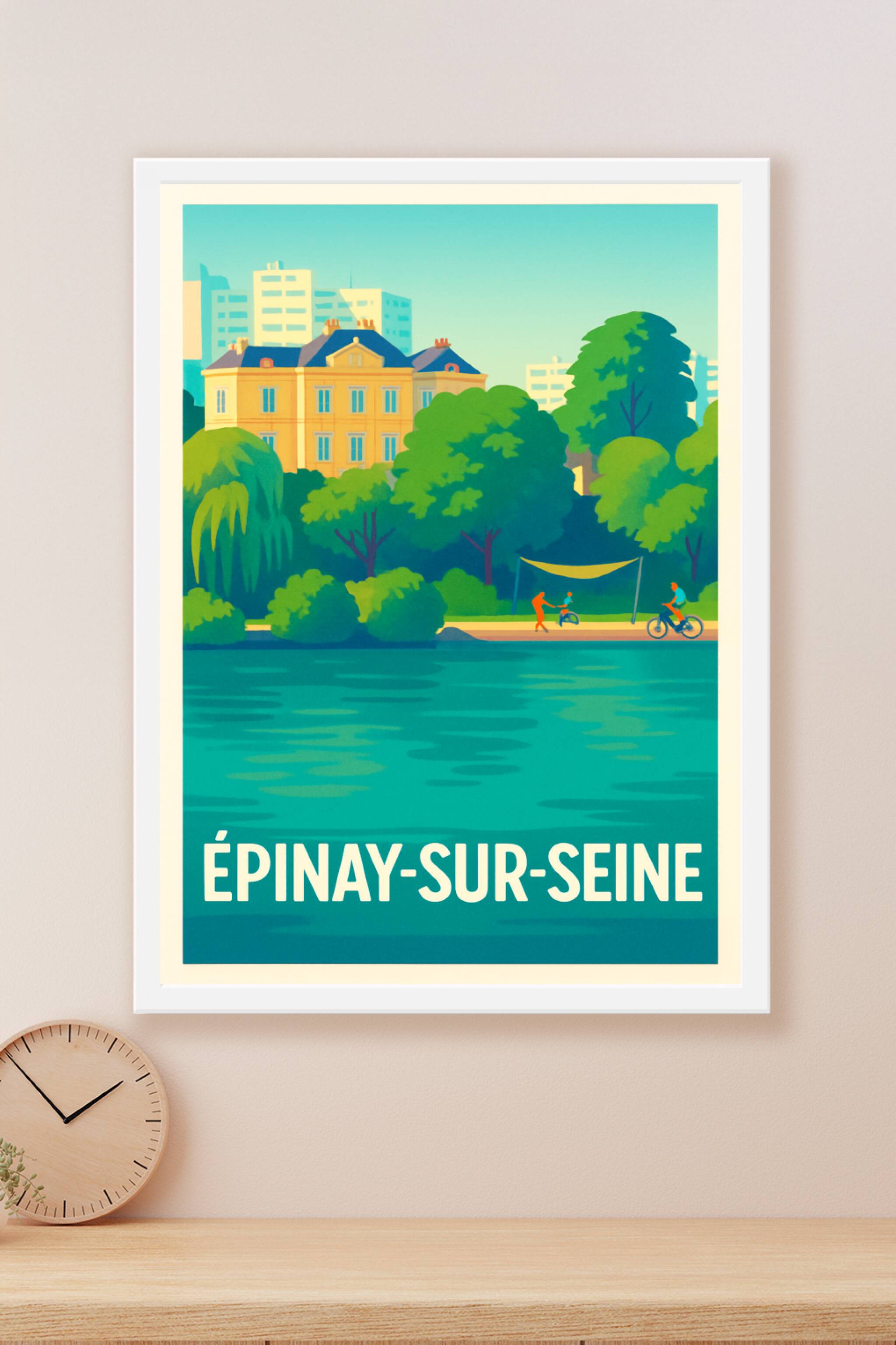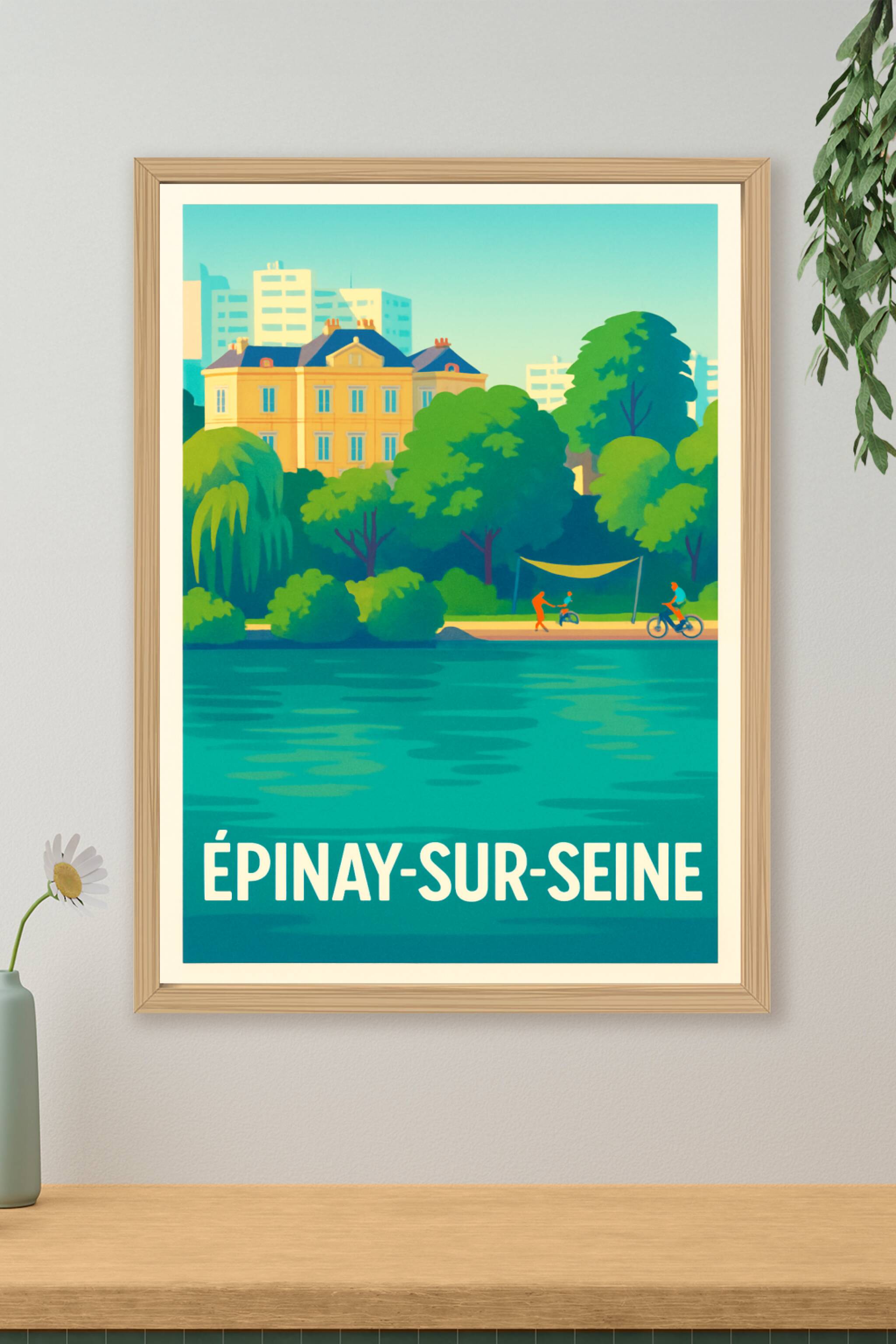 Découvrez la douceur de vivre d'Épinay-sur-Seine avec cette affiche illustrée qui capture la quiétude de ses rives verdoyantes et l'architecture él...