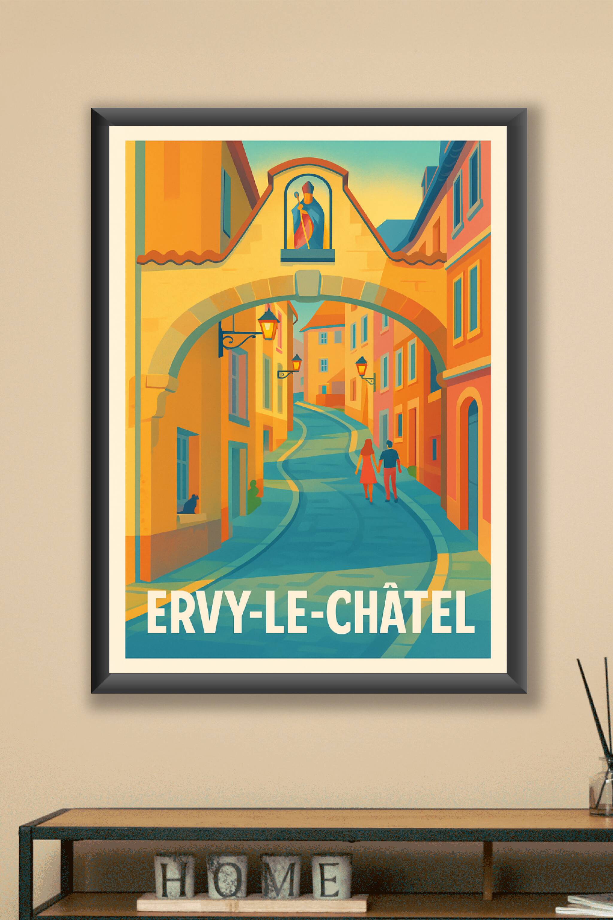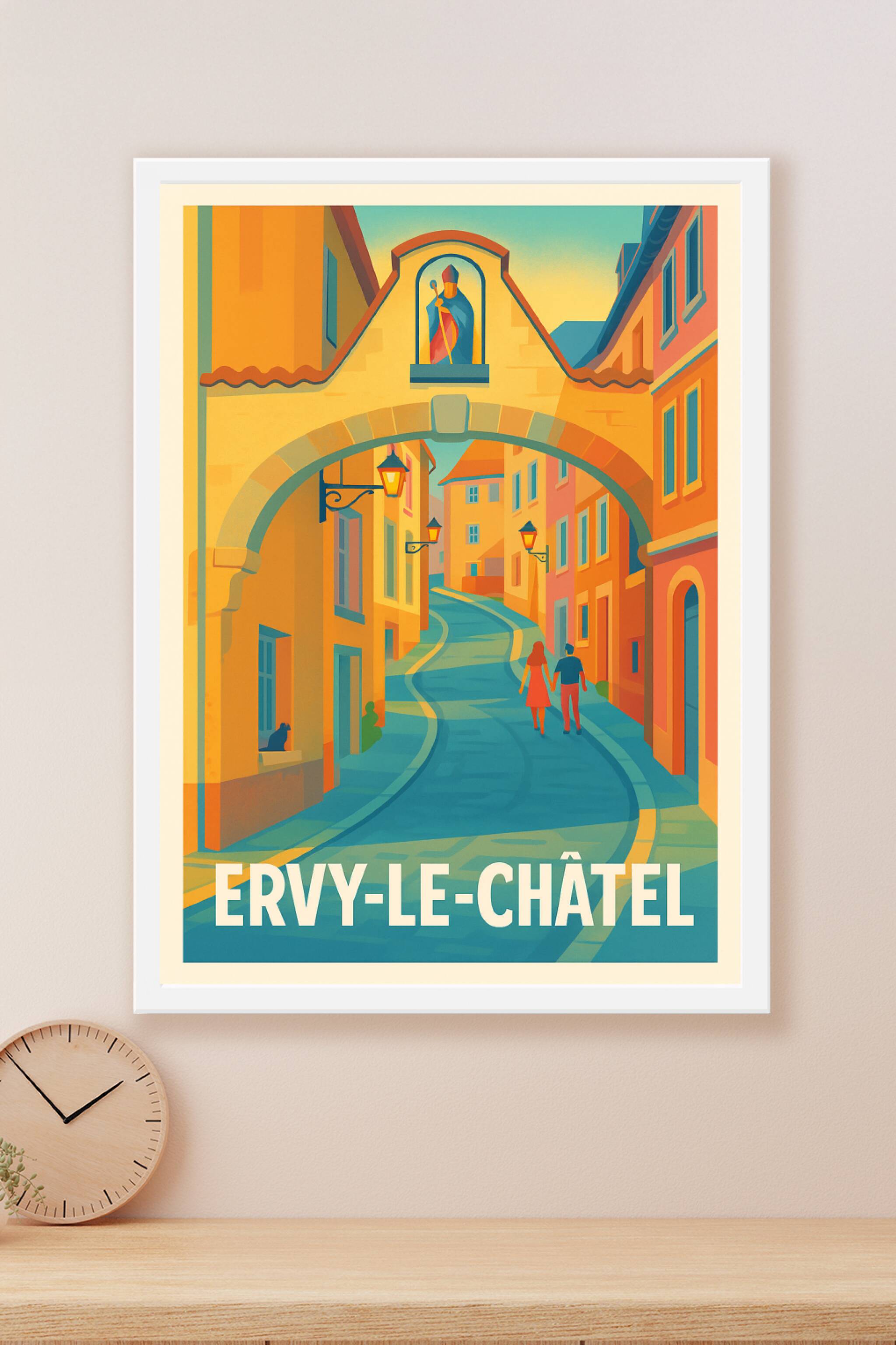 Redécouvrez le charme pittoresque d'Ervy-le-Châtel avec cette affiche illustrée pleine de couleurs lumineuses et de douceur. Le poster capture une scène romantique dans les ruelles anciennes, sous une arche emblématique ornée d'une statue. Disponible en tirage "Fine Art" sur papier 305g coton, cette affiche offre une qualité d'impression exceptionnelle et durable. Vous pouvez choisir votre format préféré, de A1 à A4, avec ou sans cadre, pour habiller votre intérieur d'une ambiance chaleureuse et authentique. Ce poster saura ravir les amateurs d'histoire et de beauté des villages français, tout en apportant une touche artistique unique à votre décoration.