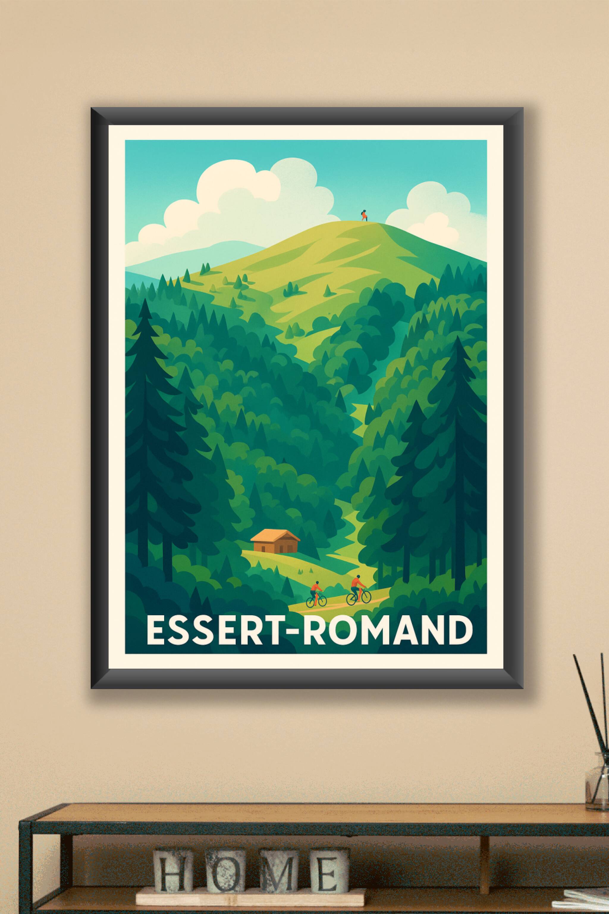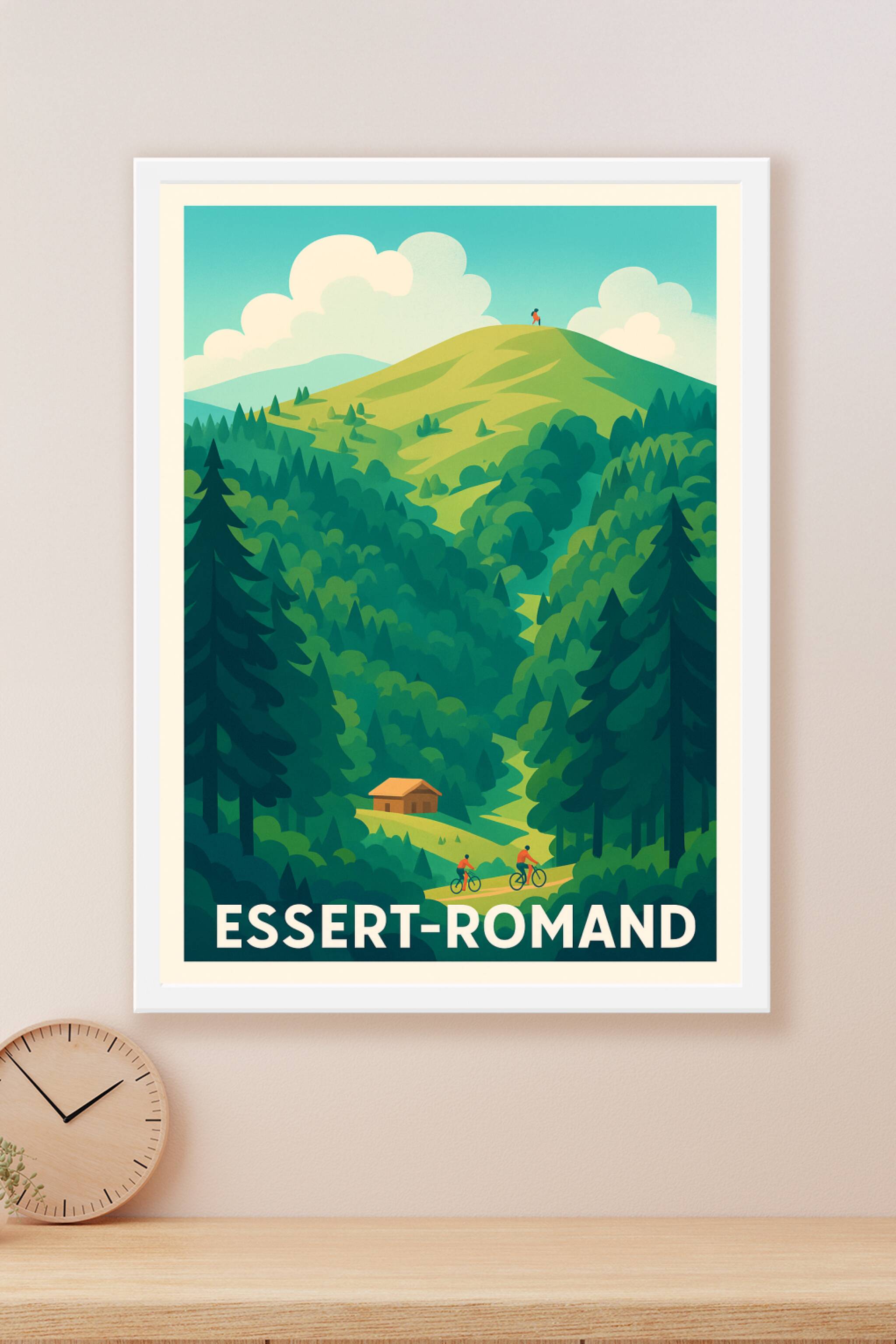 Découvrez la beauté verdoyante d'Essert-Romand avec cette affiche illustrée, qui capture l'essence paisible des paysages alpins. Deux cyclistes en ...