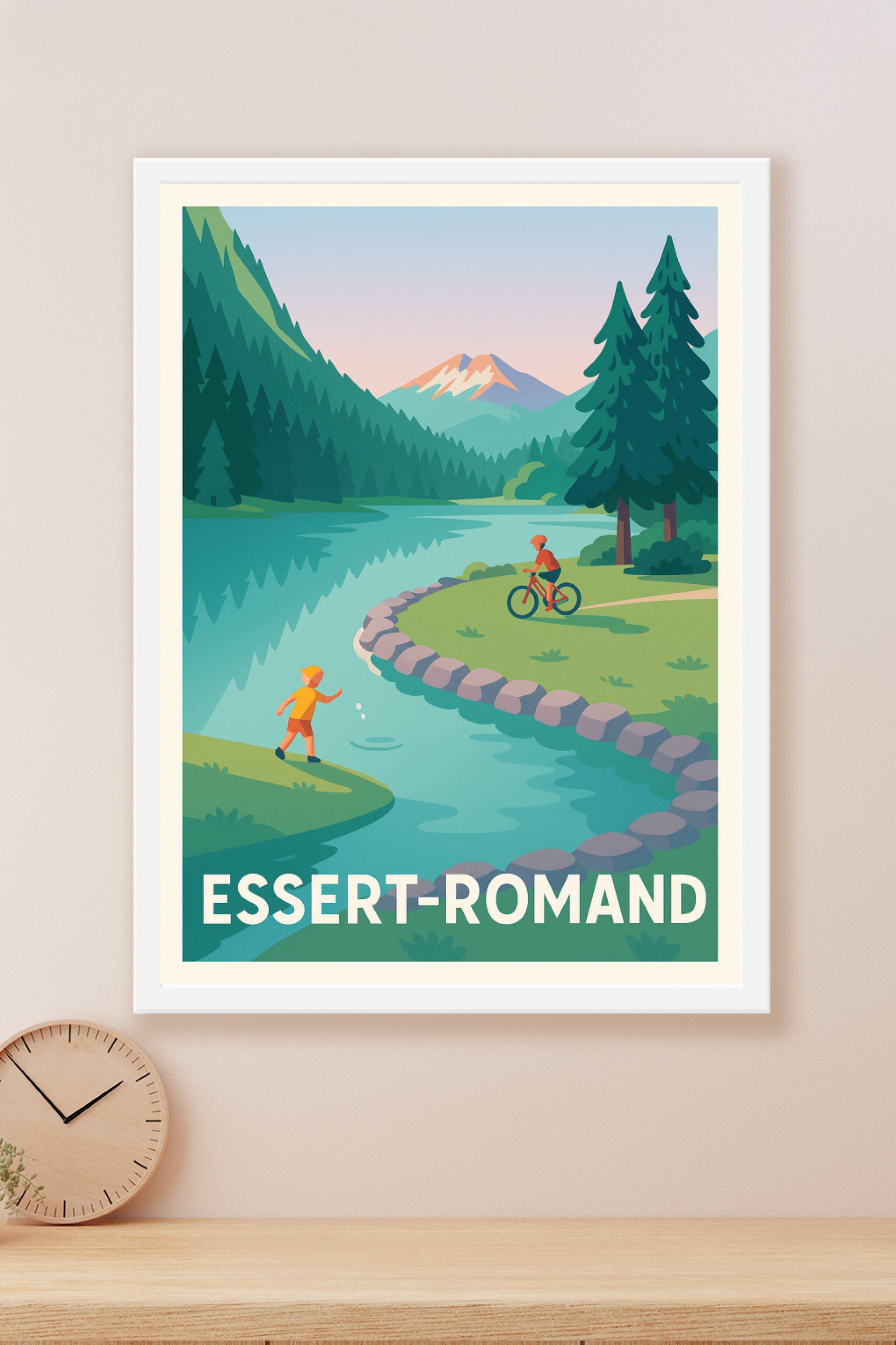 Découvrez l'univers paisible et enchanteur d'Essert-Romand à travers ce poster illustré mettant en scène les montagnes, une rivière paisible, et de...
