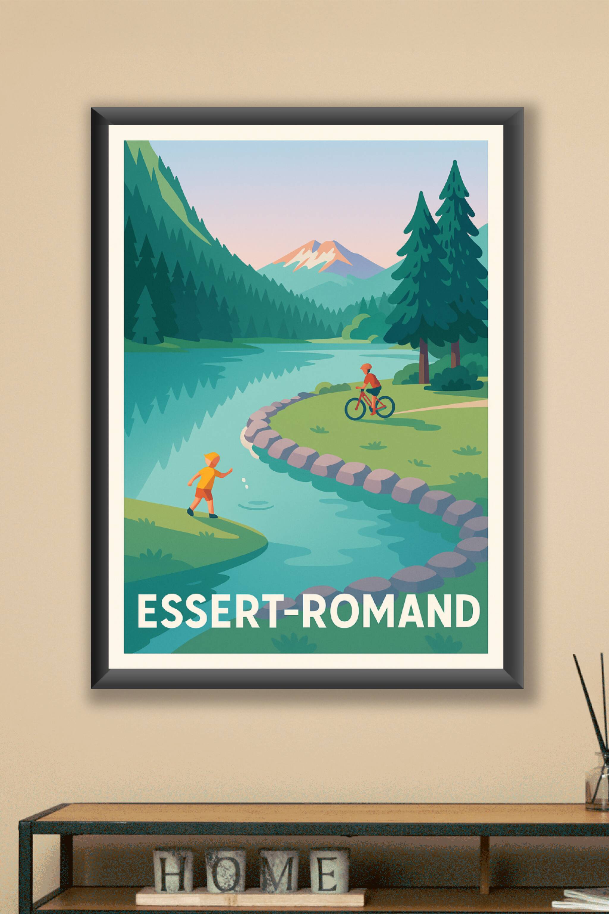 Découvrez l'univers paisible et enchanteur d'Essert-Romand à travers ce poster illustré mettant en scène les montagnes, une rivière paisible, et des moments de loisirs en pleine nature. Cette affiche est imprimée en tirage "Fine Art" sur papier 305g coton, garantissant une qualité d'impression remarquable et des couleurs éclatantes. Disponible en plusieurs formats allant de A1 à A4, avec ou sans cadre, elle s'adapte parfaitement à toute décoration intérieure. Offrez-vous ou offrez un souvenir unique et authentique d'Essert-Romand grâce à cette affiche de prestige, entièrement produite en France pour une finition haut de gamme.
