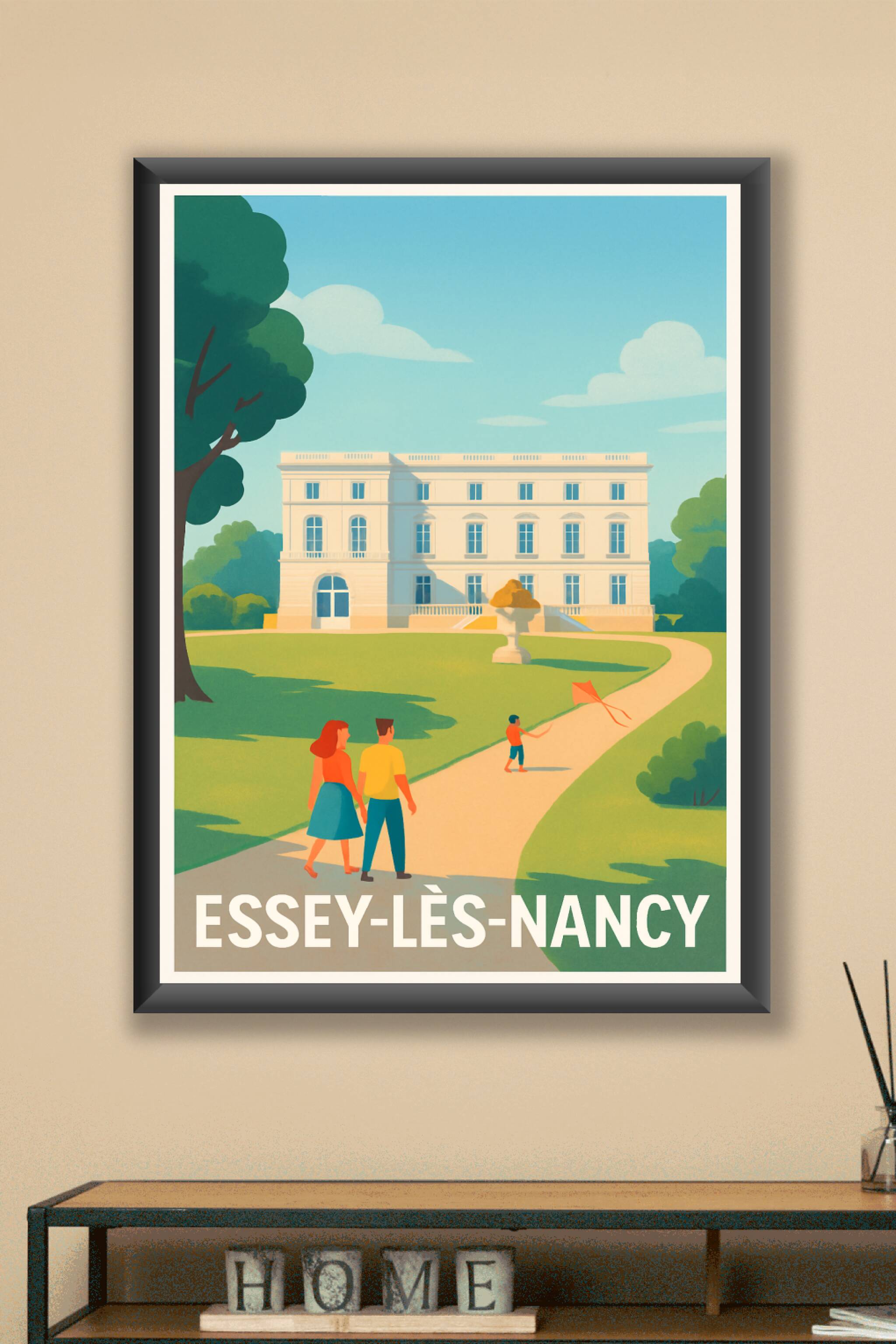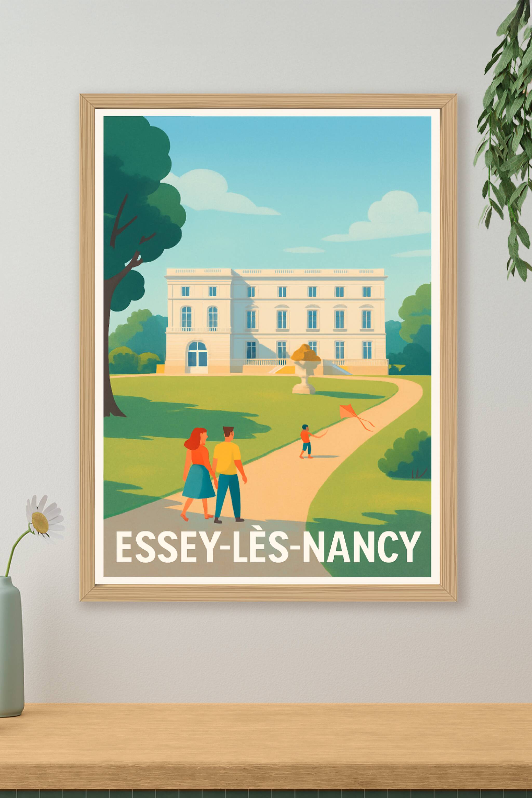 Découvrez l'atmosphère paisible d'Essey-lès-Nancy à travers cette affiche vintage qui capture une balade ensoleillée dans un parc bordant un élégant manoir. Ce poster illustre avec finesse un moment de détente en famille, sublimé par des couleurs douces et une lumière chaleureuse.Disponible en tirage "Fine Art" sur papier coton 305g, cette affiche garantit une qualité d'impression exceptionnelle et une longévité assurée. Choisissez parmi les formats du A1 au A4, avec ou sans cadre, pour adapter ce poster à votre décoration intérieure. Ce tirage premium, 100% fabriqué en France, est idéal pour apporter une touche authentique et raffinée à votre intérieur ou pour offrir un souvenir élégant à ceux qui aiment Essey-lès-Nancy.