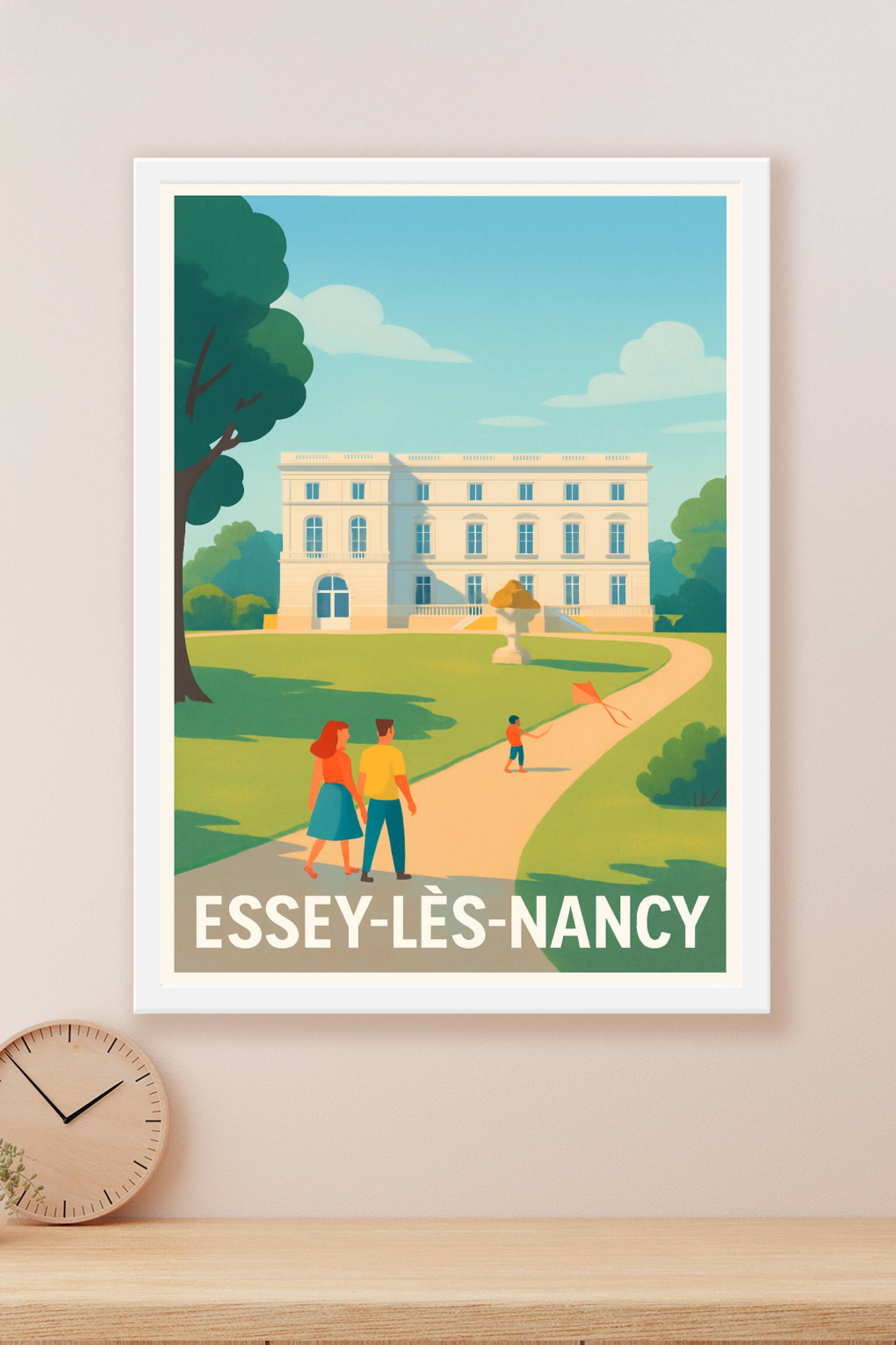 Découvrez l'atmosphère paisible d'Essey-lès-Nancy à travers cette affiche vintage qui capture une balade ensoleillée dans un parc bordant un élégan...