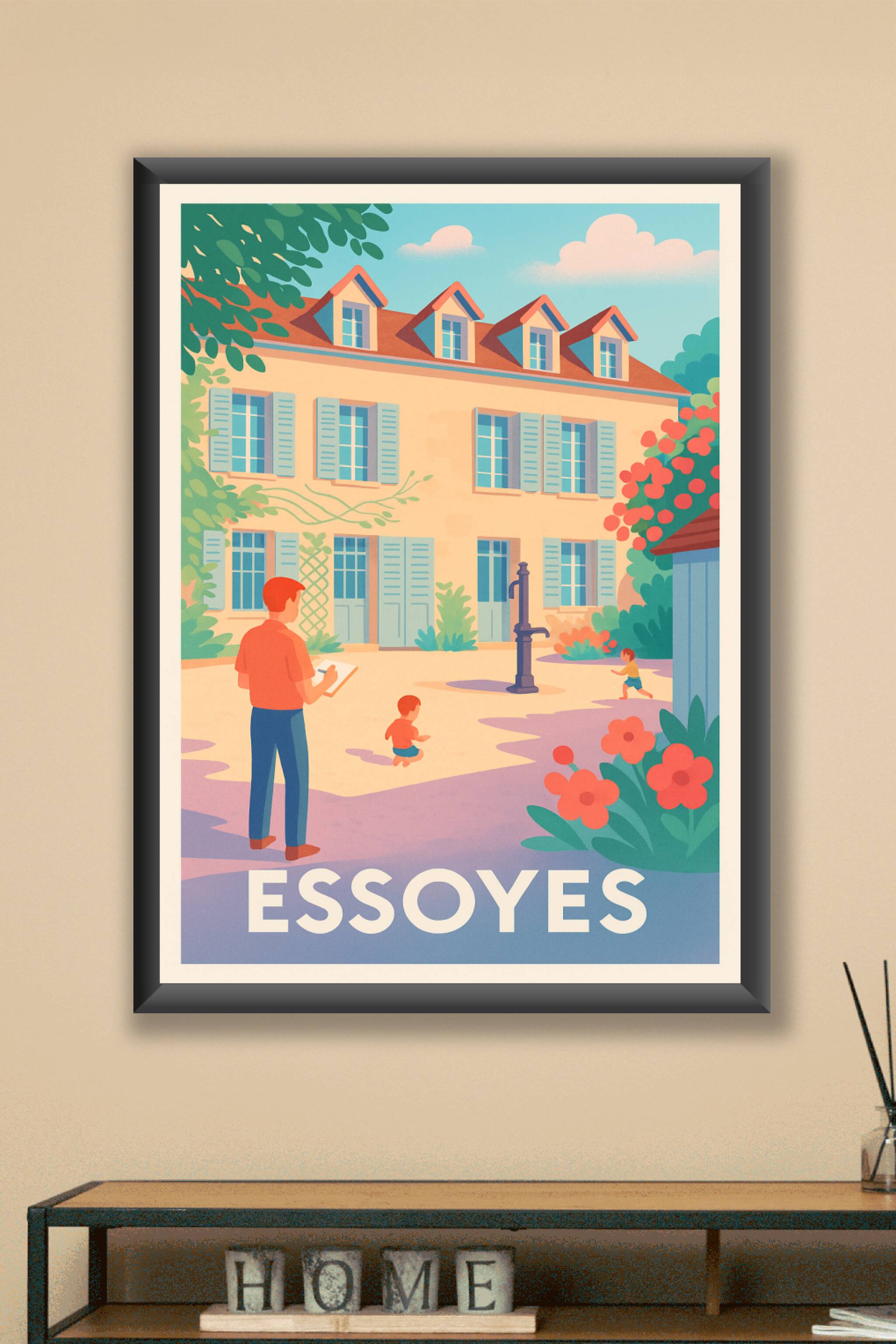 Découvrez l'élégance tranquille d'Essoyes à travers cette affiche illustrée, qui capture l'atmosphère paisible d'une maison traditionnelle entourée...
