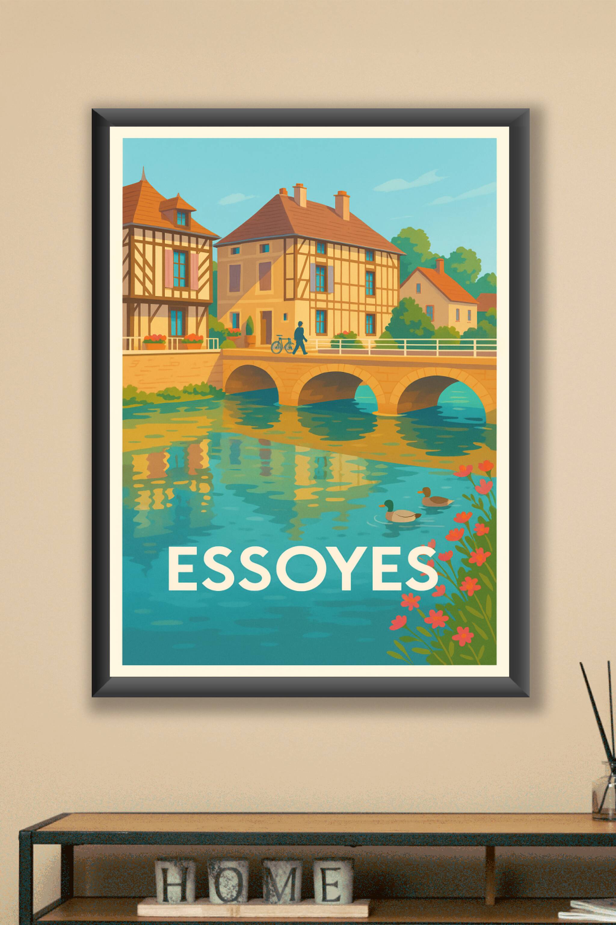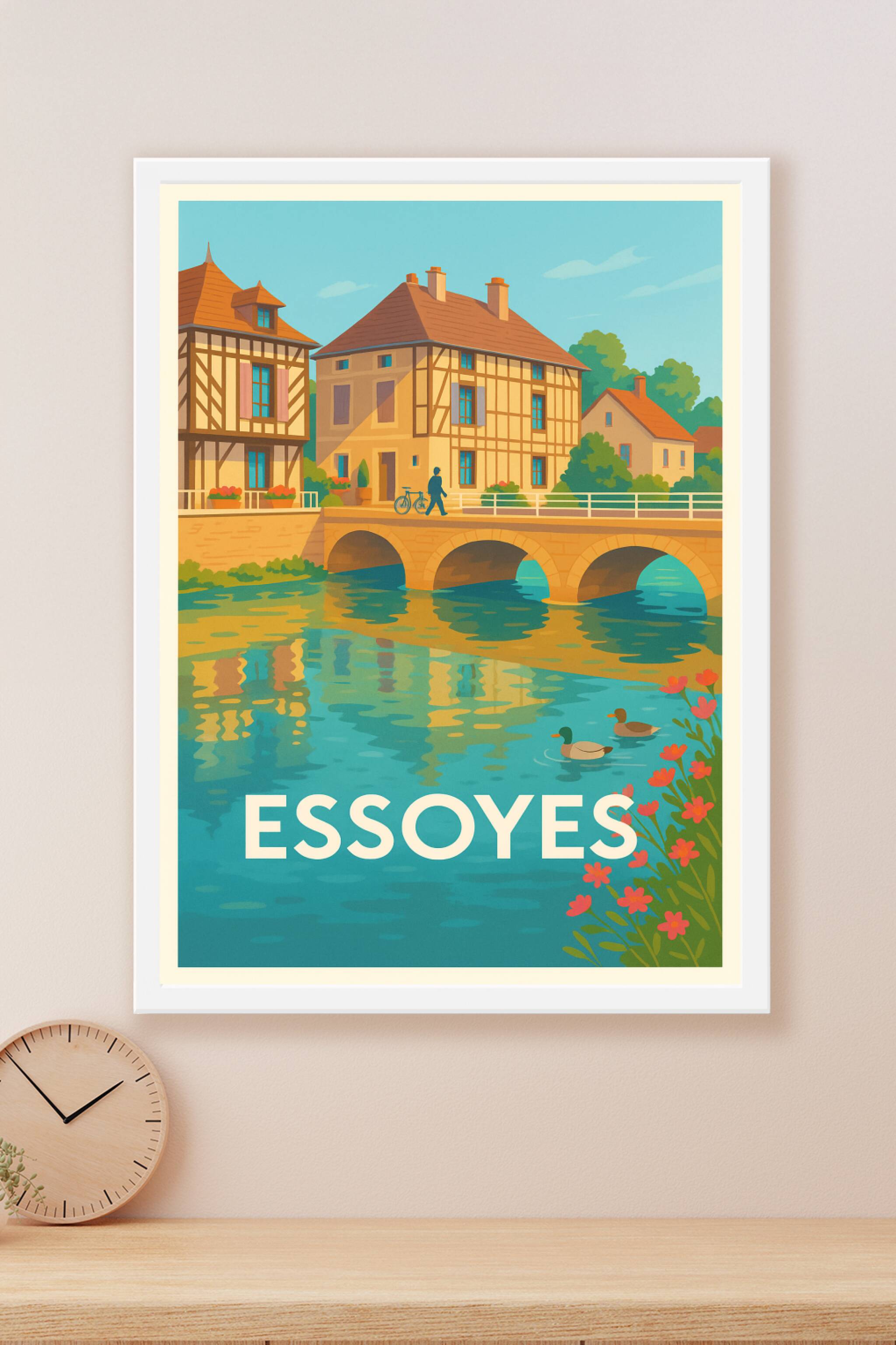 Découvrez l'élégance tranquille d'Essoyes avec cette affiche représentant ses maisons à colombages typiques et son pont de pierre surplombant une r...