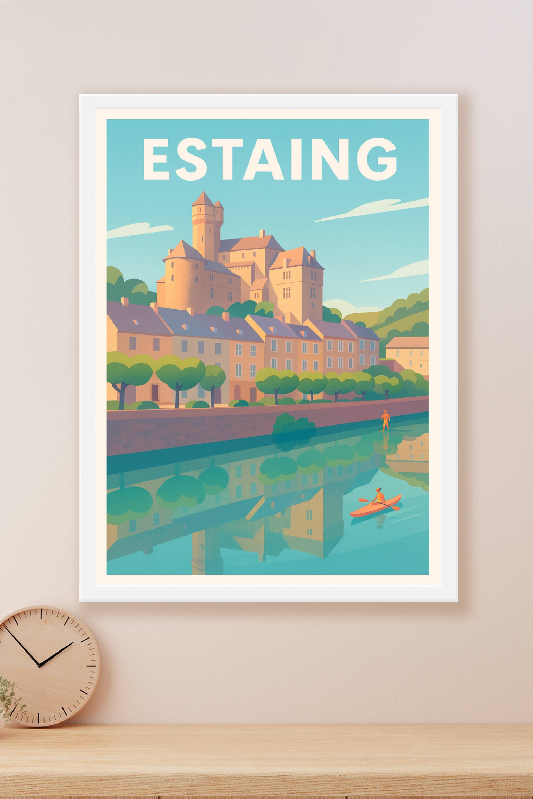 Découvrez l'élégance paisible d'Estaing avec cette affiche au style vintage mettant en scène le château emblématique surplombant le village et la rivière. Ce poster invite à la détente et à l'évasion dans ce cadre naturel harmonieux, reflet d'un patrimoine préservé.Ce poster est imprimé en tirage "Fine Art" sur papier 305g coton, garantissant une qualité d'impression exceptionnelle et durable. Disponible en formats A1 à A4, avec ou sans cadre, cette affiche saura sublimer votre intérieur en apportant une touche d'authenticité et de douceur. Fabriquée en France, elle est parfaite pour offrir un souvenir raffiné aux amoureux d'Estaing ou pour embellir votre décoration murale.