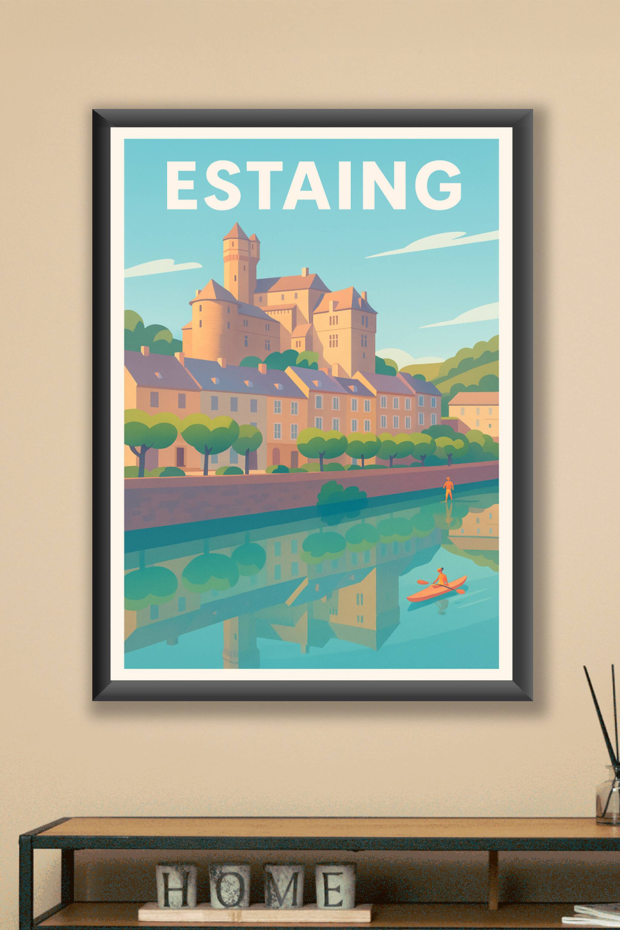 Découvrez l'élégance paisible d'Estaing avec cette affiche au style vintage mettant en scène le château emblématique surplombant le village et la r...