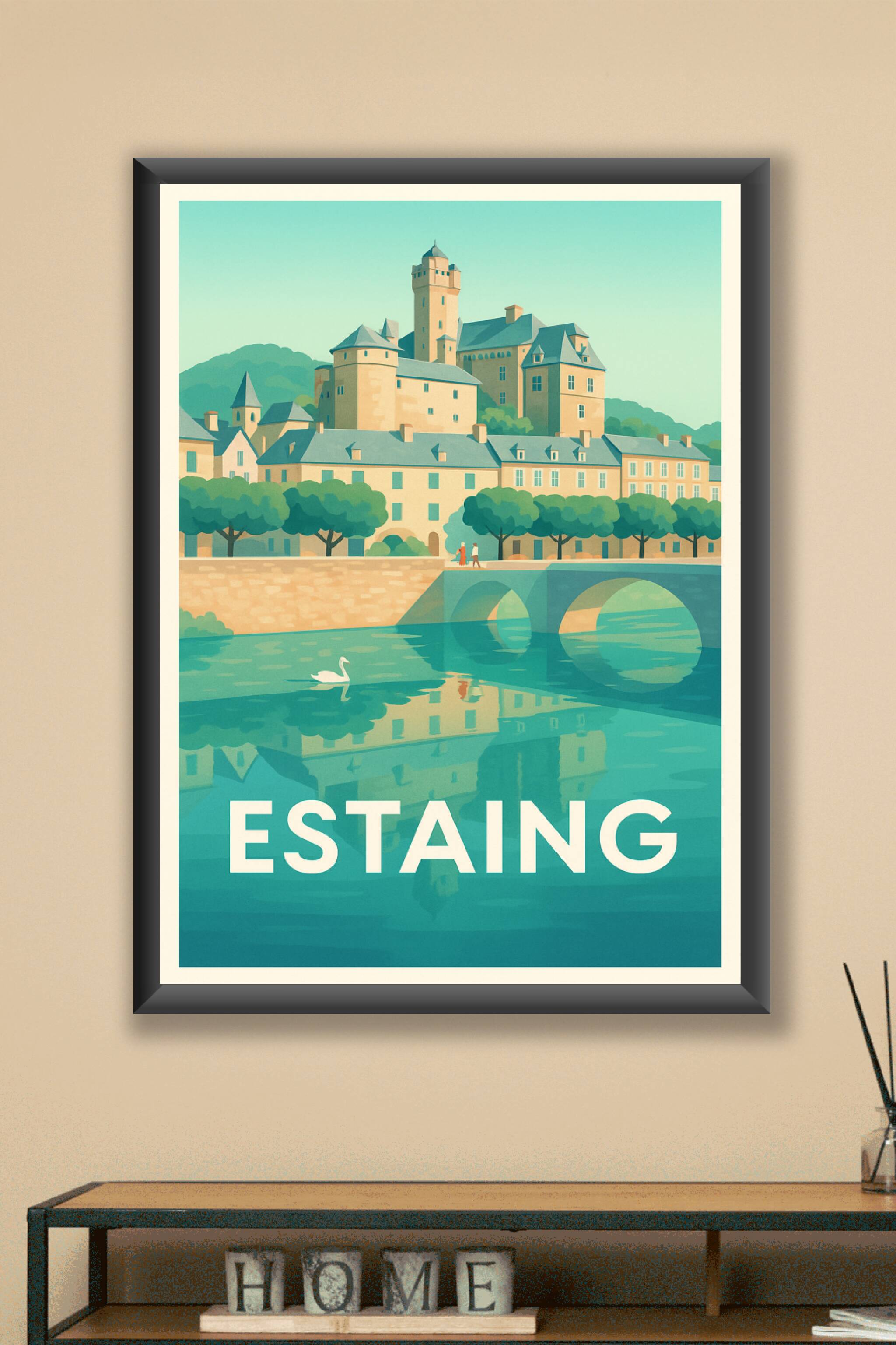 Découvrez le calme et la beauté du charmant village d'Estaing avec cette affiche illustrée aux couleurs douces et apaisantes. Le poster capture l'a...