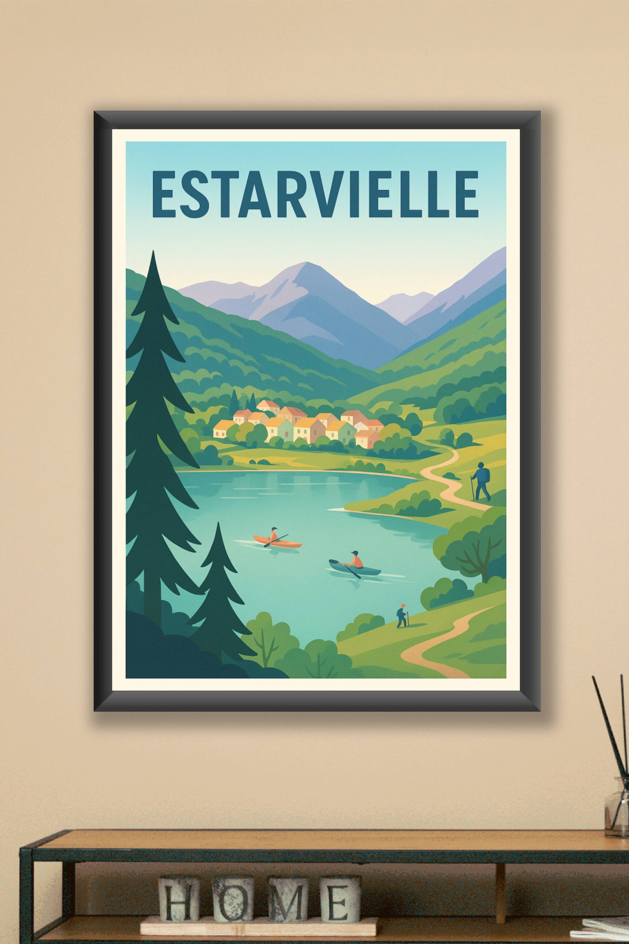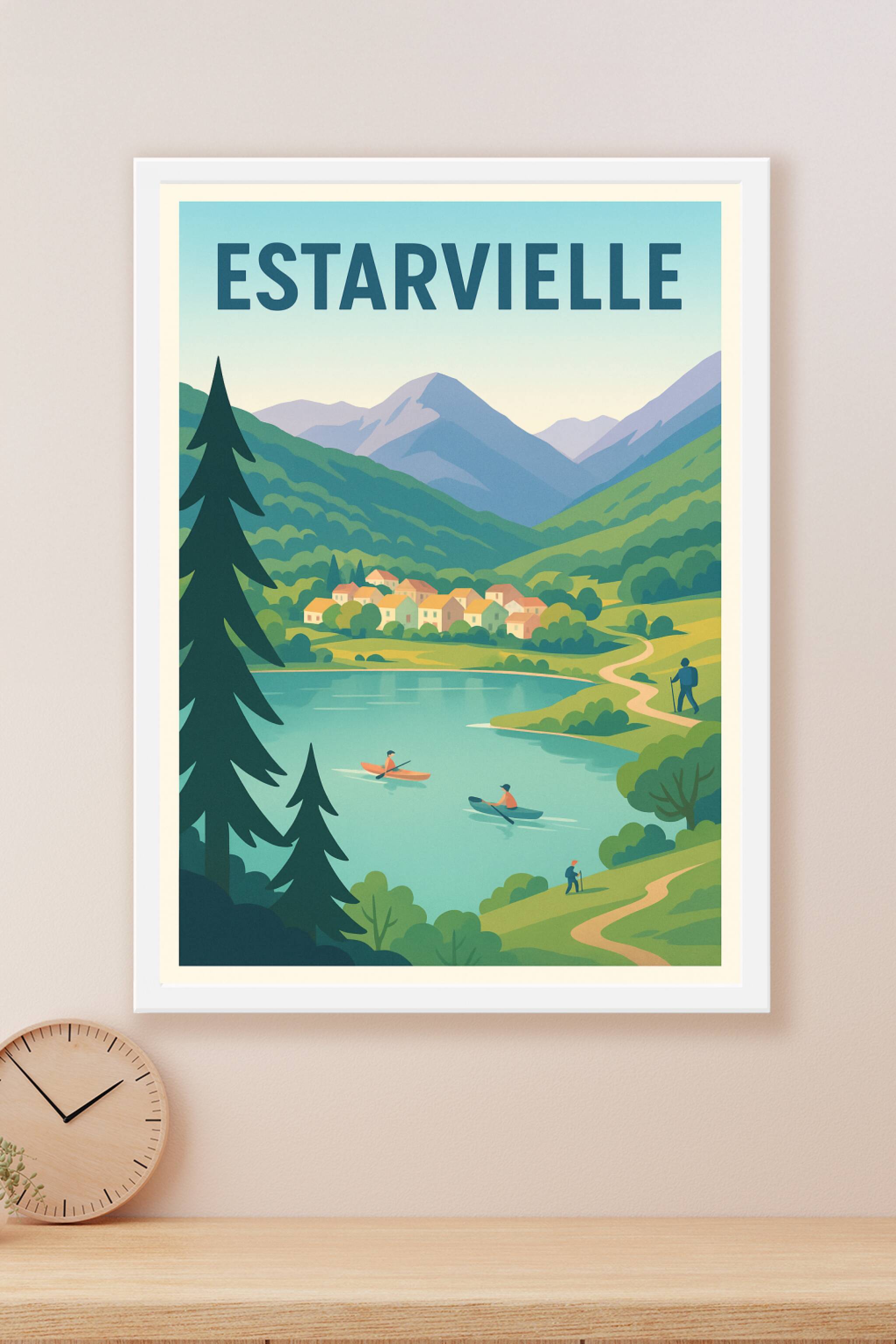 Découvrez la sérénité paisible d'Estarvielle avec cette affiche illustrée qui capture les paysages montagneux et le lac où barques et randonneurs c...