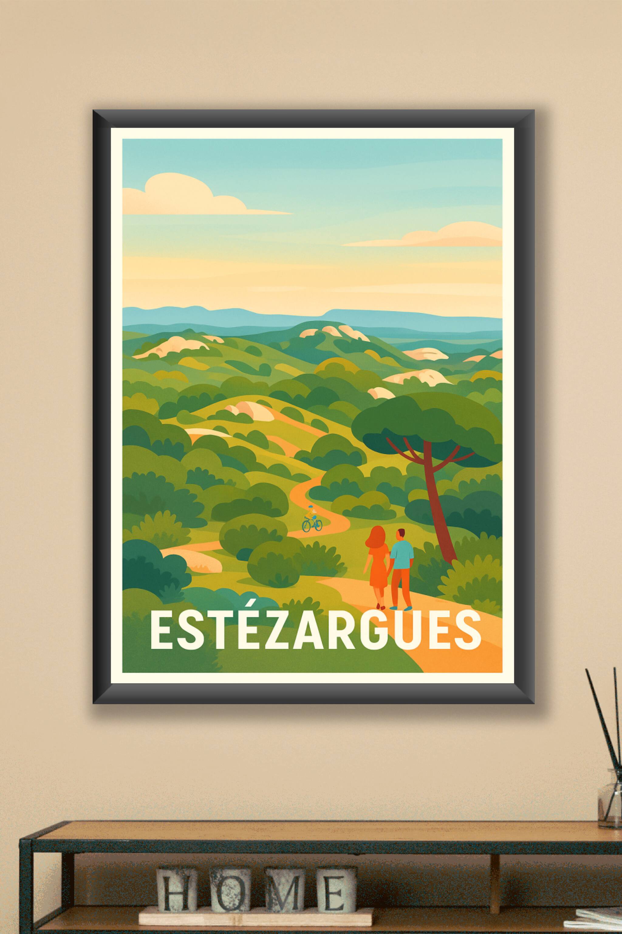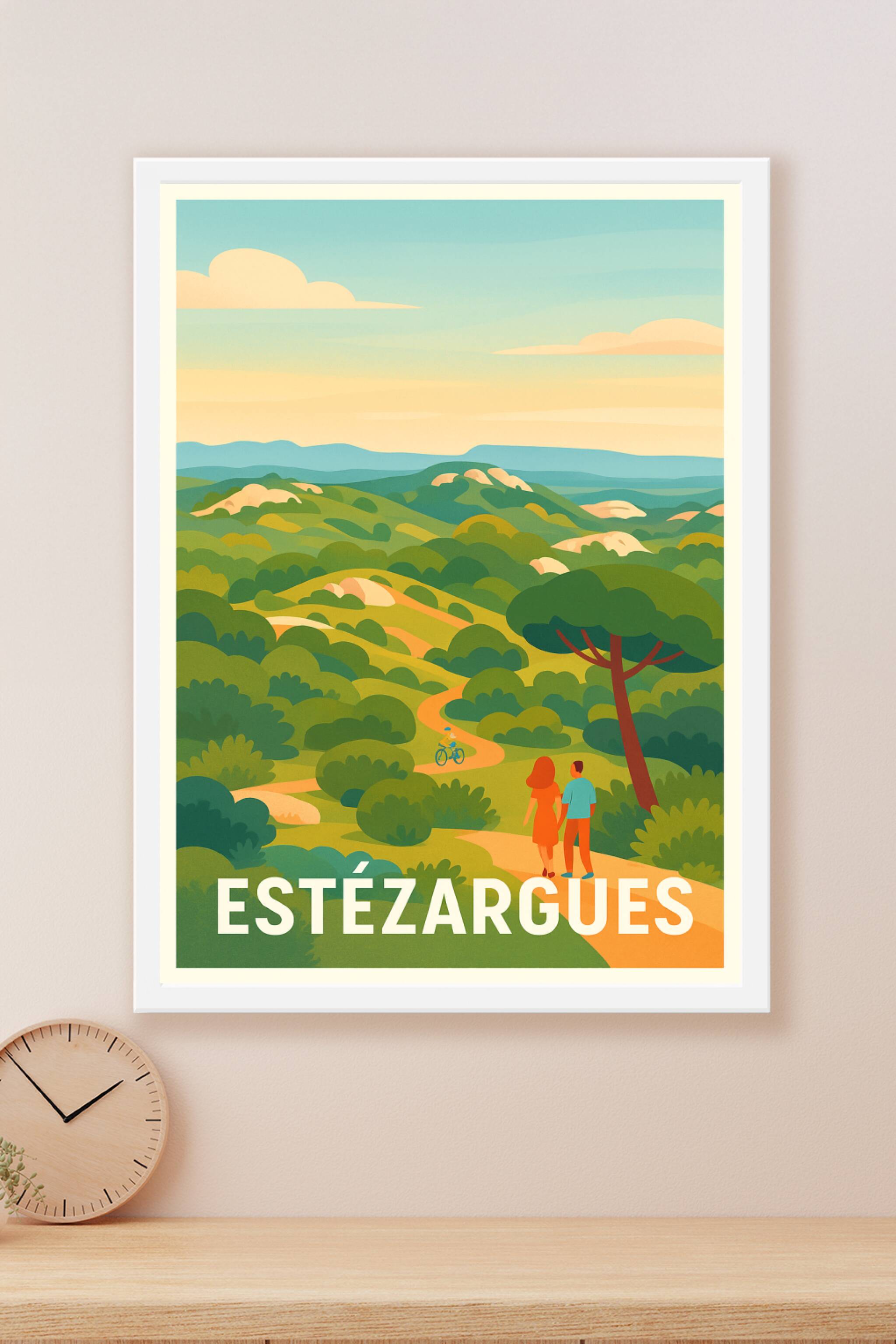 Découvrez la sérénité des paysages verdoyants d'Estézargues à travers cette affiche au style rétro-charmant. Ce poster met en scène un chemin bucolique où se mêlent collines, arbustes et une promenade paisible, idéale pour apporter une touche champêtre à votre intérieur. Imprimée en tirage "Fine Art" sur papier 305g coton, cette affiche offre une qualité d'impression exceptionnelle, garantie pour sublimer vos murs. Disponible en formats A1 à A4, avec ou sans cadre, elle est parfaite pour décorer votre maison ou offrir un souvenir élégant aux amateurs de nature et de paysages pittoresques.