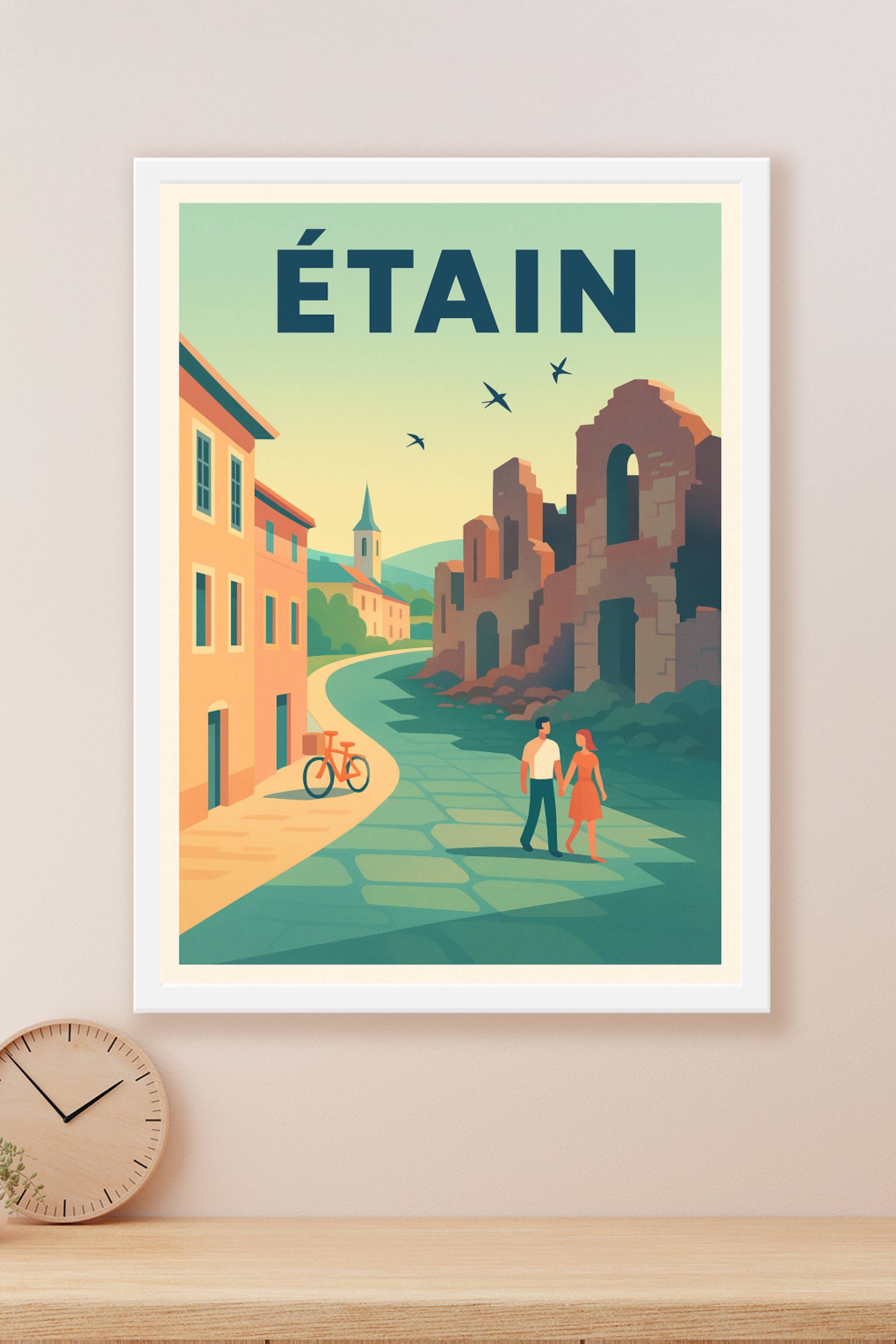 Découvrez la douceur et le charme d'Étain avec cette affiche illustrée au style vintage et apaisant. L'image met en scène une promenade romantique ...
