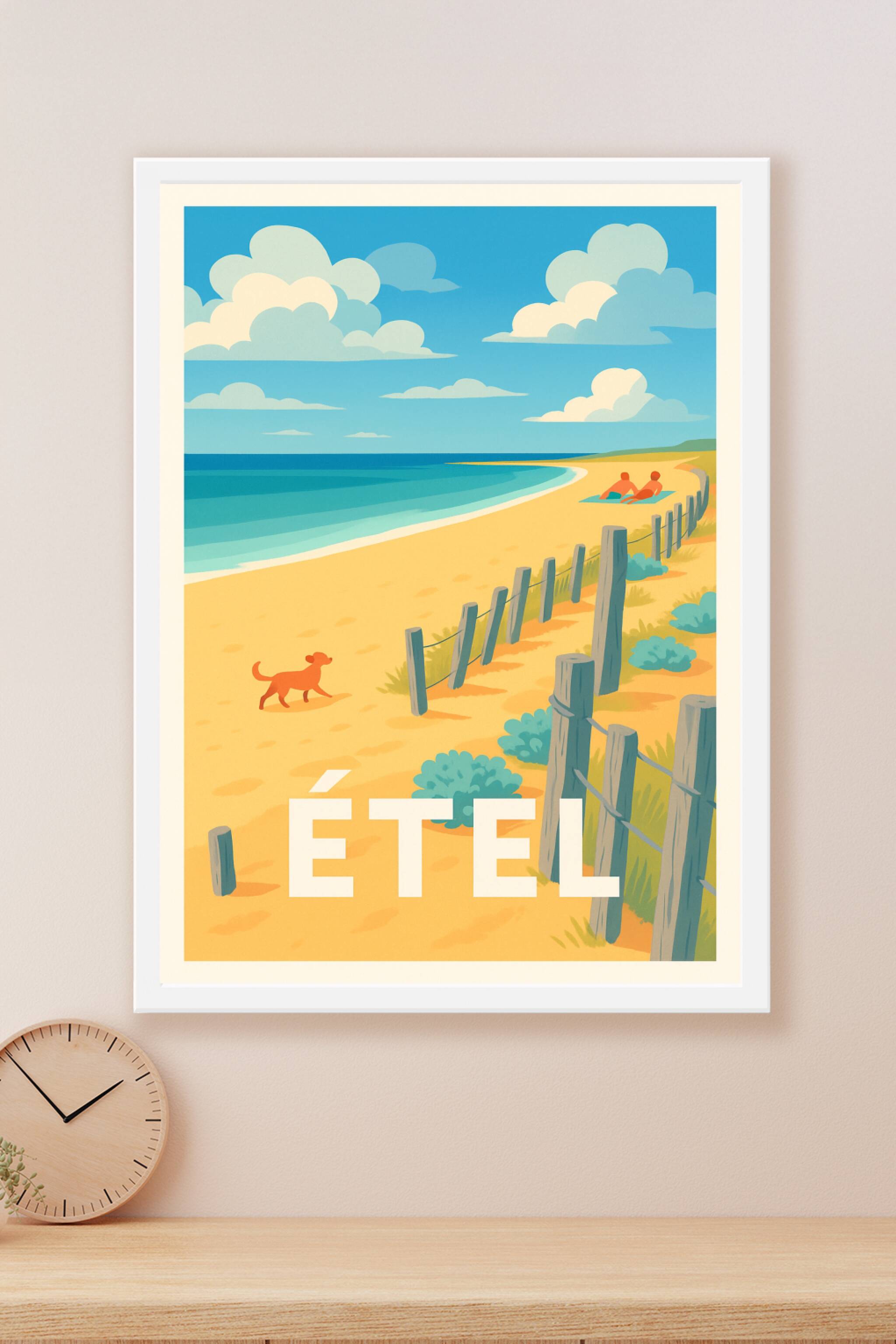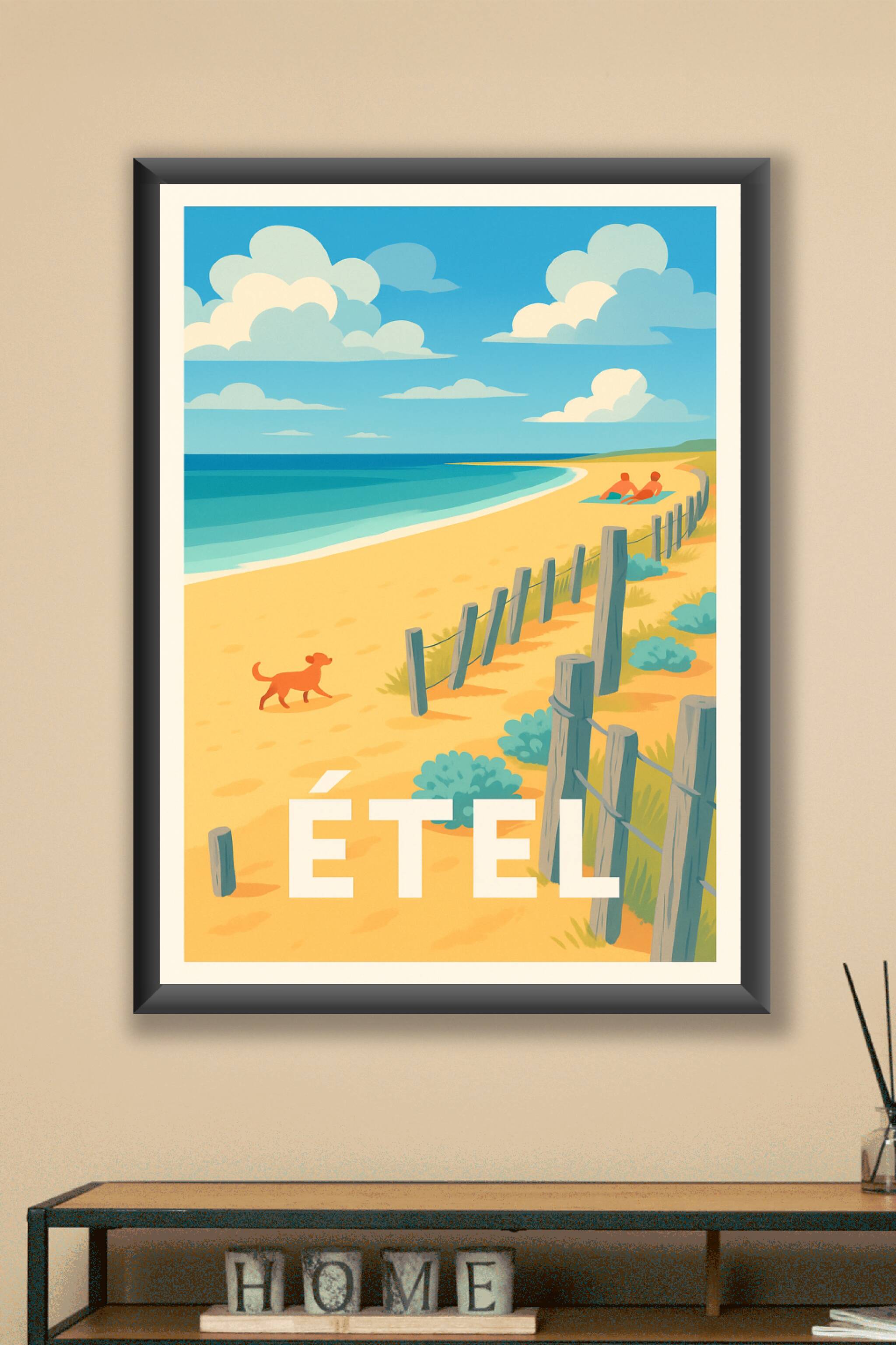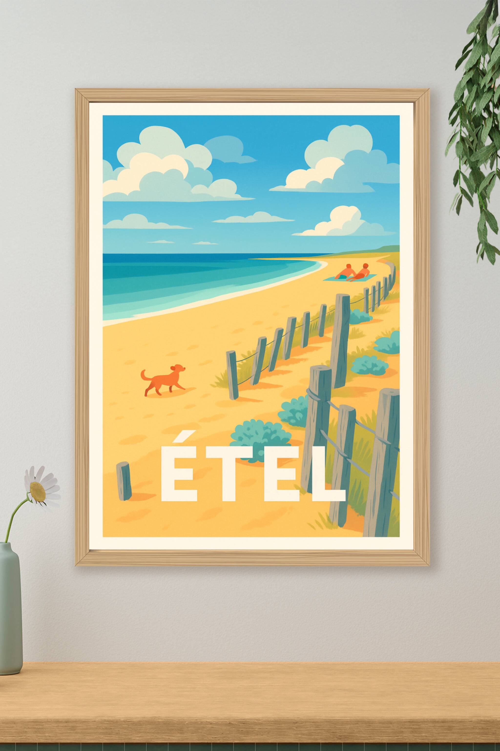 Découvrez l'atmosphère paisible et estivale d'Étel à travers cette affiche pleine de charme illustrant une plage dorée où ciel bleu et mer turquois...