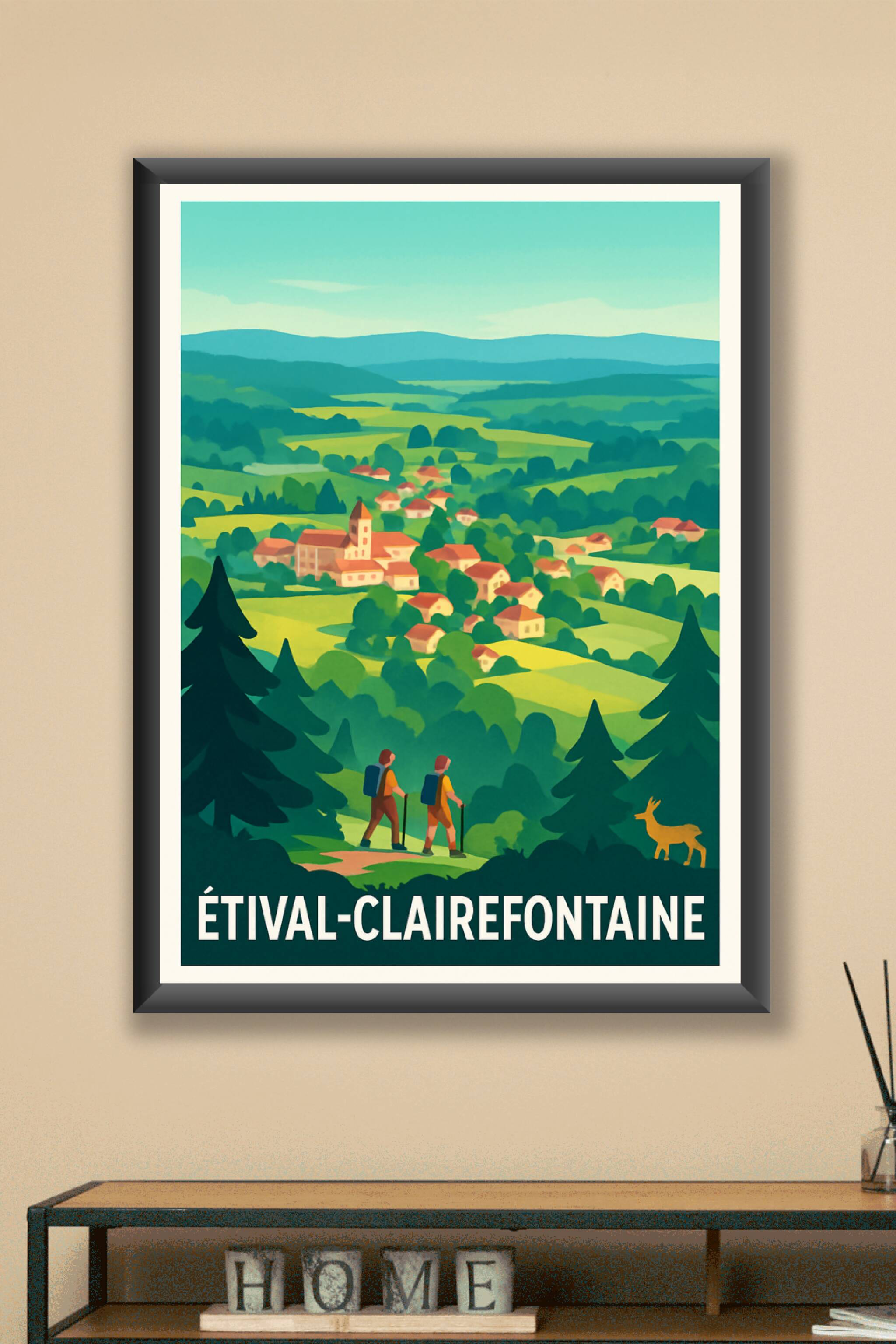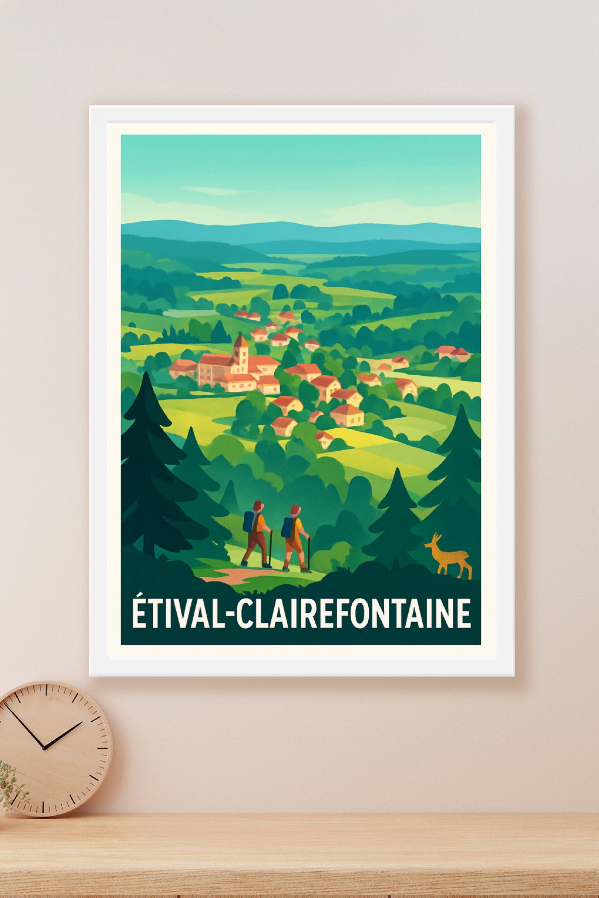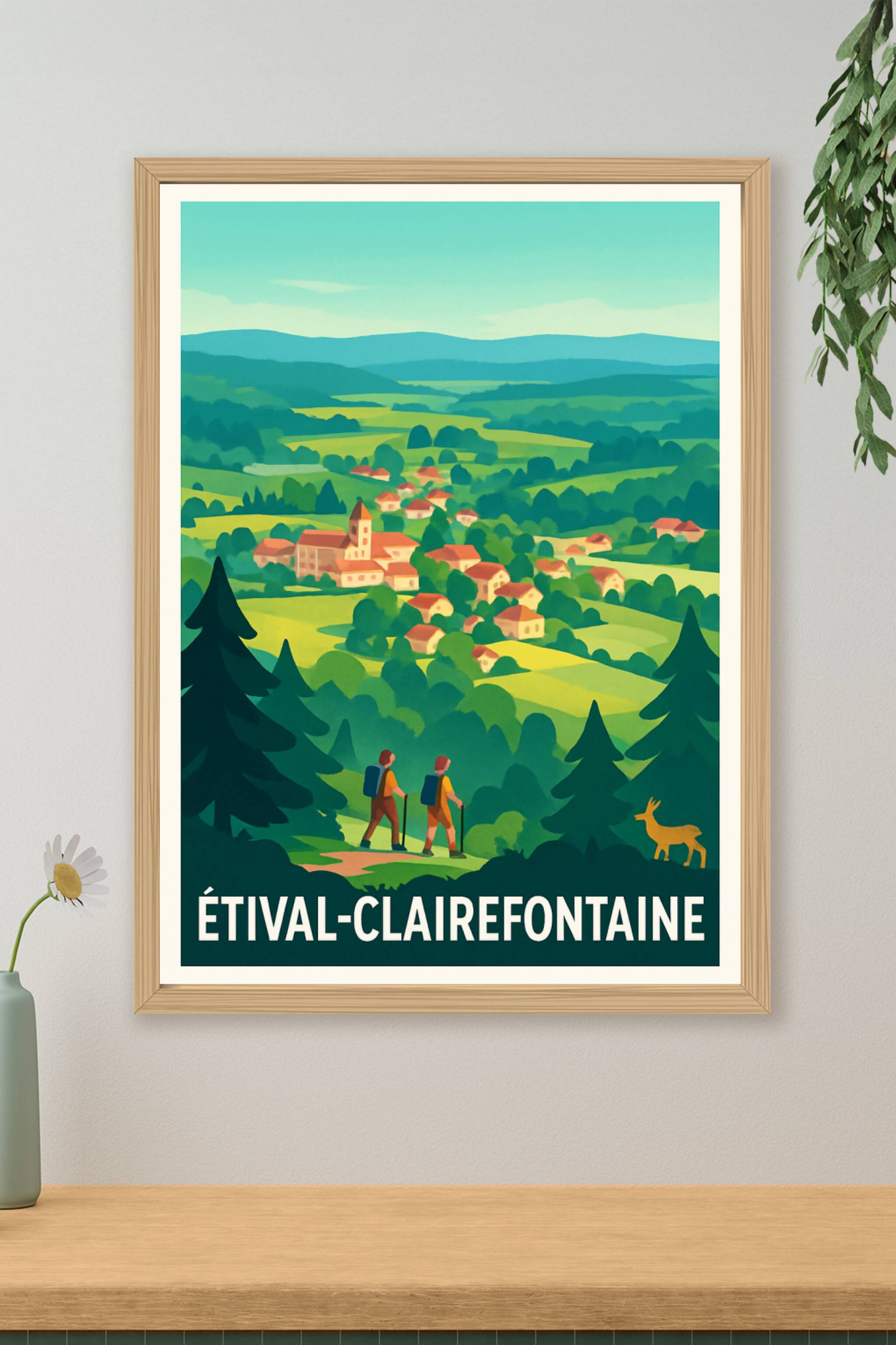 Découvrez la sérénité des paysages verdoyants d'Étival-Clairefontaine à travers cette affiche au style vintage et coloré. Représentant des randonne...