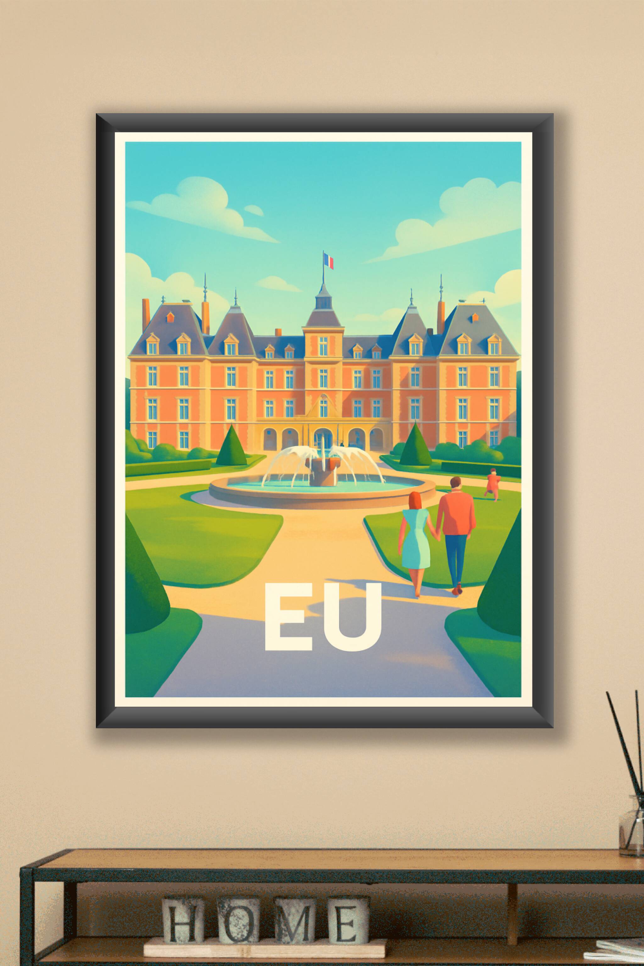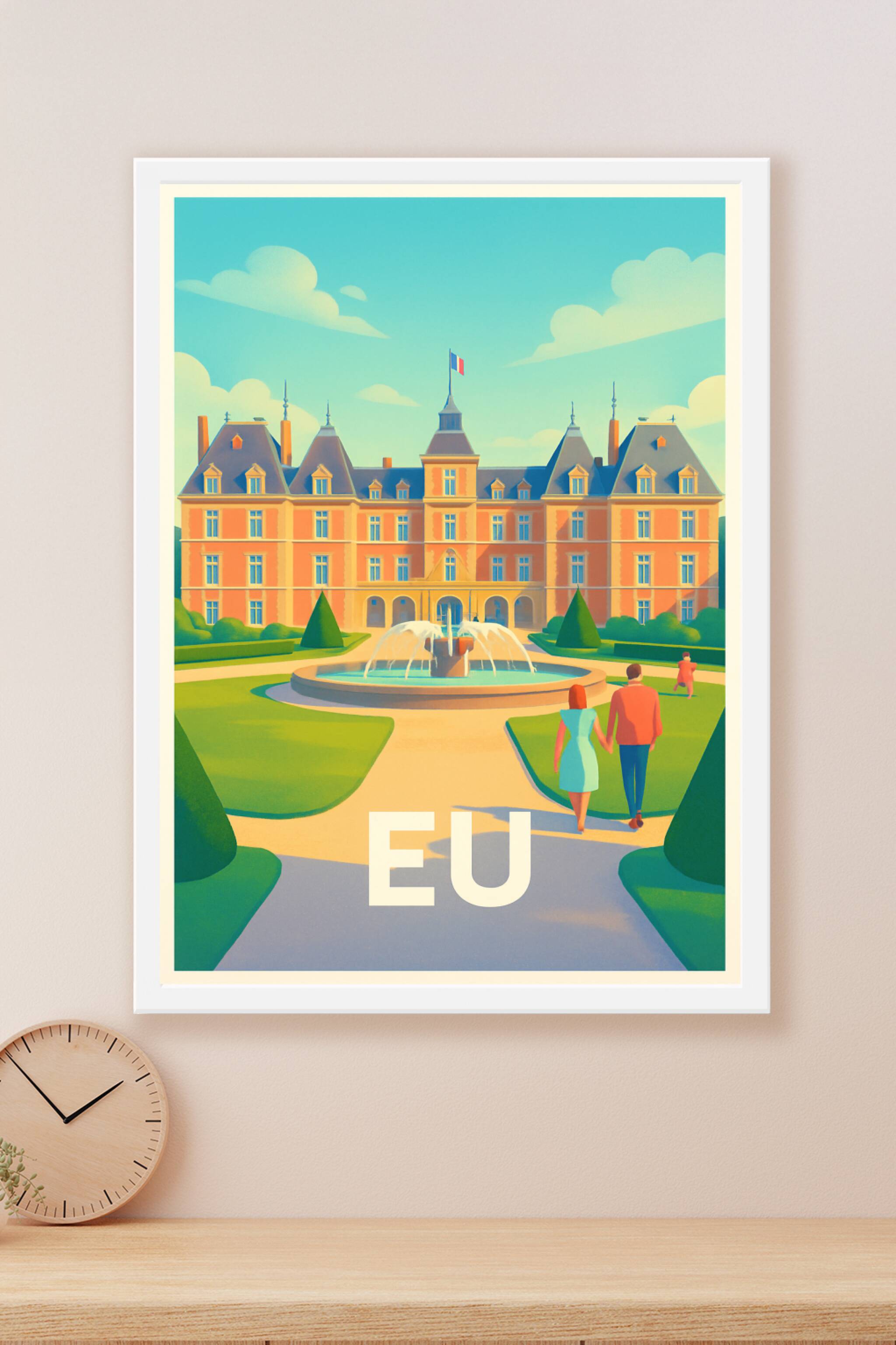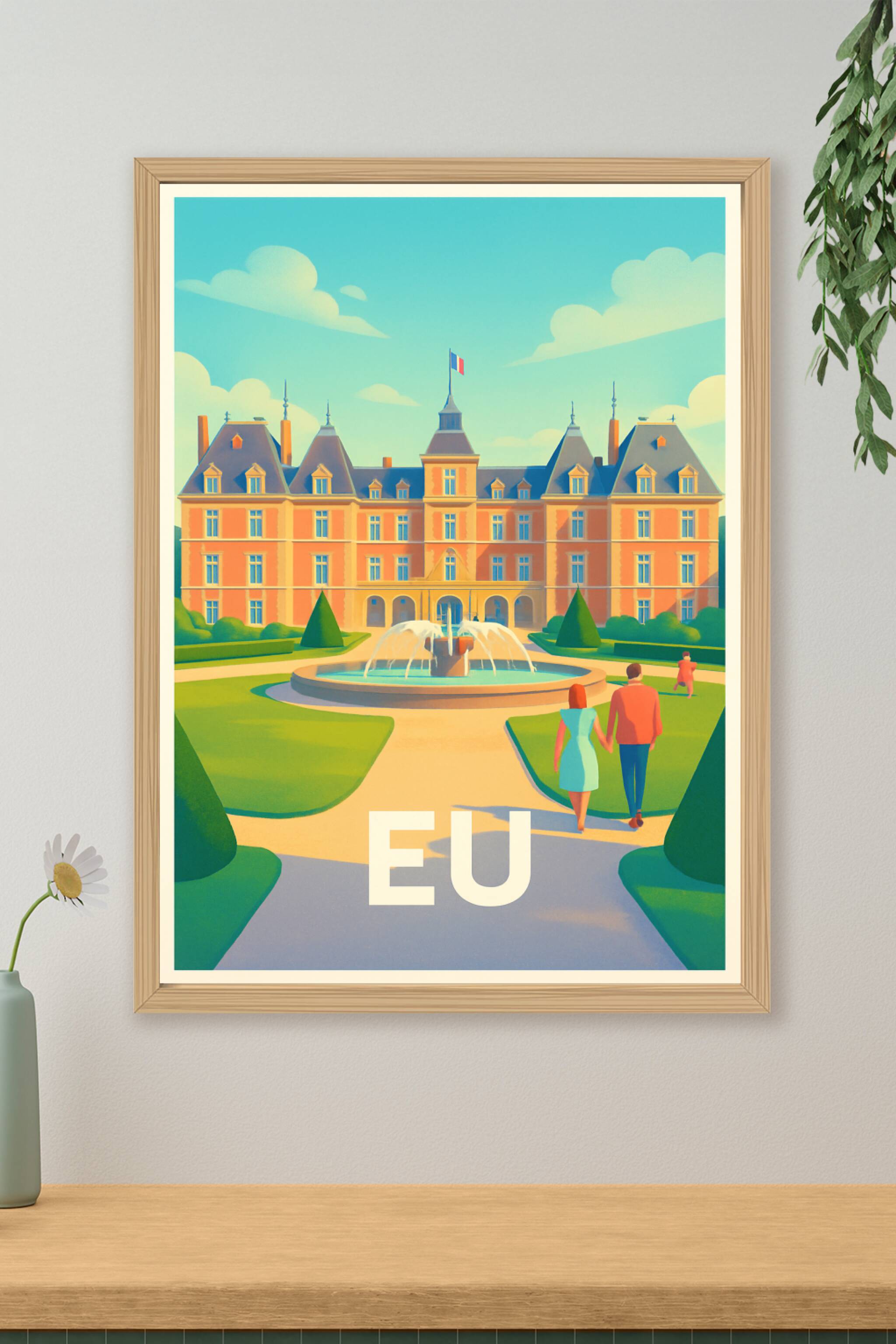 Découvrez cette magnifique affiche représentant le charme intemporel de la ville d'Eu en Normandie, avec son château impressionnant et ses jardins ...