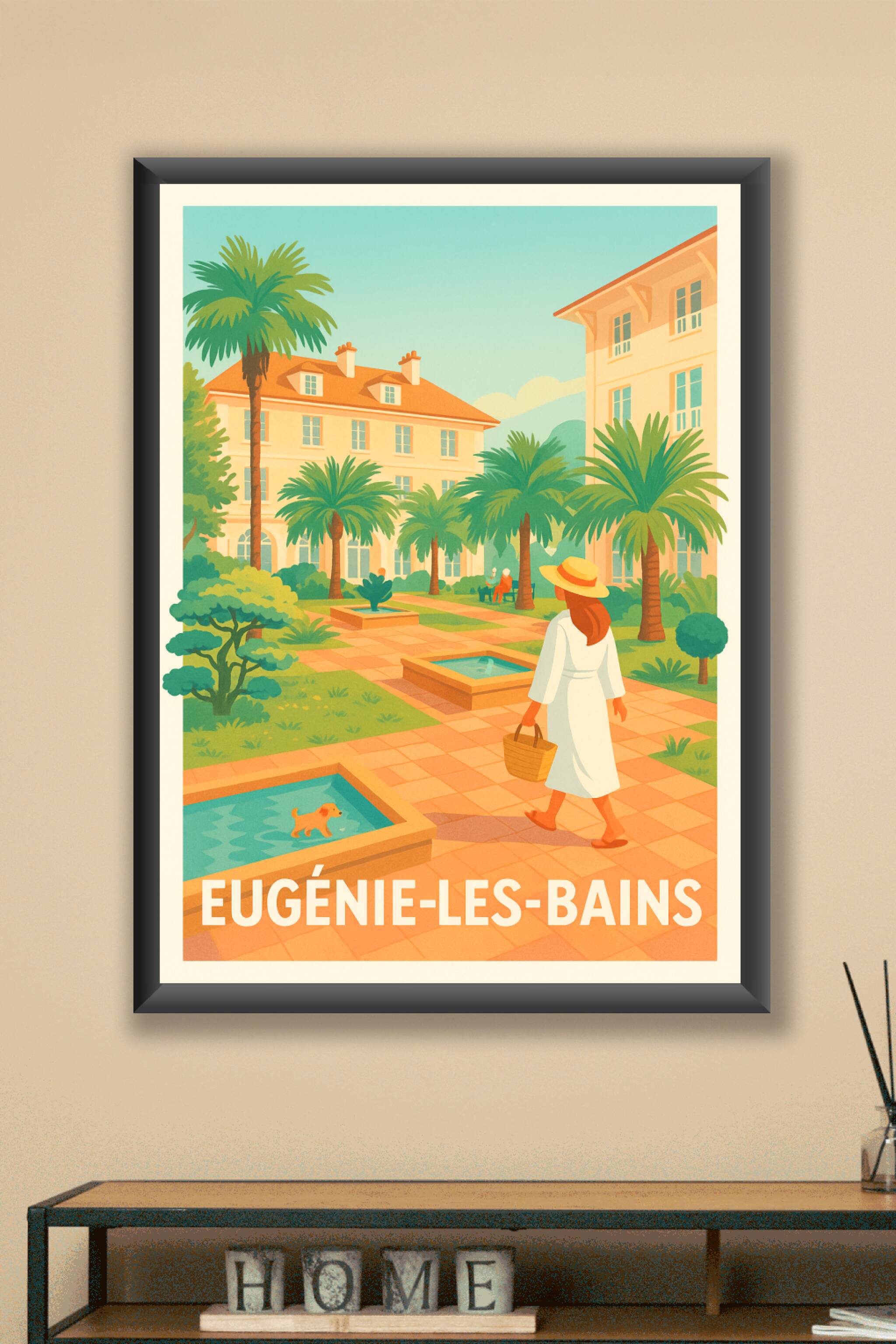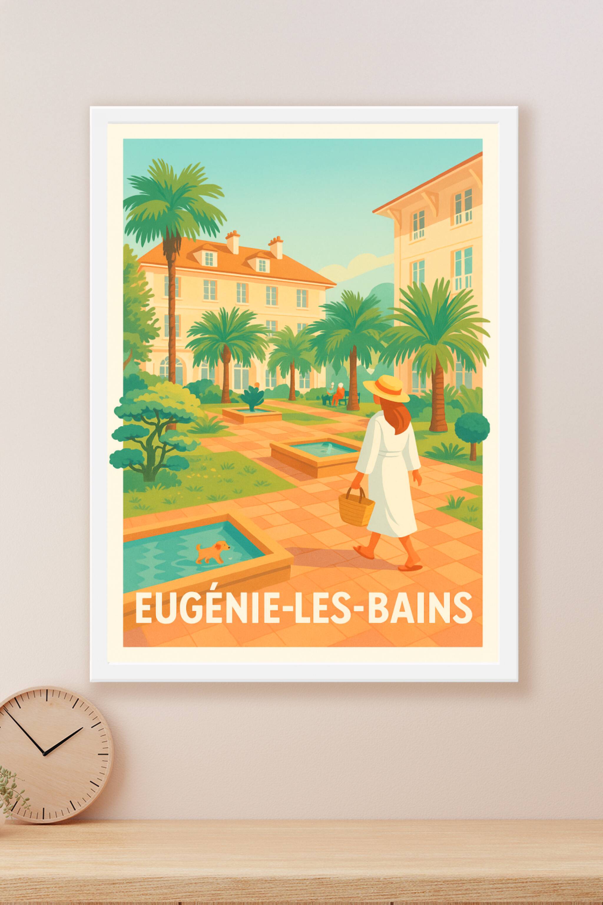 Découvrez la douceur de vivre à Eugénie-les-Bains avec cette affiche illustrée chaleureuse et lumineuse, qui met en scène une promenade paisible au...