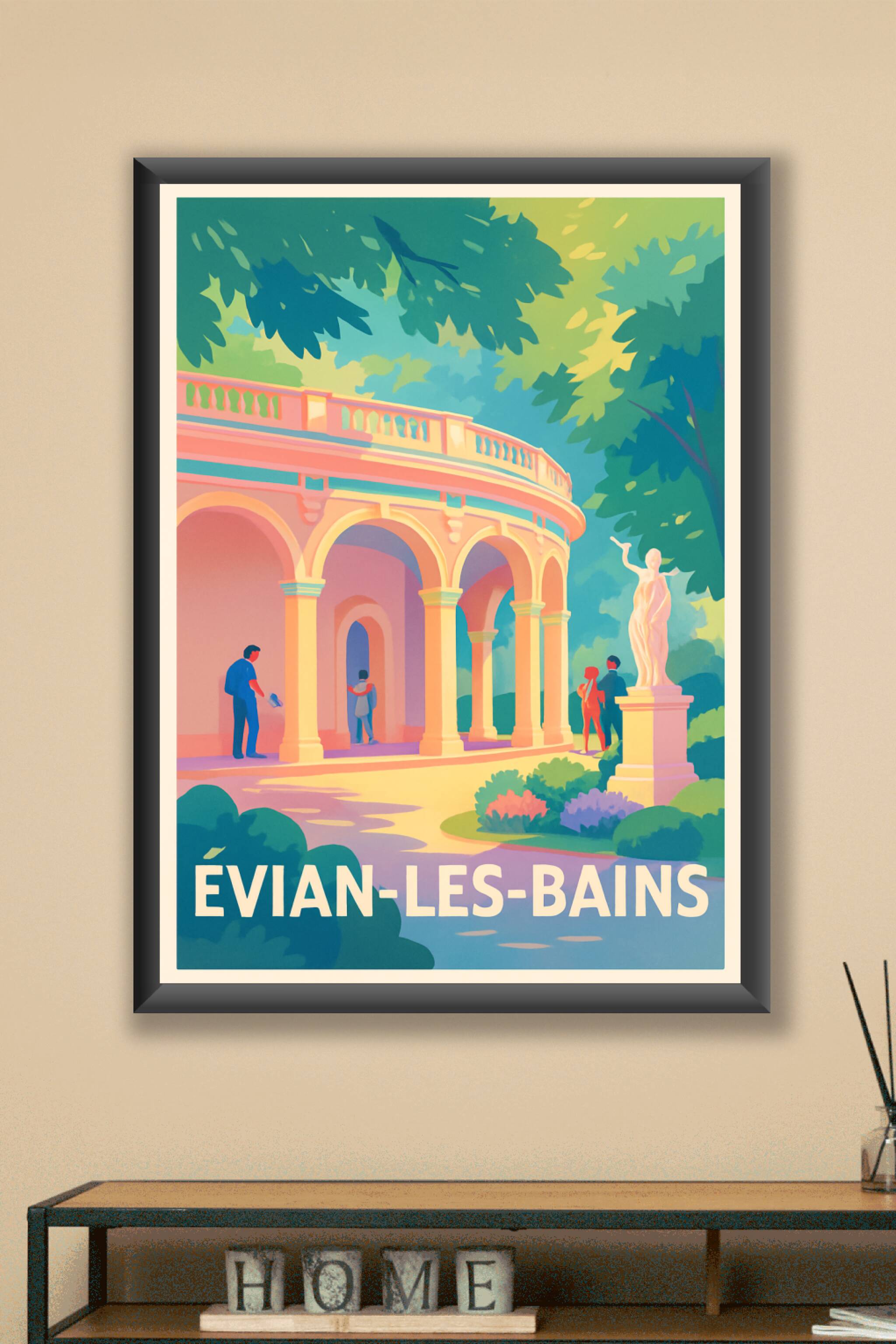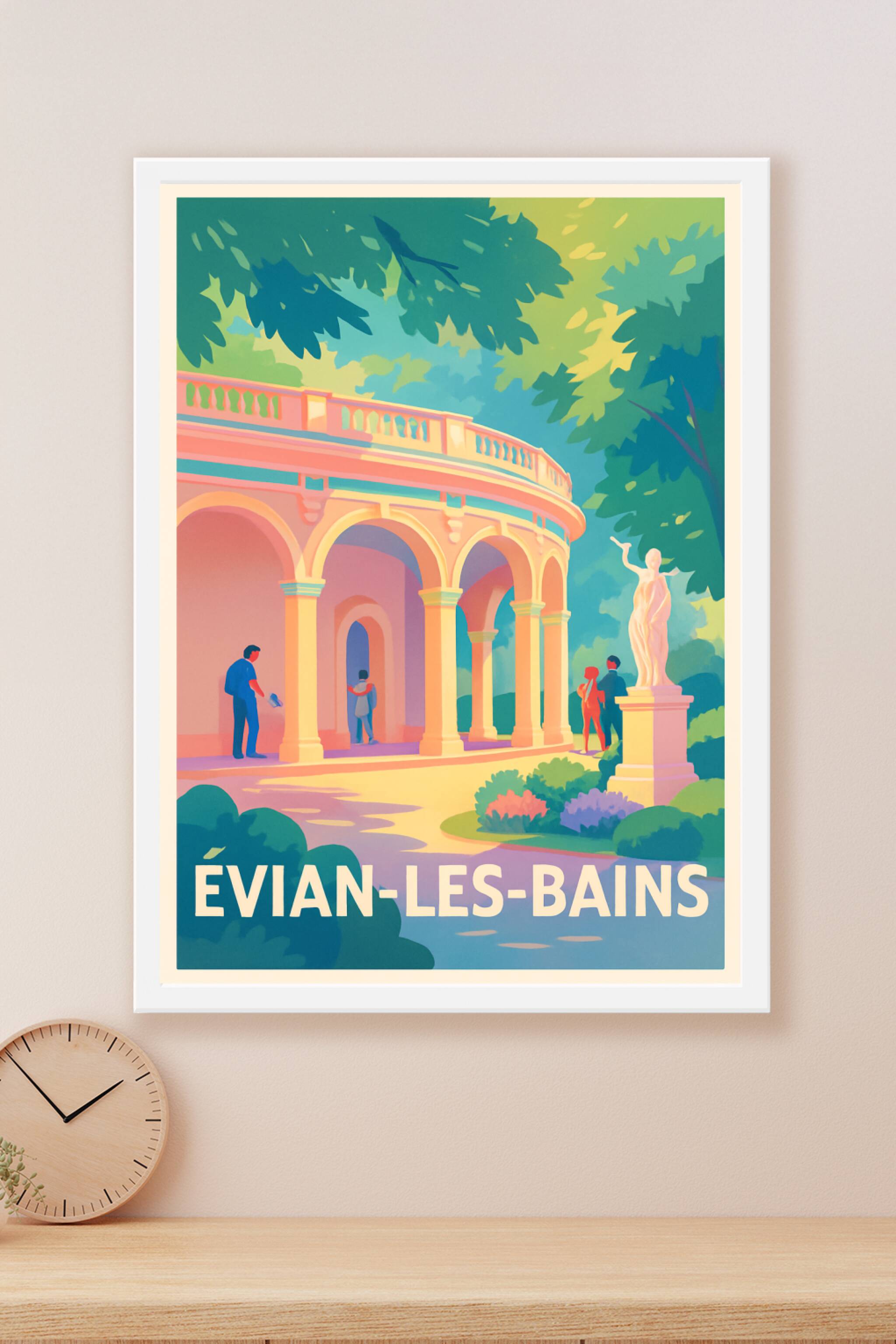 Découvrez l’élégance intemporelle d’Évian-les-Bains avec cette affiche au style vintage aux couleurs douces et lumineuses. Ce poster met en scène u...