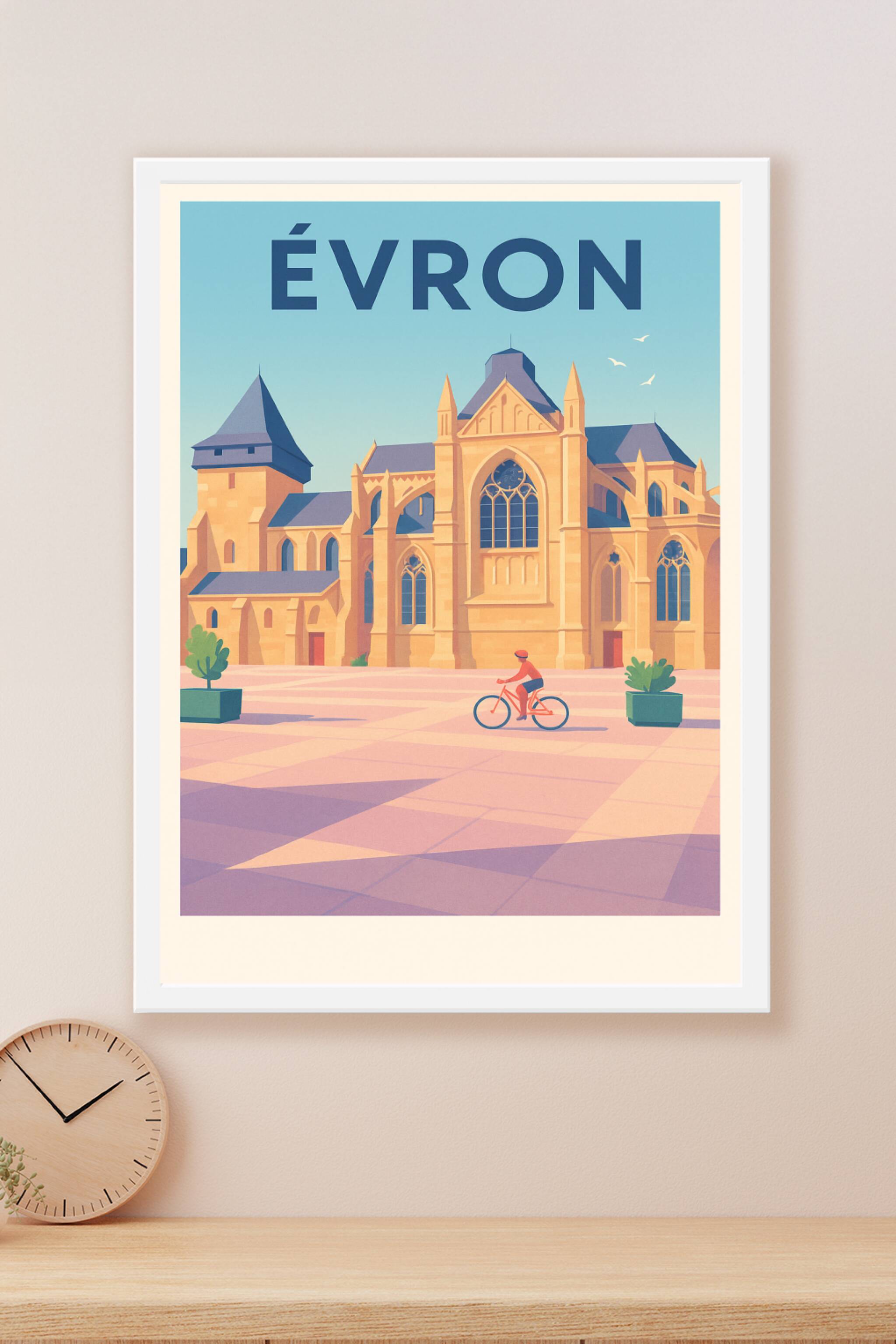 Découvrez l'élégance intemporelle d'Évron avec cette affiche illustrée qui met en lumière la majestueuse architecture de cette ville pleine de char...