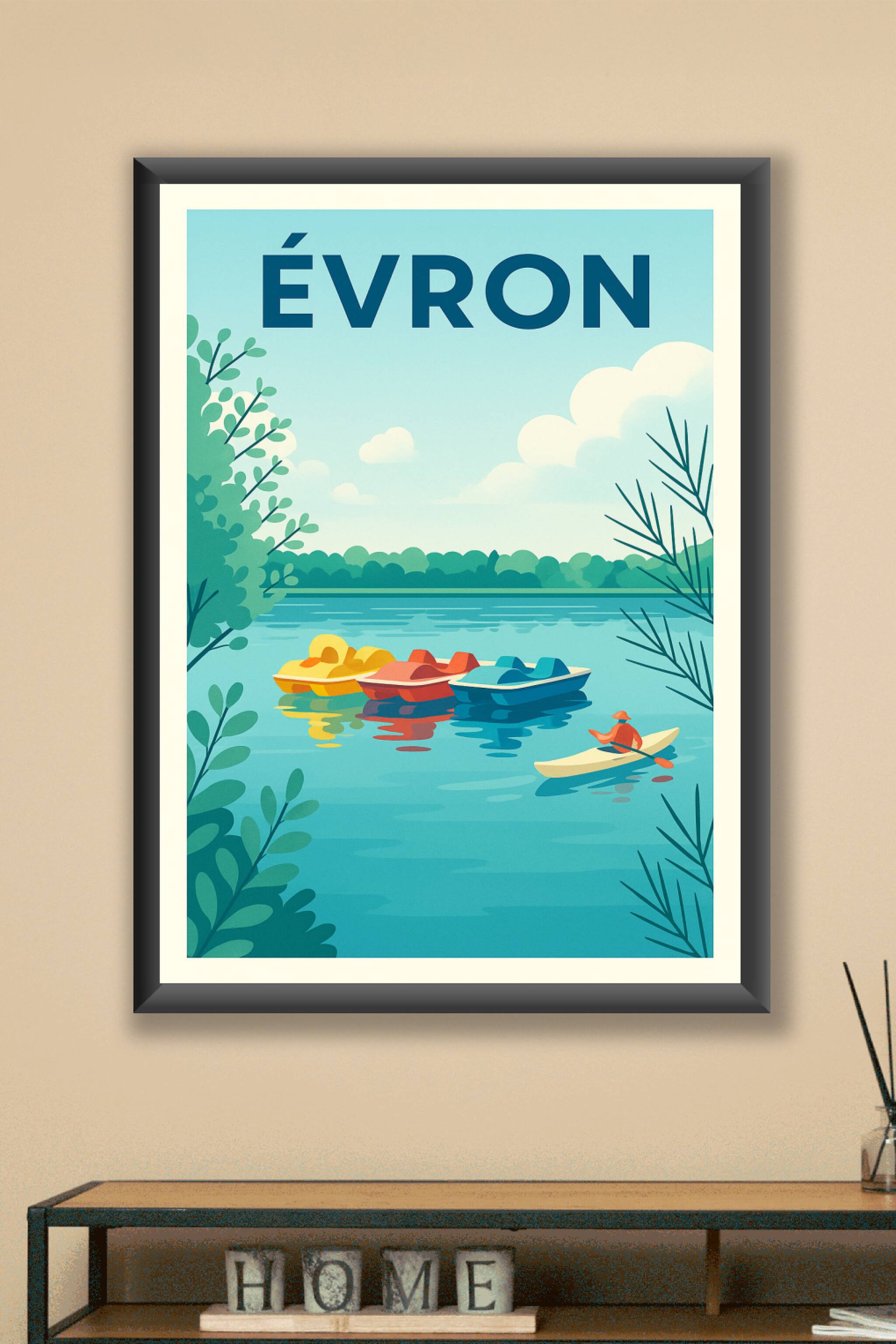 Découvrez la douceur de vivre à Évron avec cette affiche illustrée mettant en scène un paisible plan d'eau bordé de végétation luxuriante et des pé...