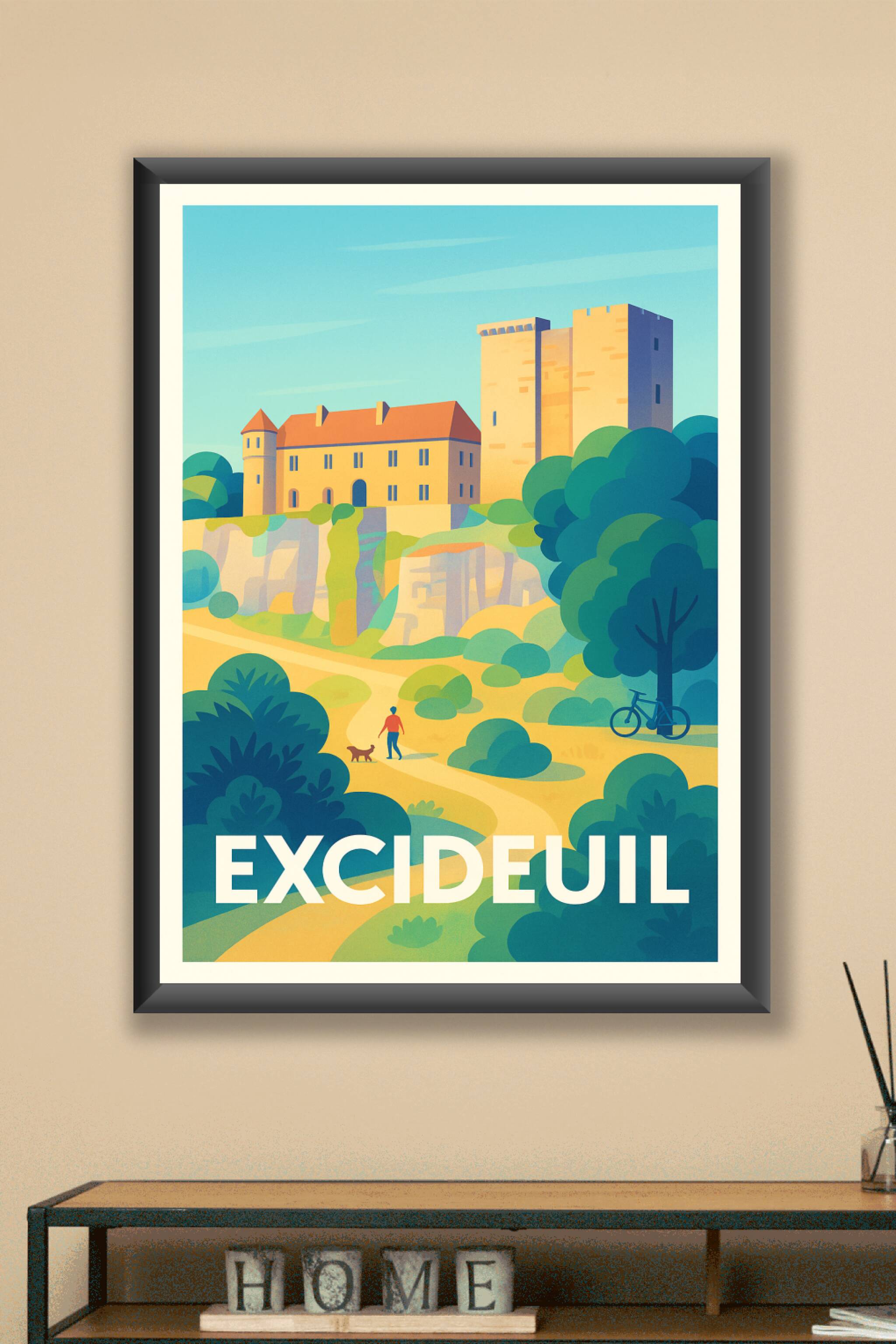 Découvrez la douceur de vivre en Périgord avec cette affiche illustrant le château d'Excideuil dans un style graphique lumineux et coloré. Ce poste...