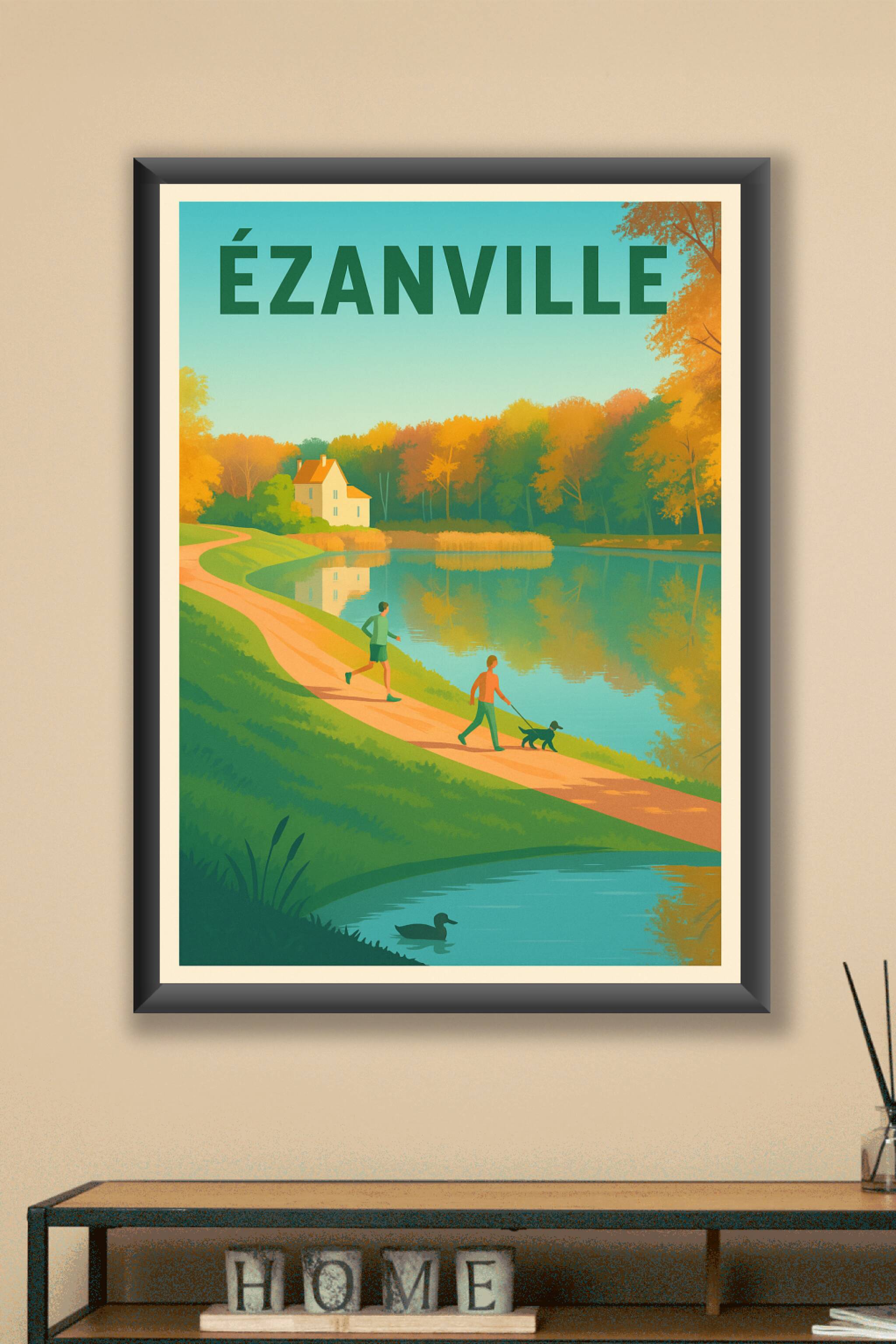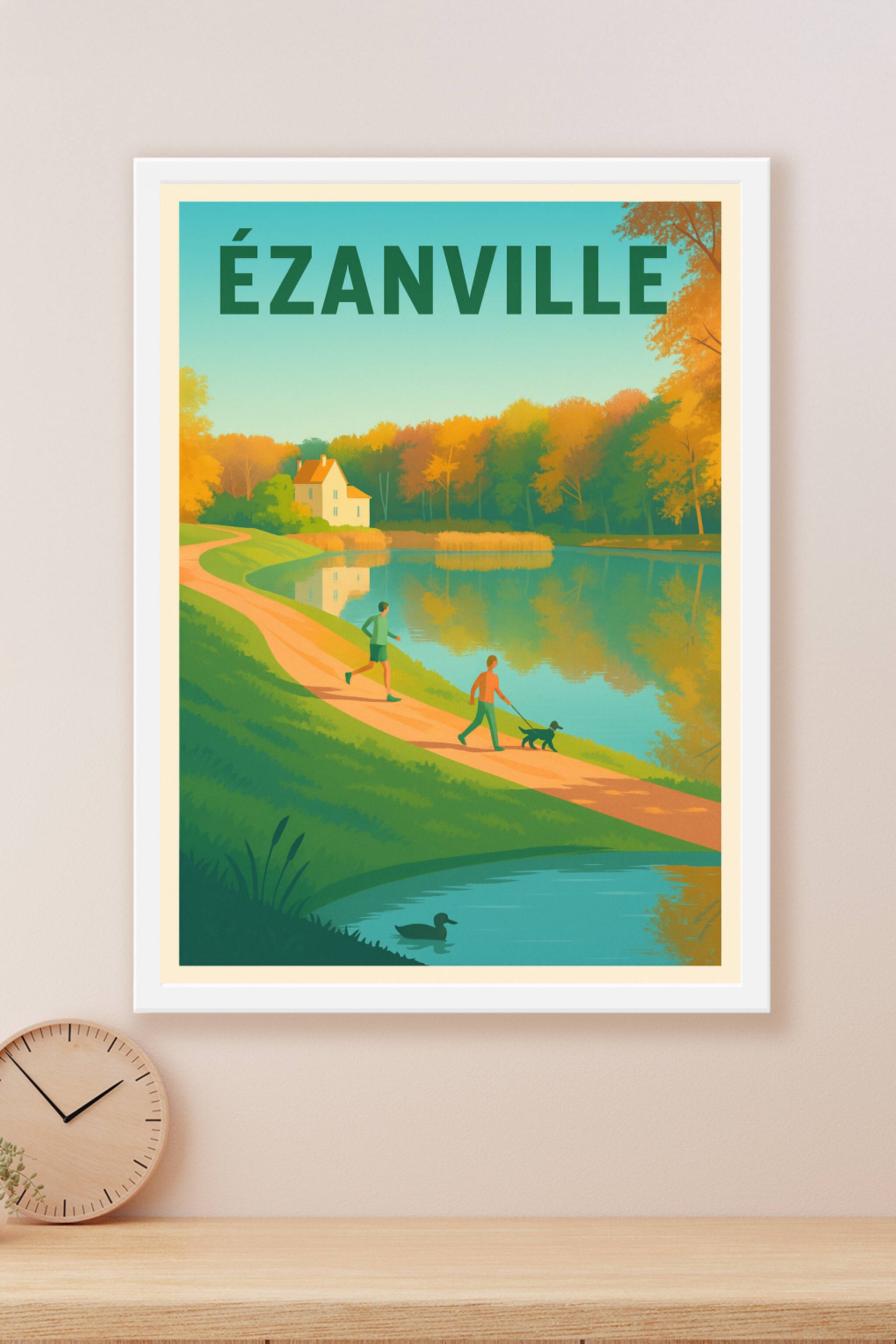 Découvrez la sérénité d'Ézanville avec cette affiche illustrée représentant une promenade paisible au bord d'un étang entouré d'arbres aux couleurs...