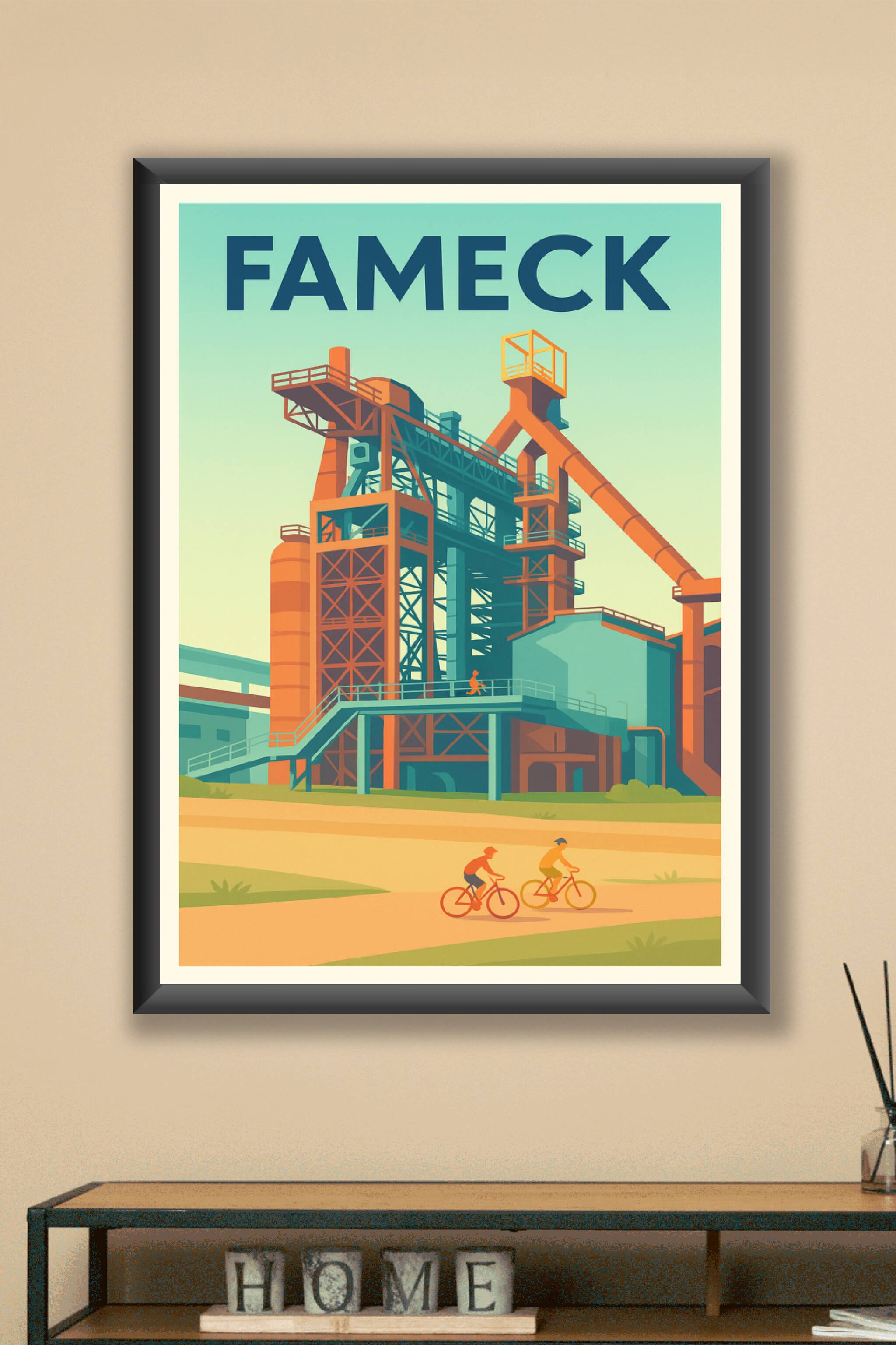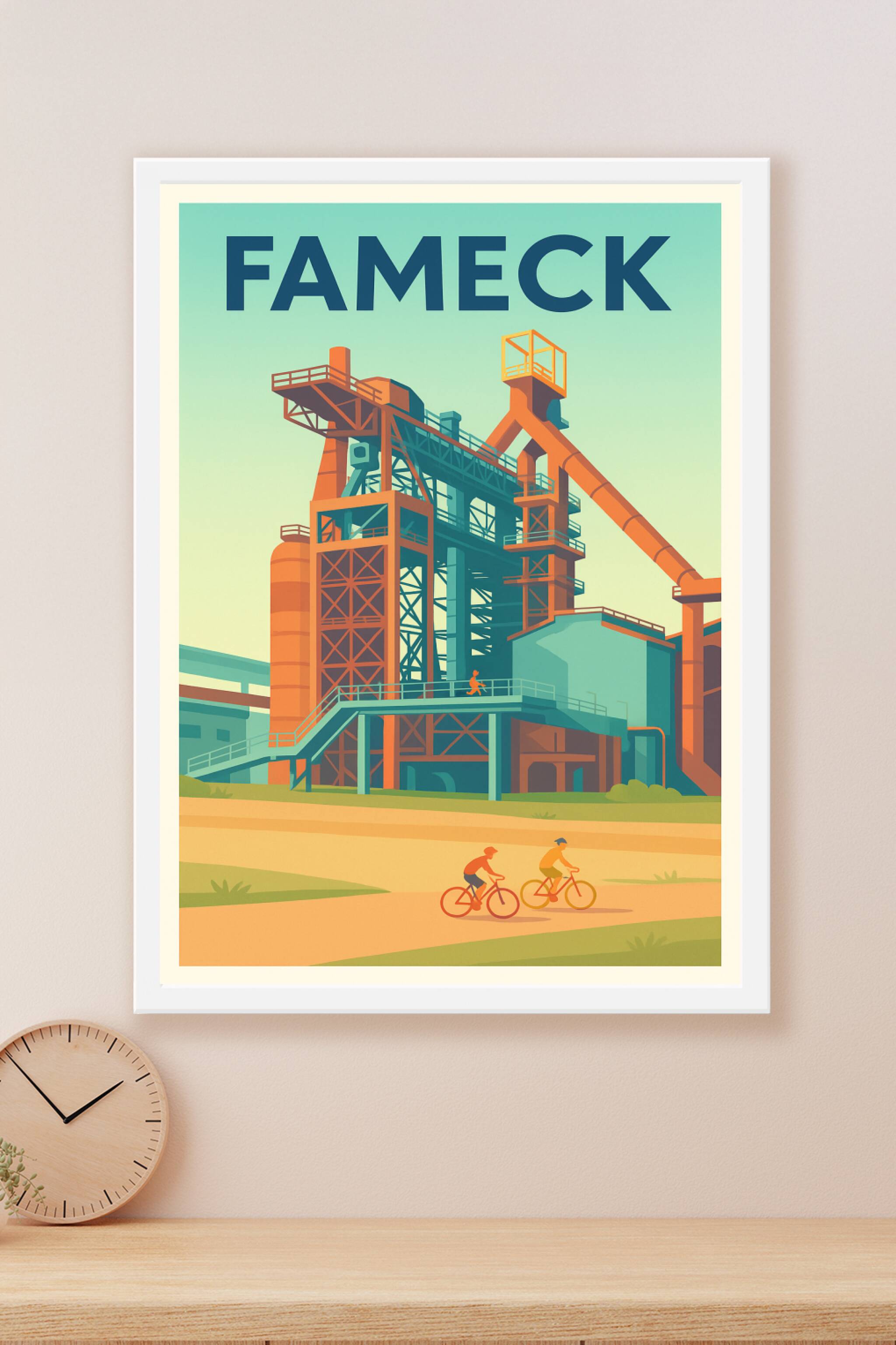 Découvrez Fameck à travers cette affiche illustrée qui met en lumière son héritage industriel tout en capturant une scène de détente avec deux cycl...