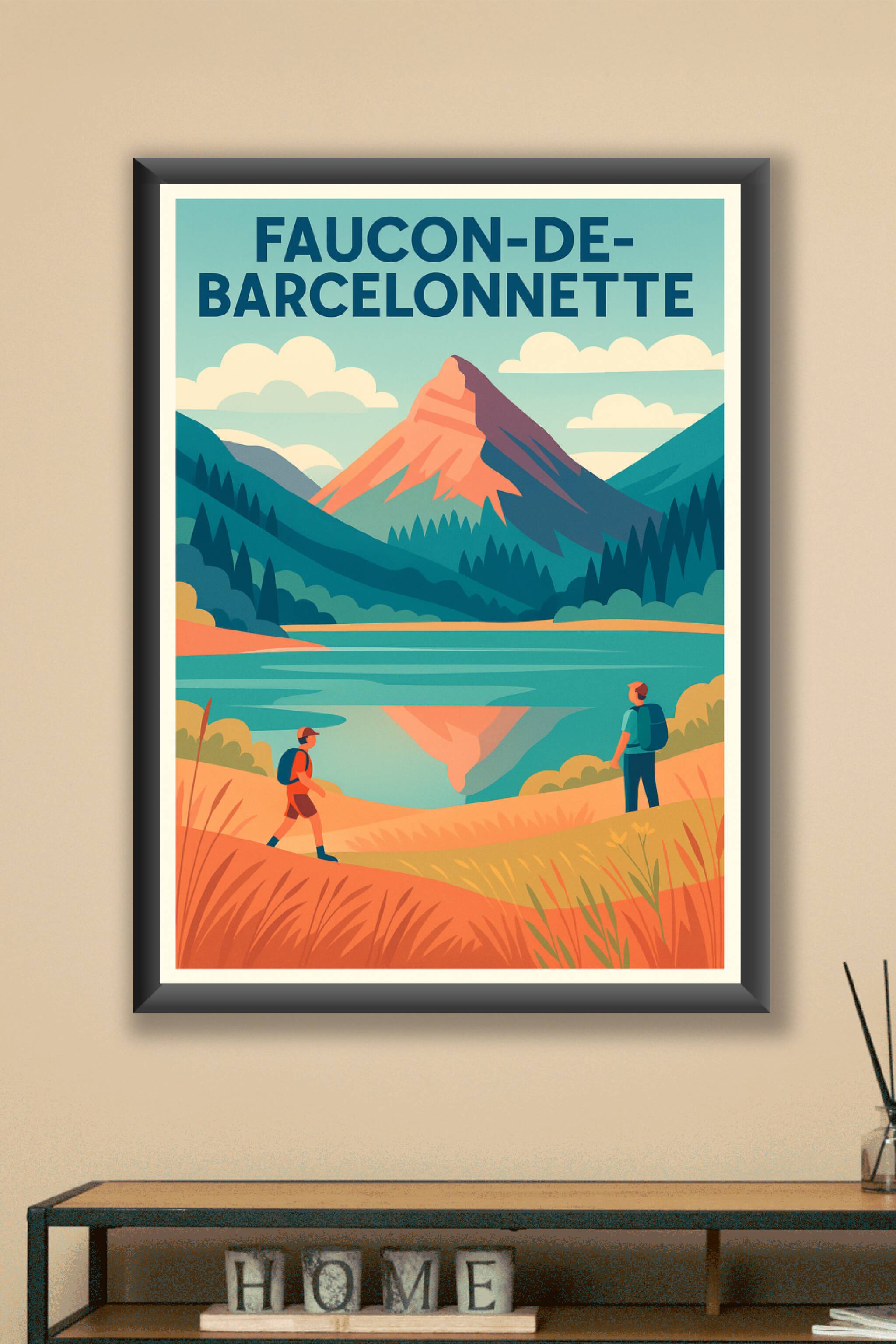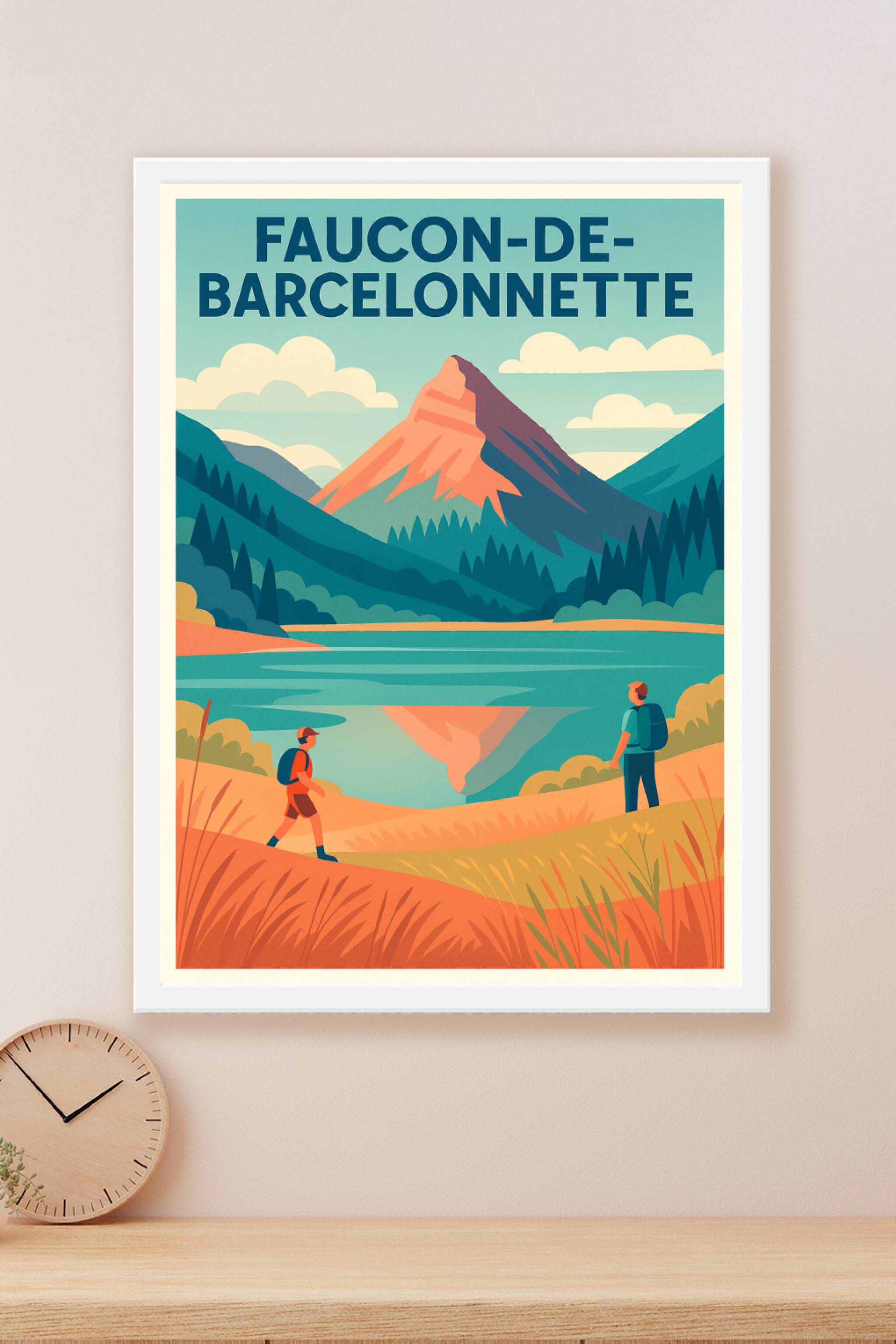 Découvrez la beauté naturelle et apaisante de Faucon-de-Barcelonnette avec cette affiche au style vintage et coloré, mettant en scène un paysage mo...