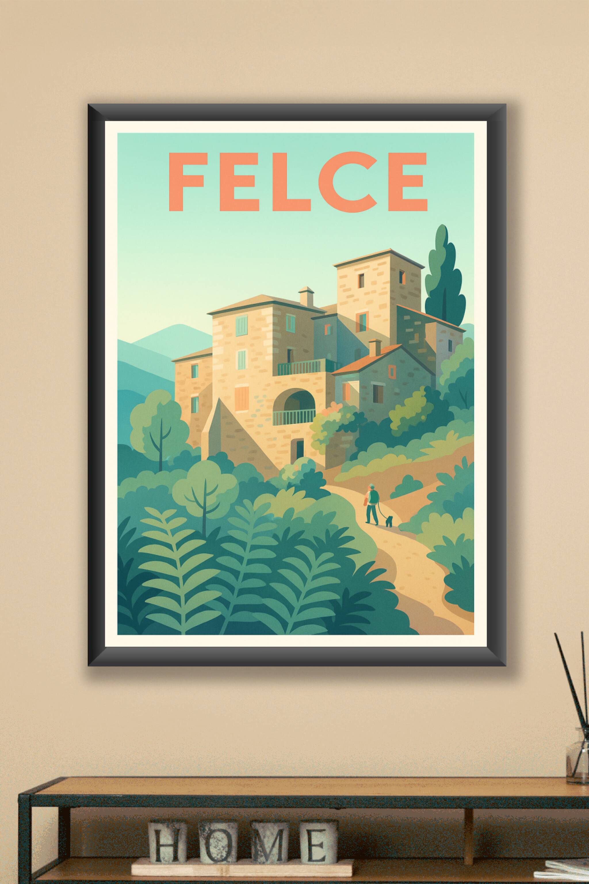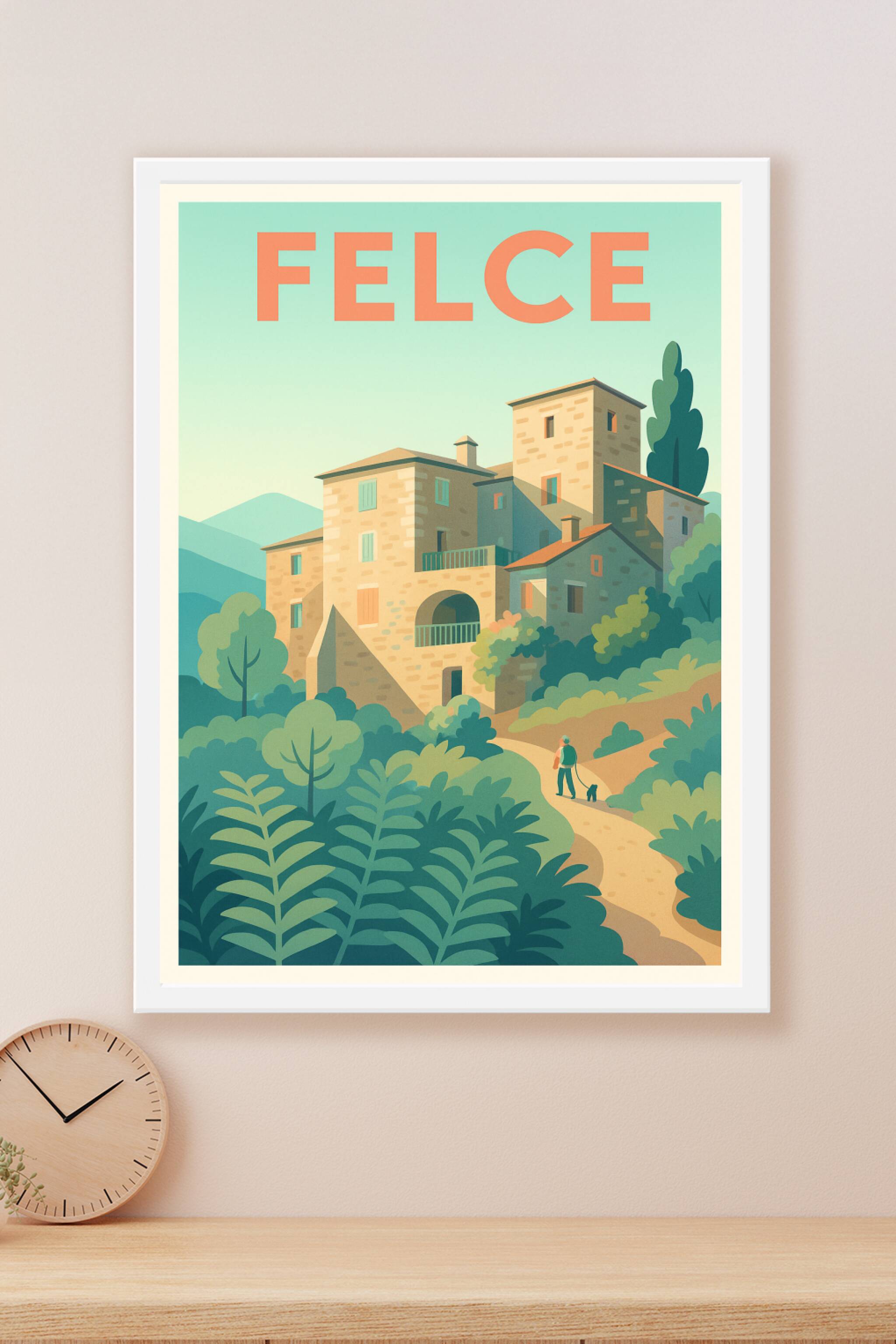 Découvrez la douceur de vivre à Felce grâce à cette affiche illustrée qui met en valeur une bâtisse typique entourée de végétation luxuriante. Ce p...