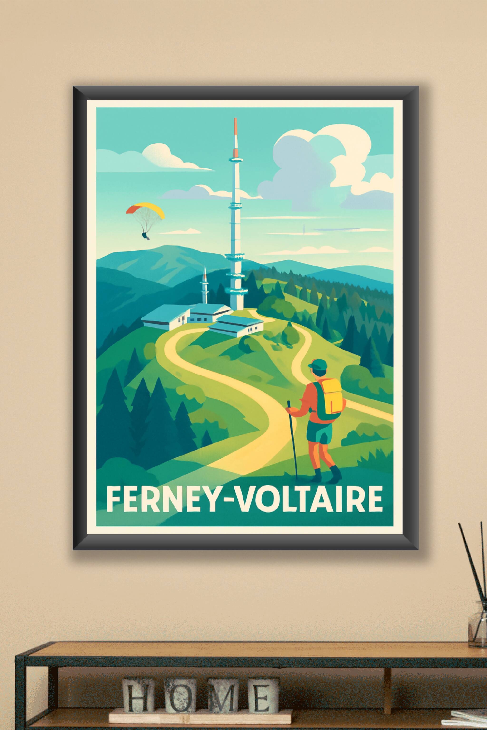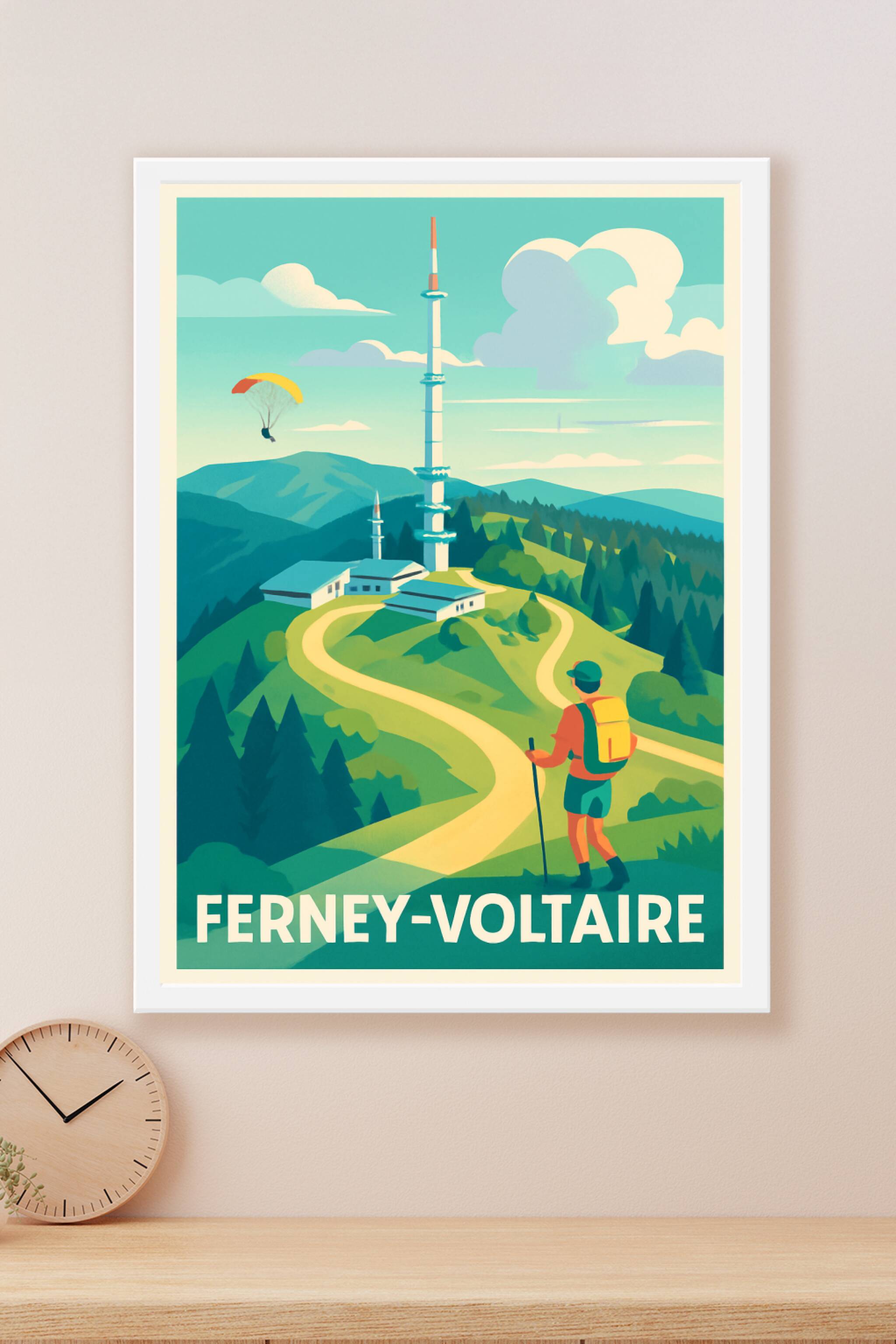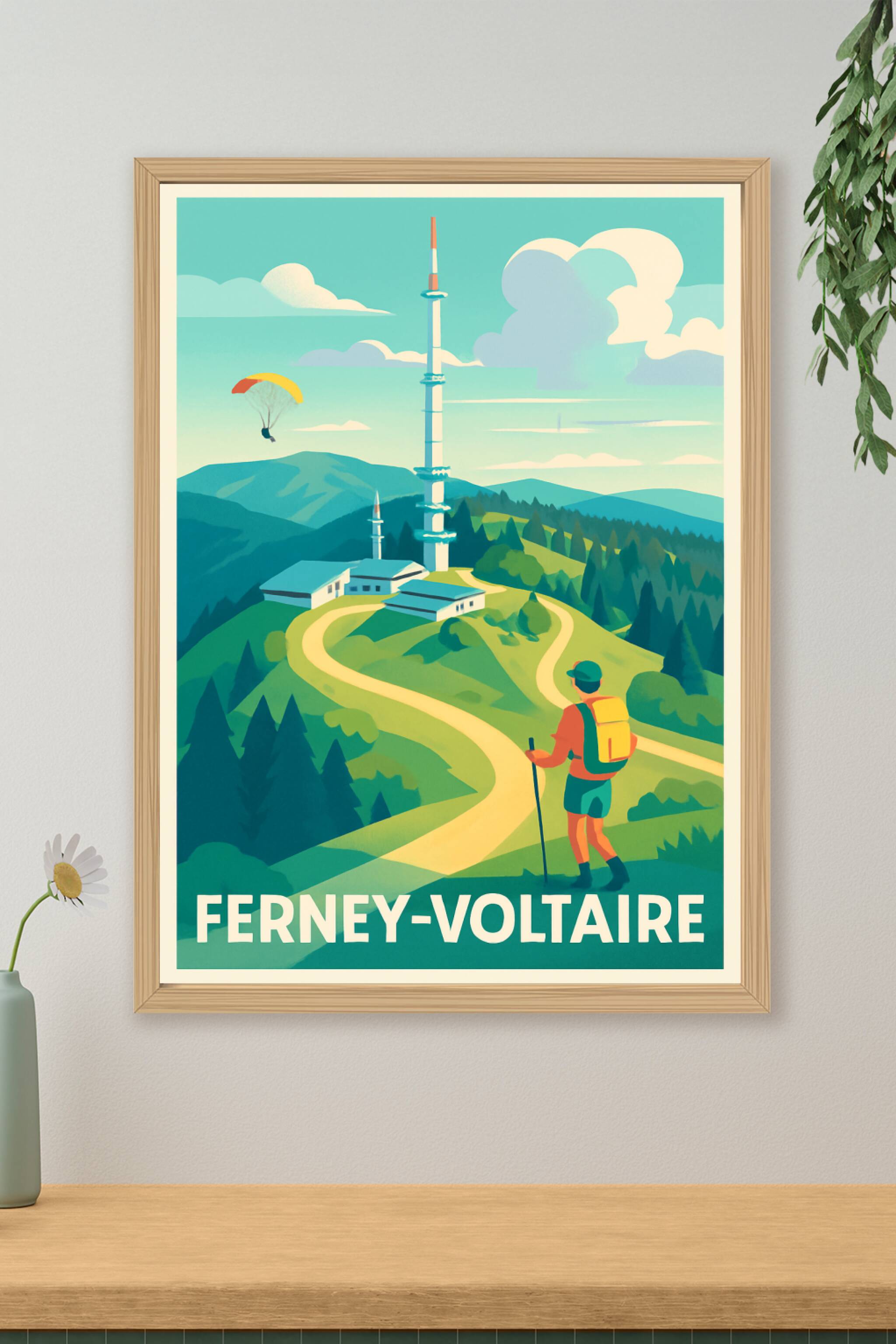 Découvrez le charme naturel et l'esprit d'aventure de Ferney-Voltaire avec cette affiche illustrée au style vintage et coloré. Le poster met en scè...
