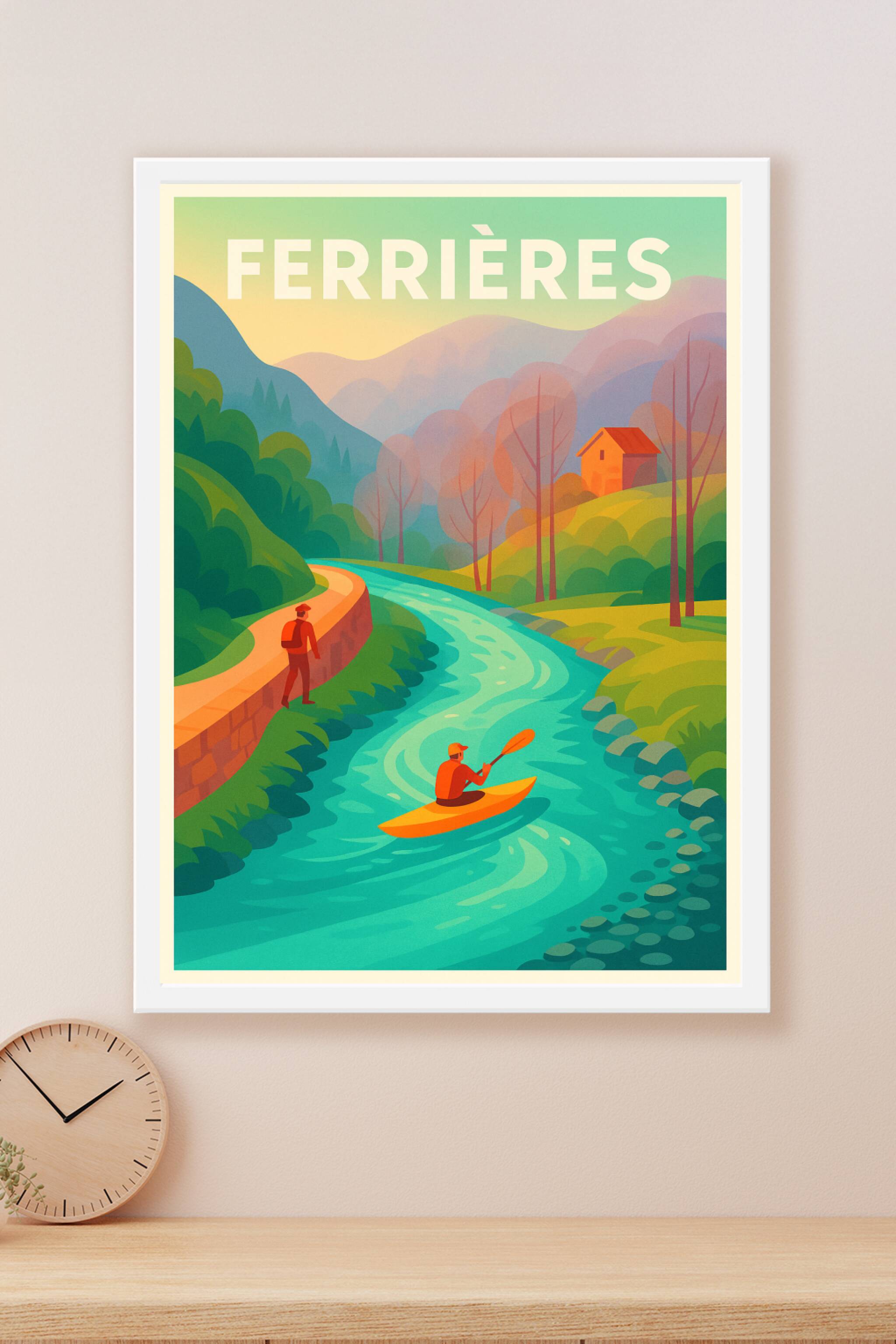 Découvrez la sérénité de Ferrières avec cette affiche illustrée, qui capture un paysage enchanteur entre rivière limpide et collines verdoyantes. Un kayakiste navigue paisiblement sur l'eau turquoise tandis qu'un randonneur chemine sur le sentier bordant la rive, sous un ciel doux aux tons pastel.Sublimez votre décoration intérieure avec ce poster imprimé en tirage "Fine Art" sur papier 305g coton, garantissant une qualité d'impression exceptionnelle et des couleurs éclatantes. Disponible en formats A1 à A4, avec ou sans cadre, cette affiche apporte une touche de nature et de calme à votre intérieur ou constitue un cadeau idéal pour les amoureux de la nature et des activités en plein air.