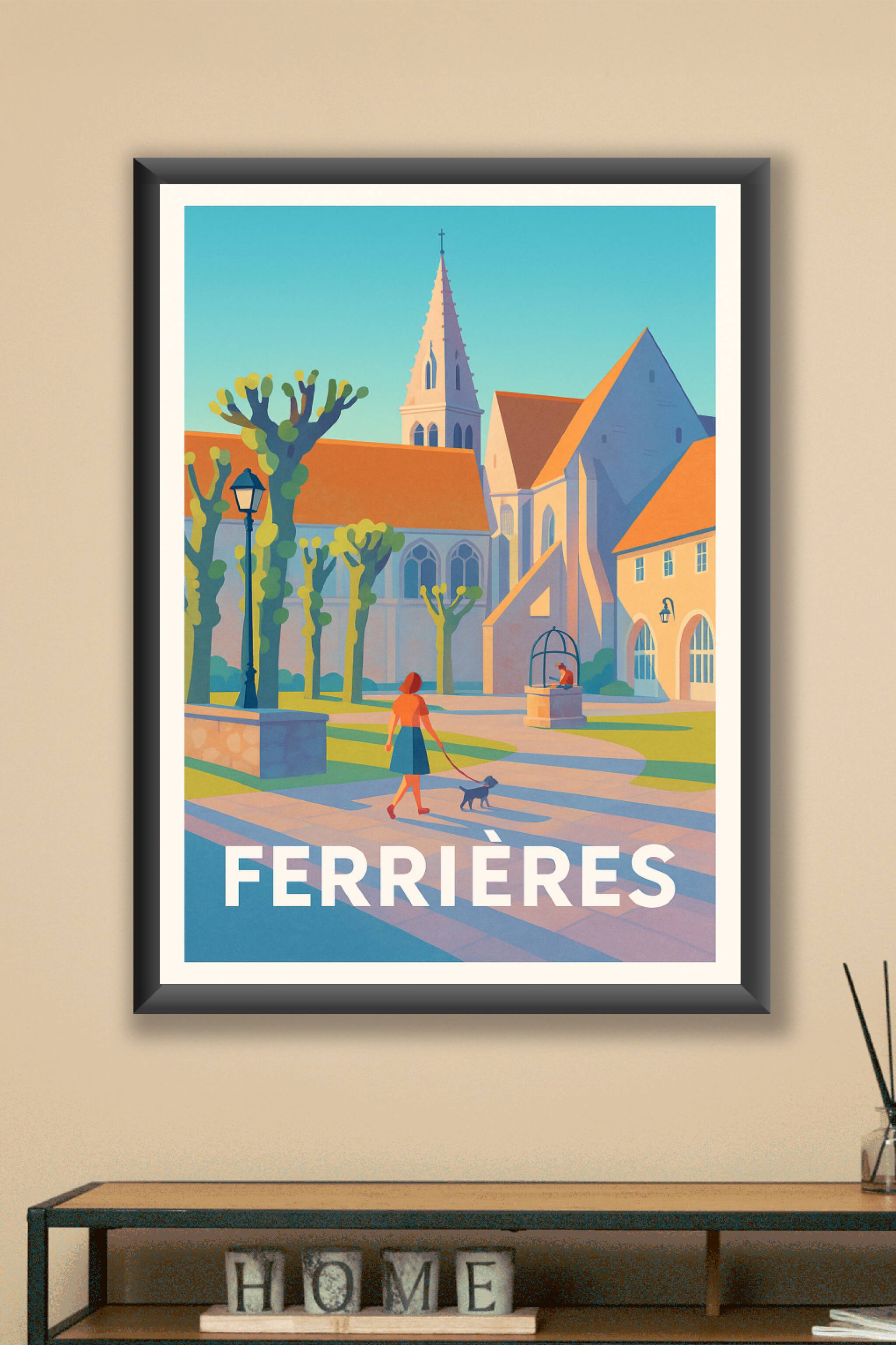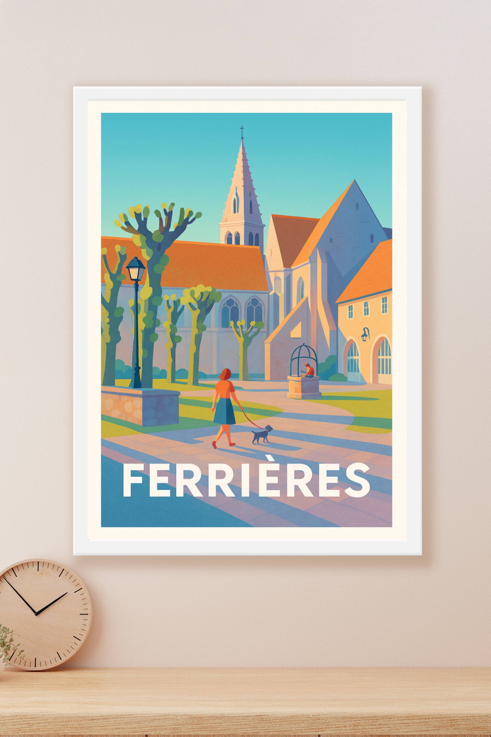 Découvrez la douceur de vivre à Ferrières avec ce poster illustré dans un style vintage et chaleureux. L'affiche met en scène une promenade tranqui...