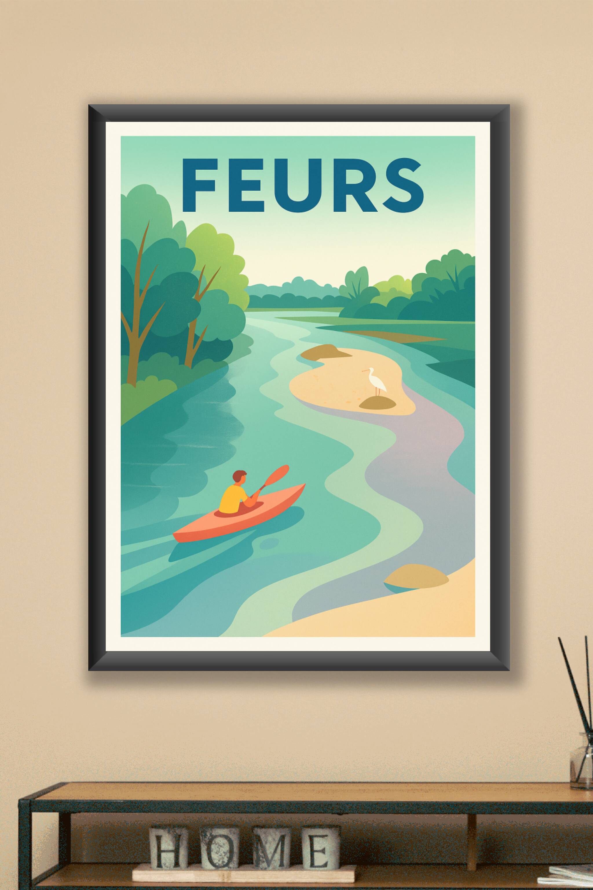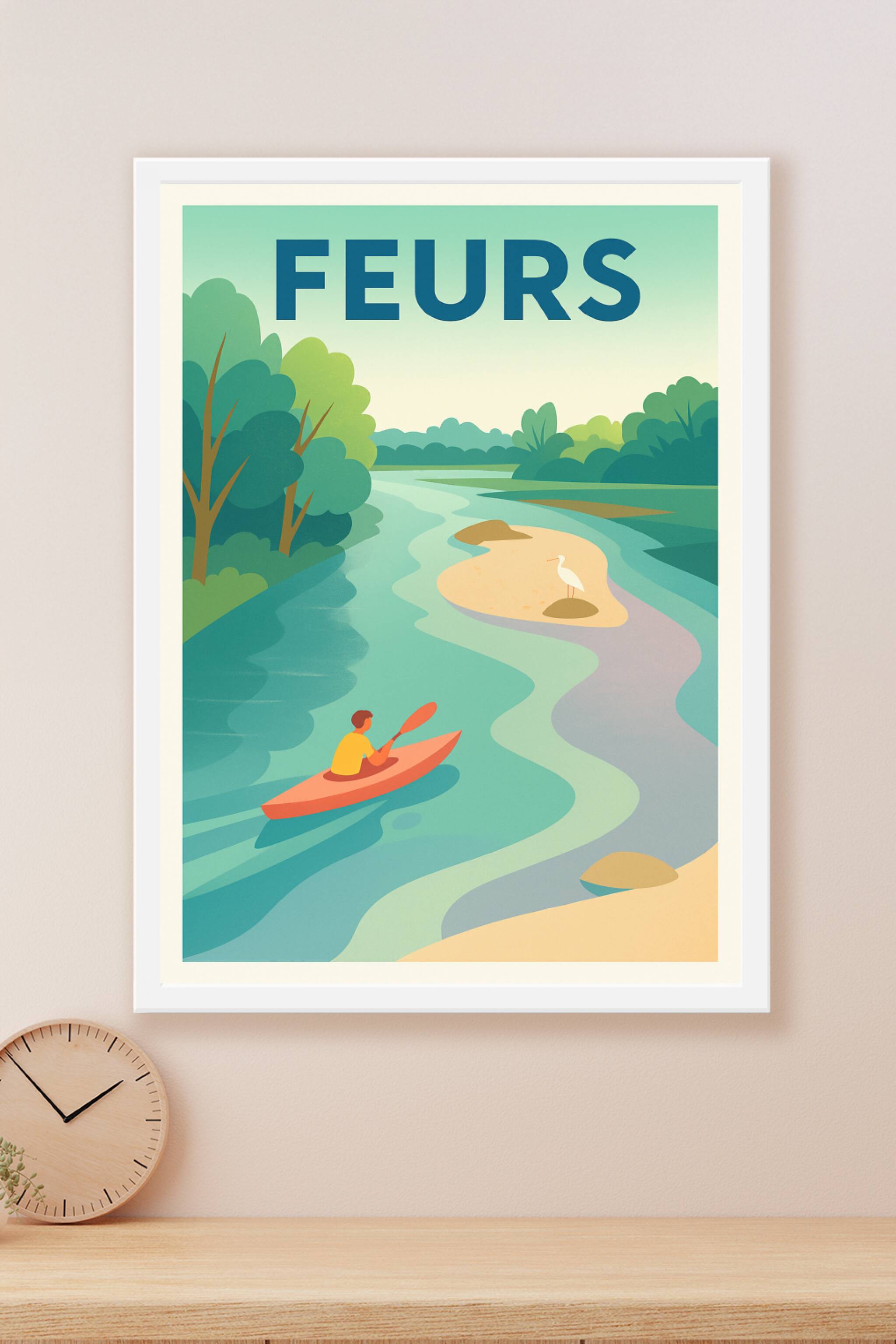 Découvrez la sérénité de Feurs avec cette affiche illustrant une promenade en kayak sur une rivière paisible, entourée de végétation luxuriante et ...