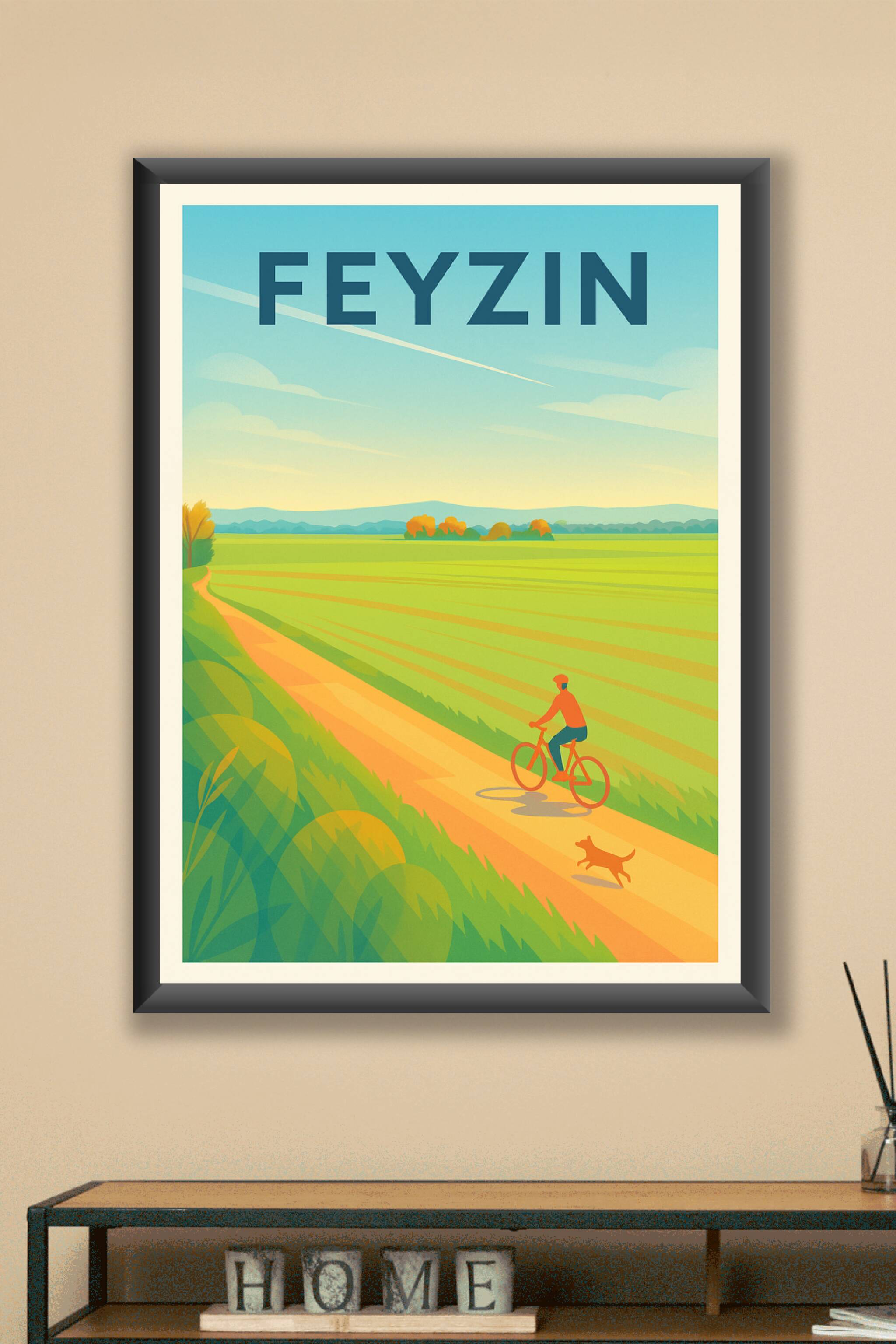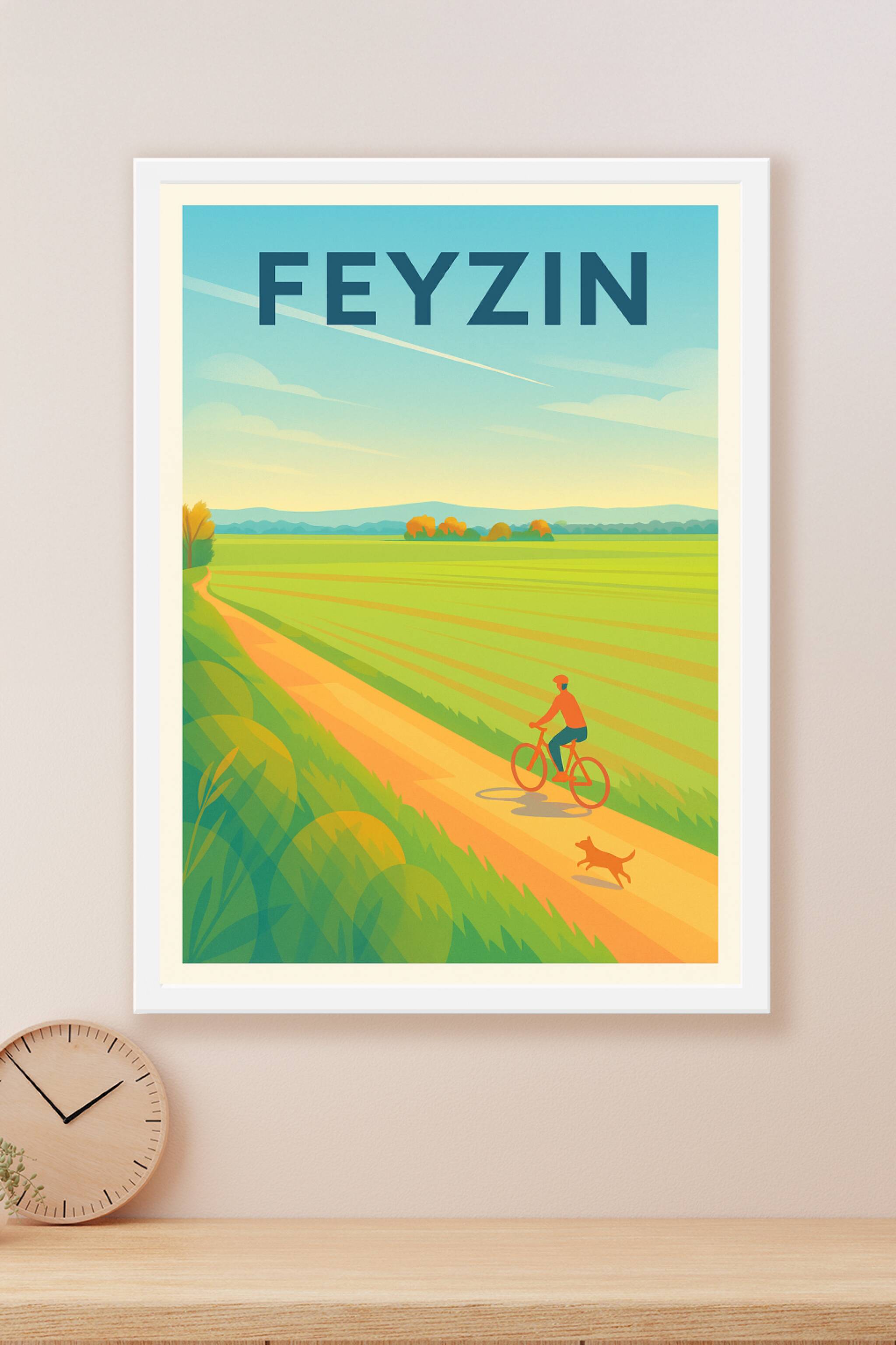 Découvrez la sérénité des paysages verdoyants de Feyzin avec cette affiche illustrée au style moderne et lumineux. Une route de campagne paisible où un cycliste et son chien profitent d'une belle journée, invitant à l'évasion et au calme. Ce poster est imprimé en tirage "Fine Art" sur papier coton 305g pour une qualité d'impression exceptionnelle et des couleurs éclatantes. Disponible en formats A1 à A4, avec ou sans cadre, cette affiche apportera une touche de nature apaisante à votre intérieur. Profitez d'un produit 100% fabriqué en France, idéal pour décorer ou offrir en souvenir de cette belle région.